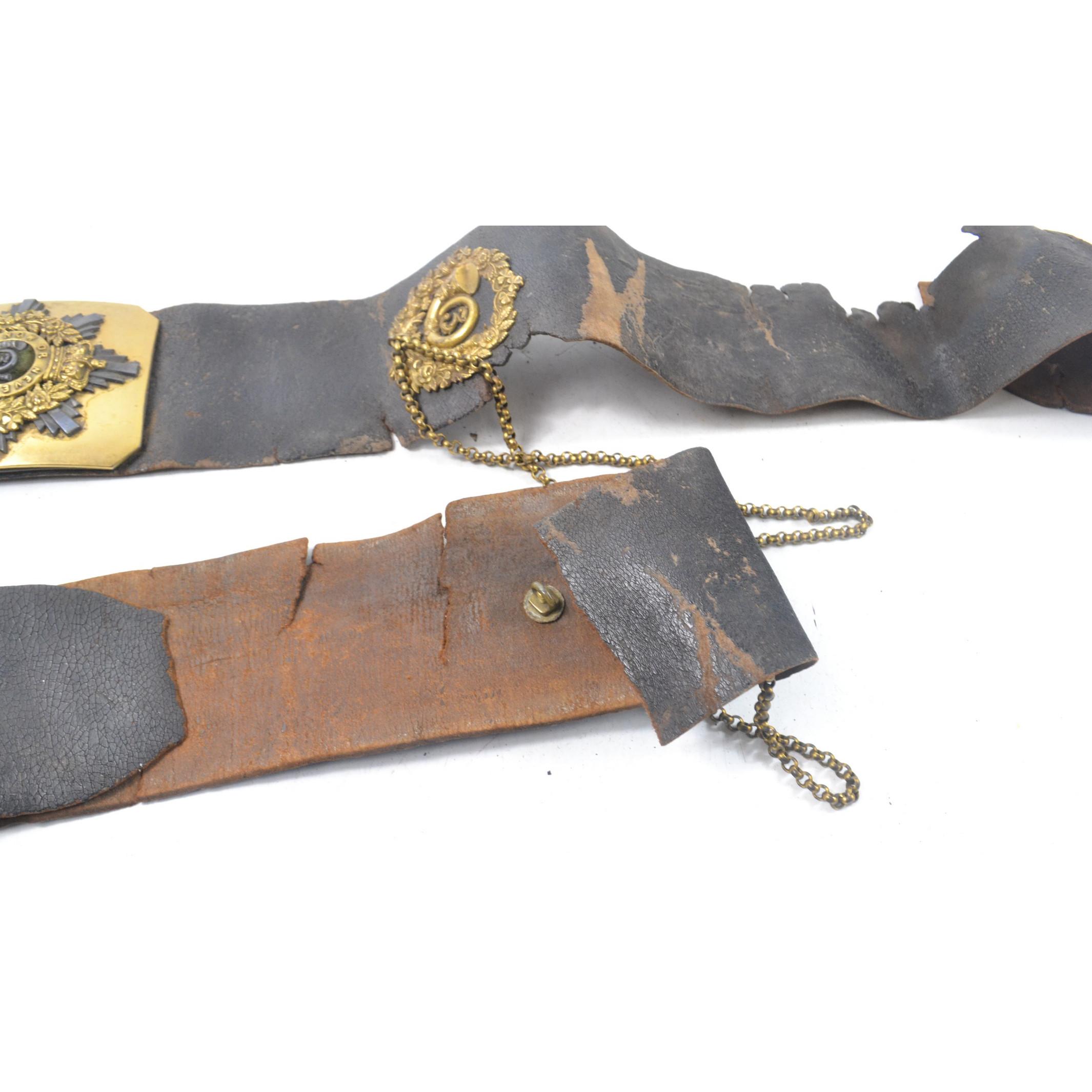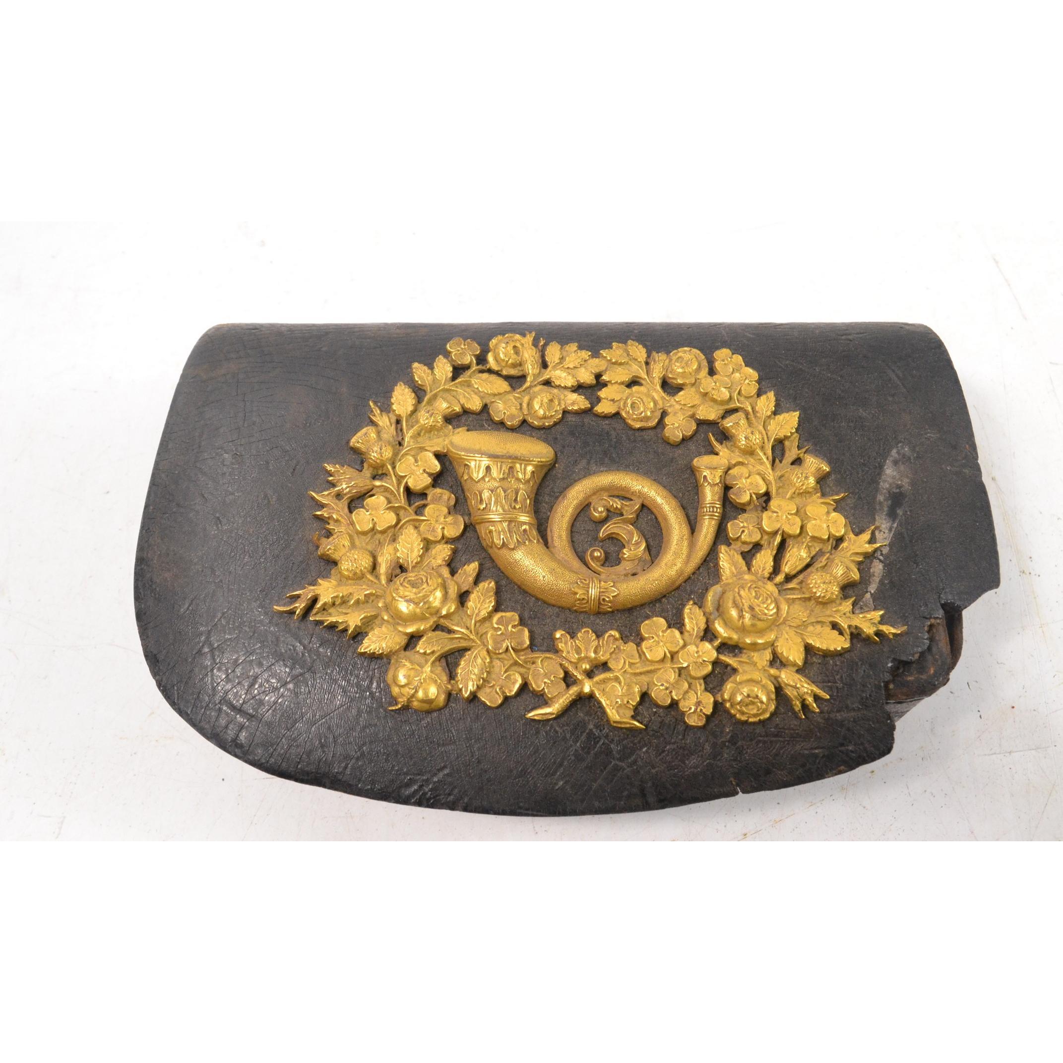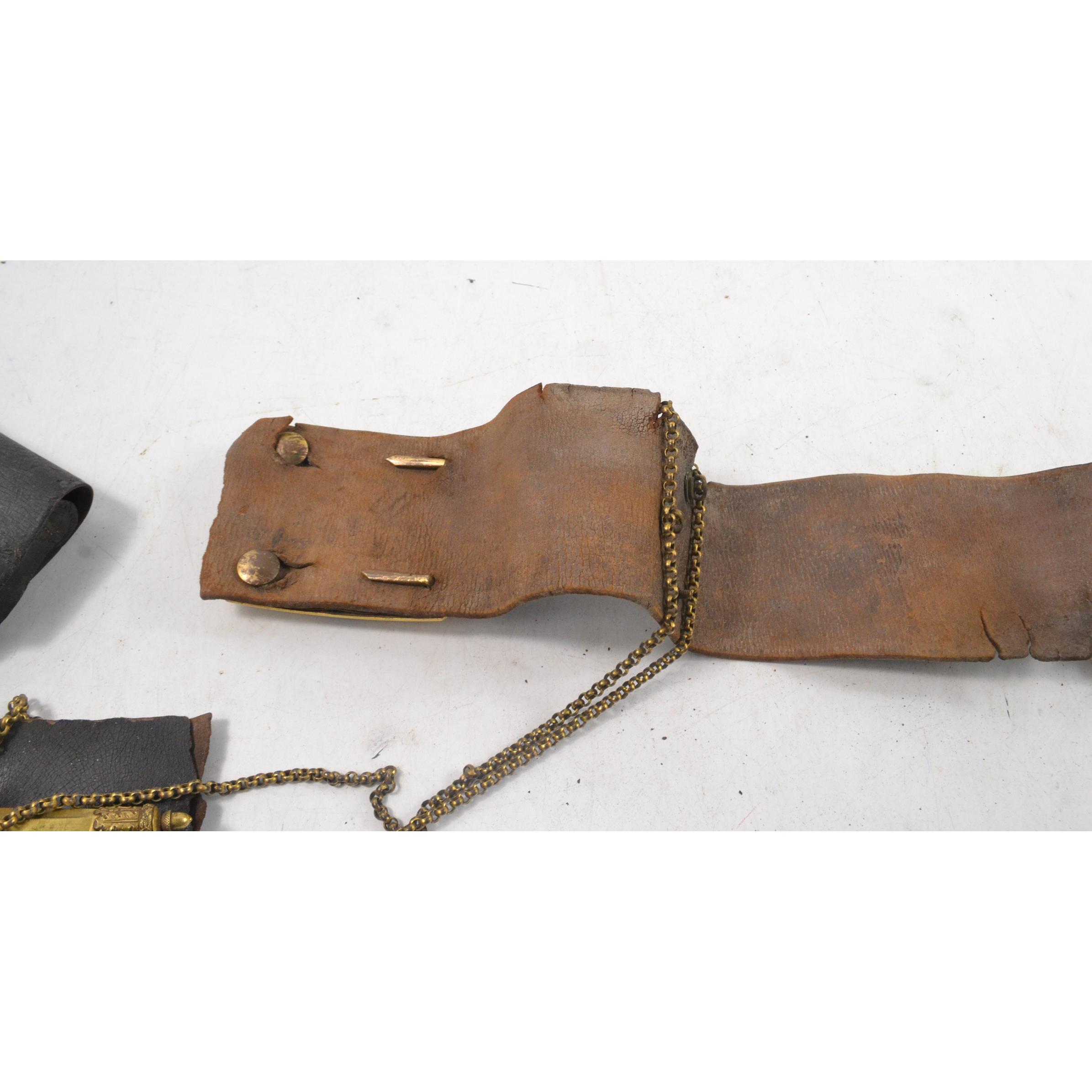 Very old Military belt with 'Now or Never' motto and 3 in trumpet emblem, with matching musket ball holder. Family story reported to be in battle of WaterlooApprox 2 pieces