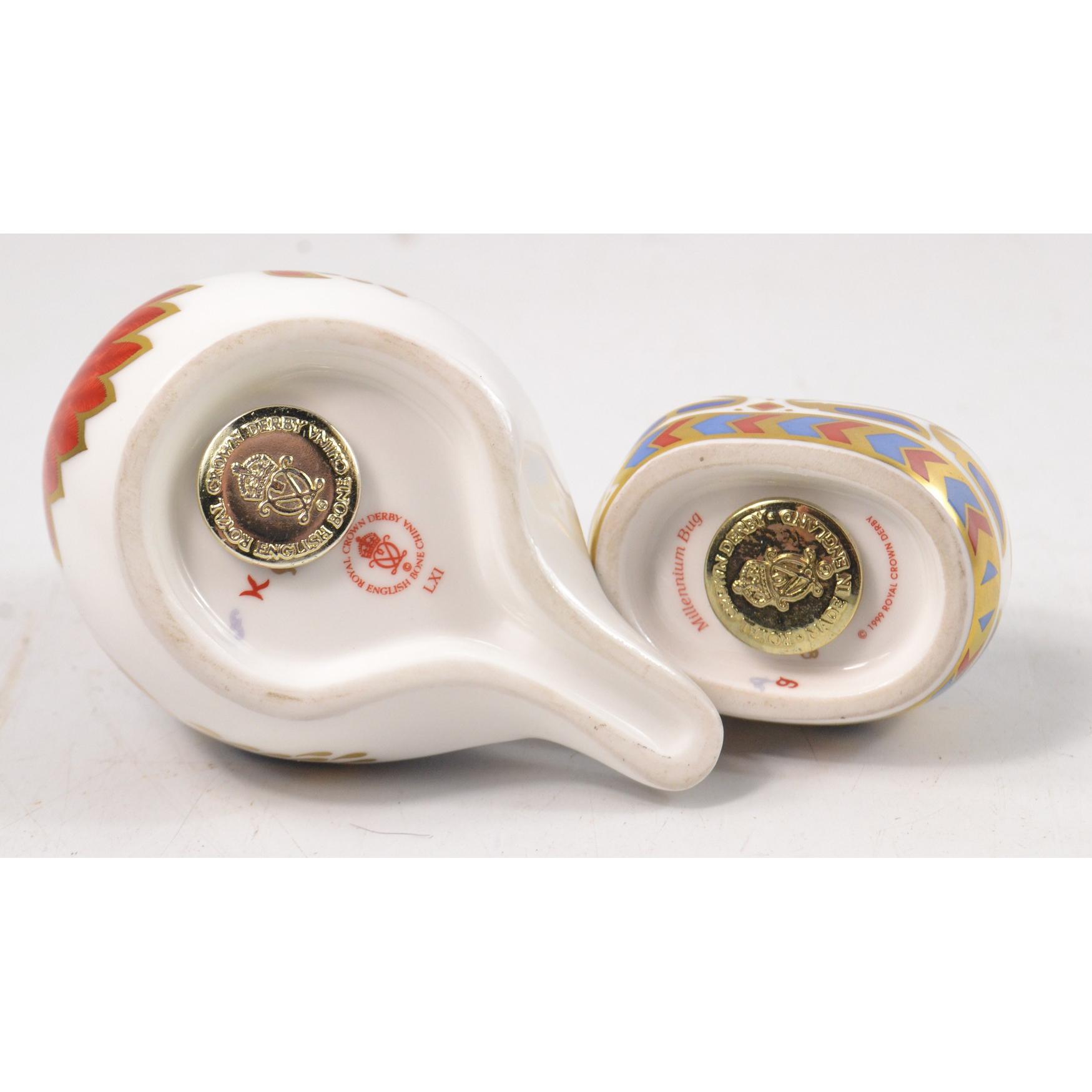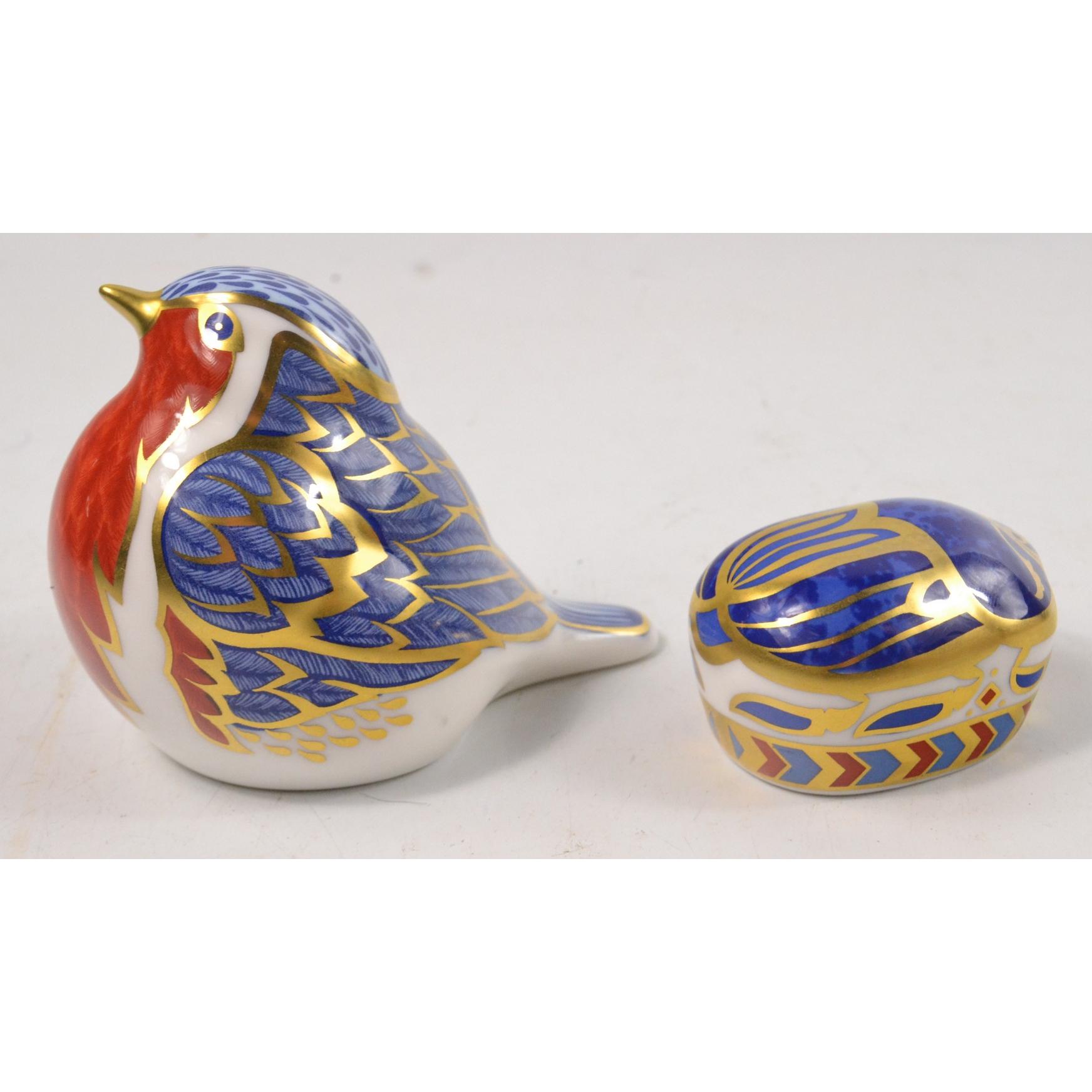 Best Quality Royal Crown Derby porcelain paperweight of a robin and a Millennium bug, both with gold stoppersH: 7cm approx