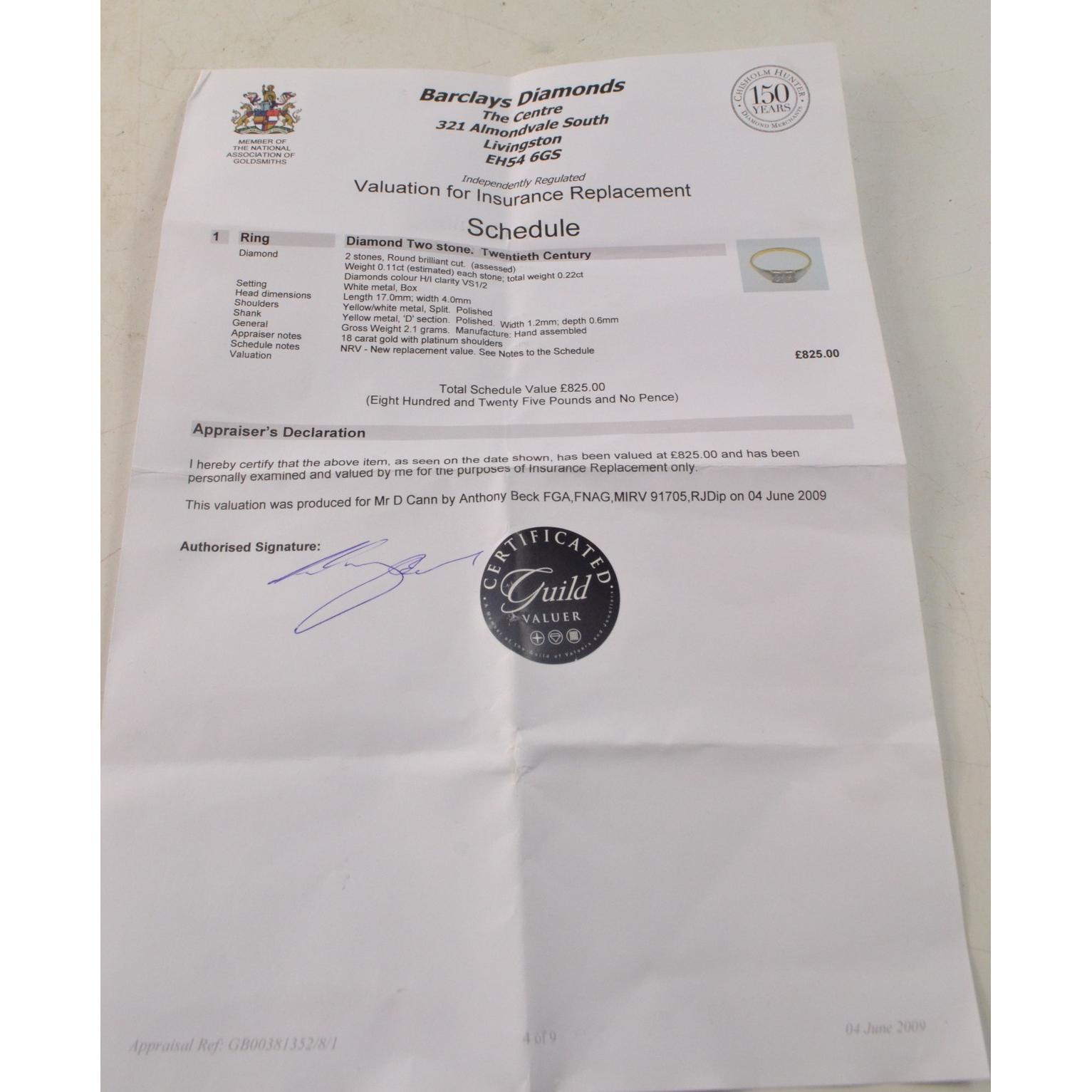 Ladies twin diamond round brilliant cut with each stone estimated at .11g each, total weight in stones .22g approx gross weight of ring 2.10g with platinum shoulders and 22ct yellow gold as per separate valuation certificate which states an insurance valuation of £825!