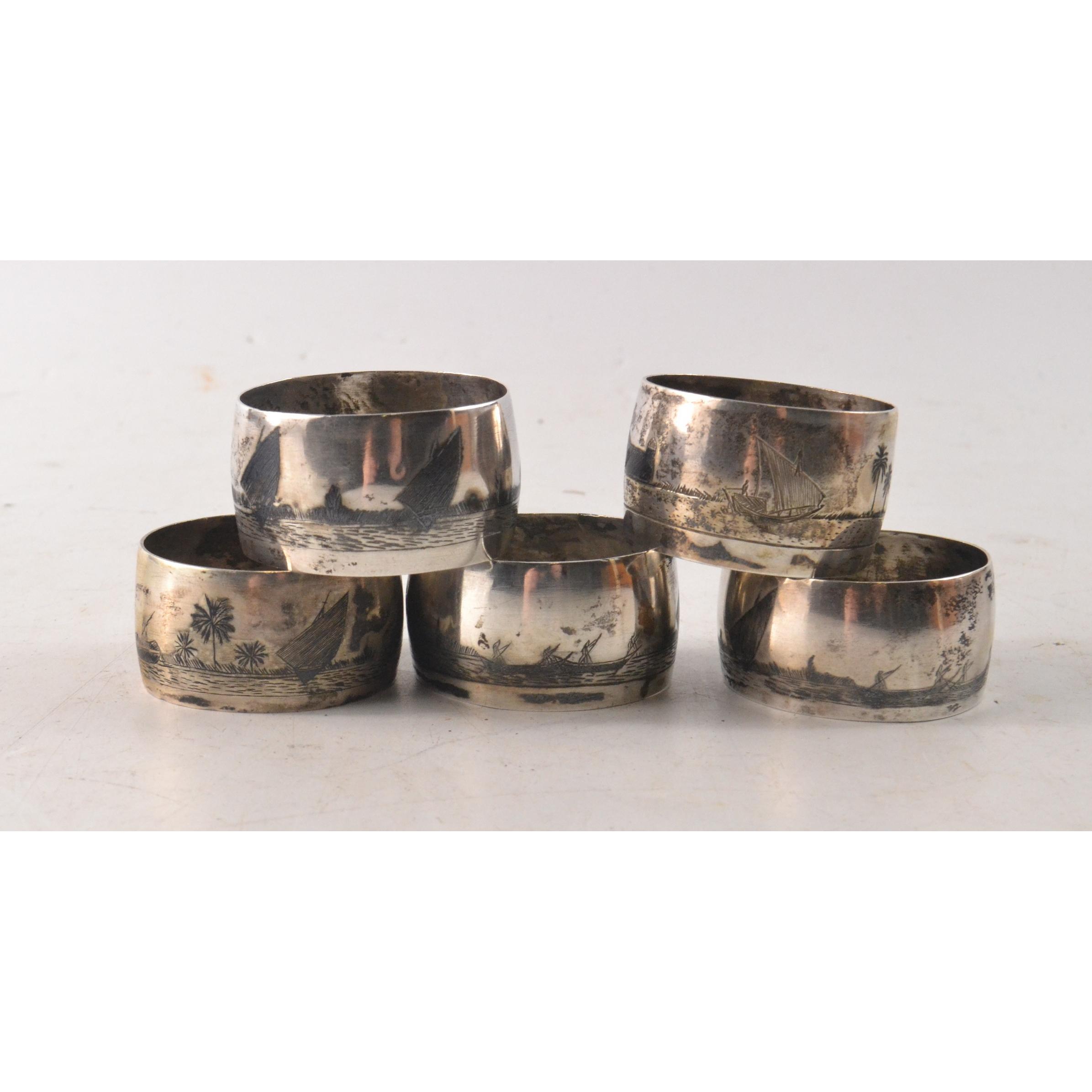 A set of ( ‘White Metal’) 5 napkin holders depicting ships on a Caribbean shorelineApprox 5 pieces