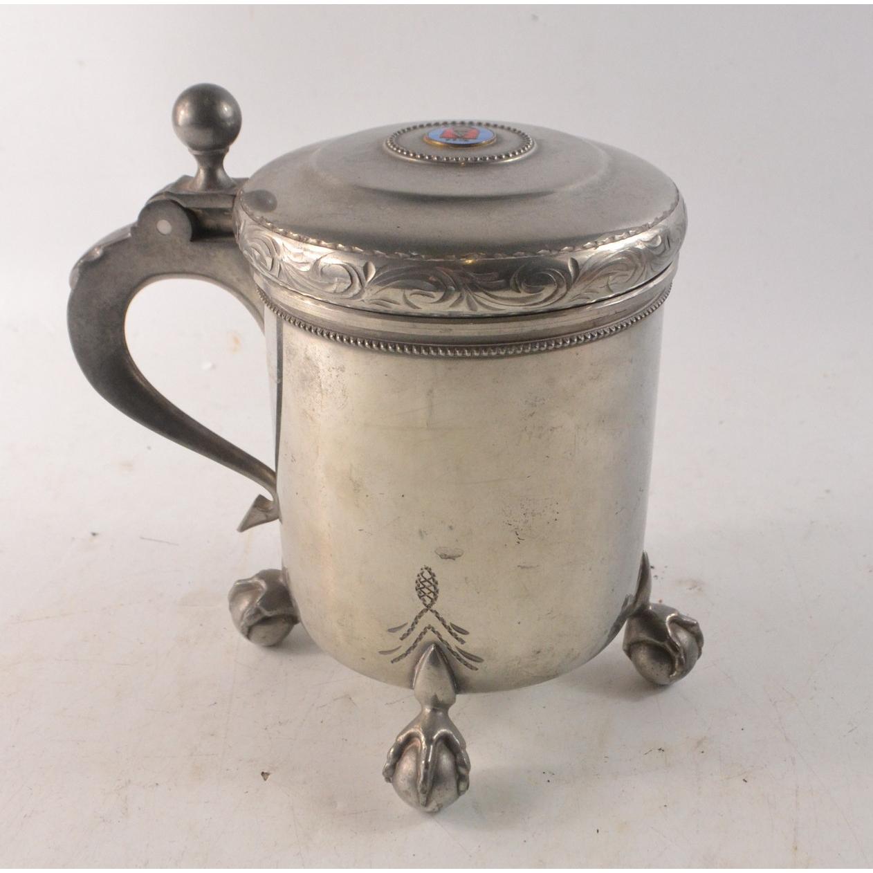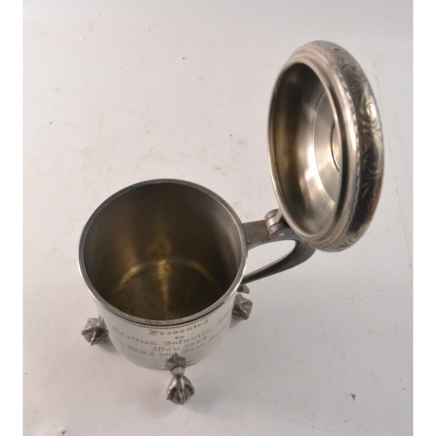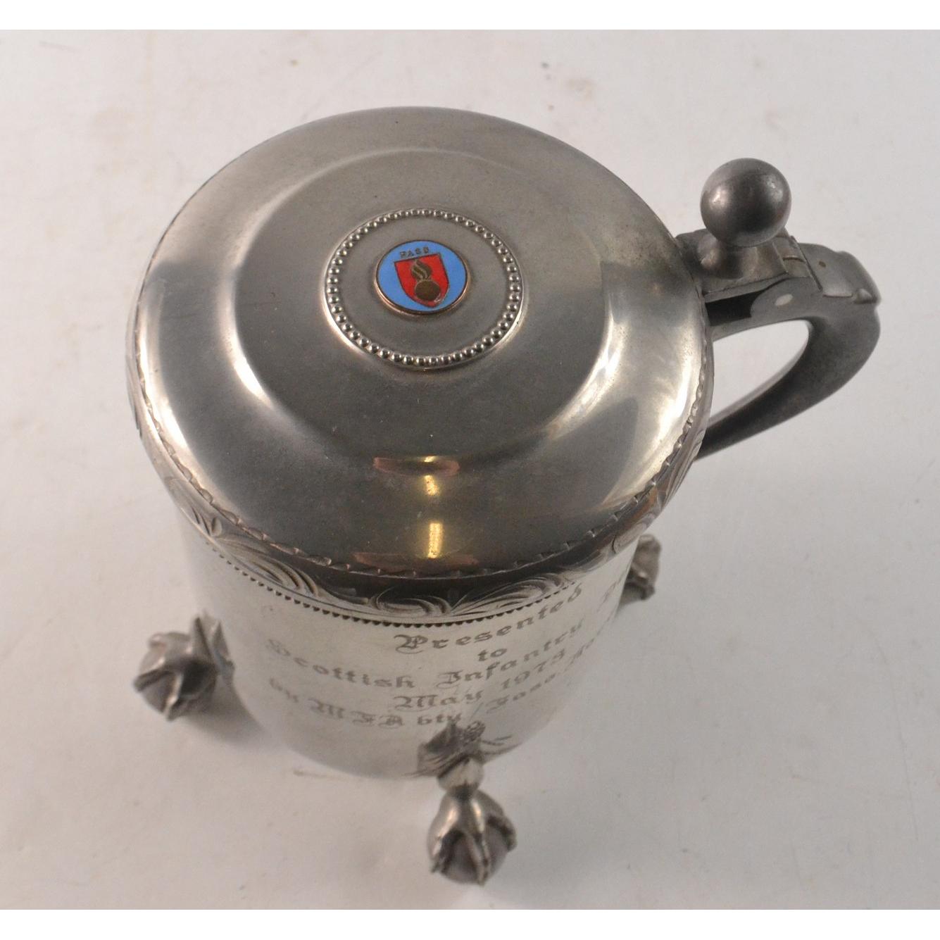 BM Norwegian Pewter lidded tankard ‘ Presented to Scottish Infantry Depot May 1973 , nice tankard on ball and claw feet Diameter excludes the handleH: 19cm approx D: 14cm approx