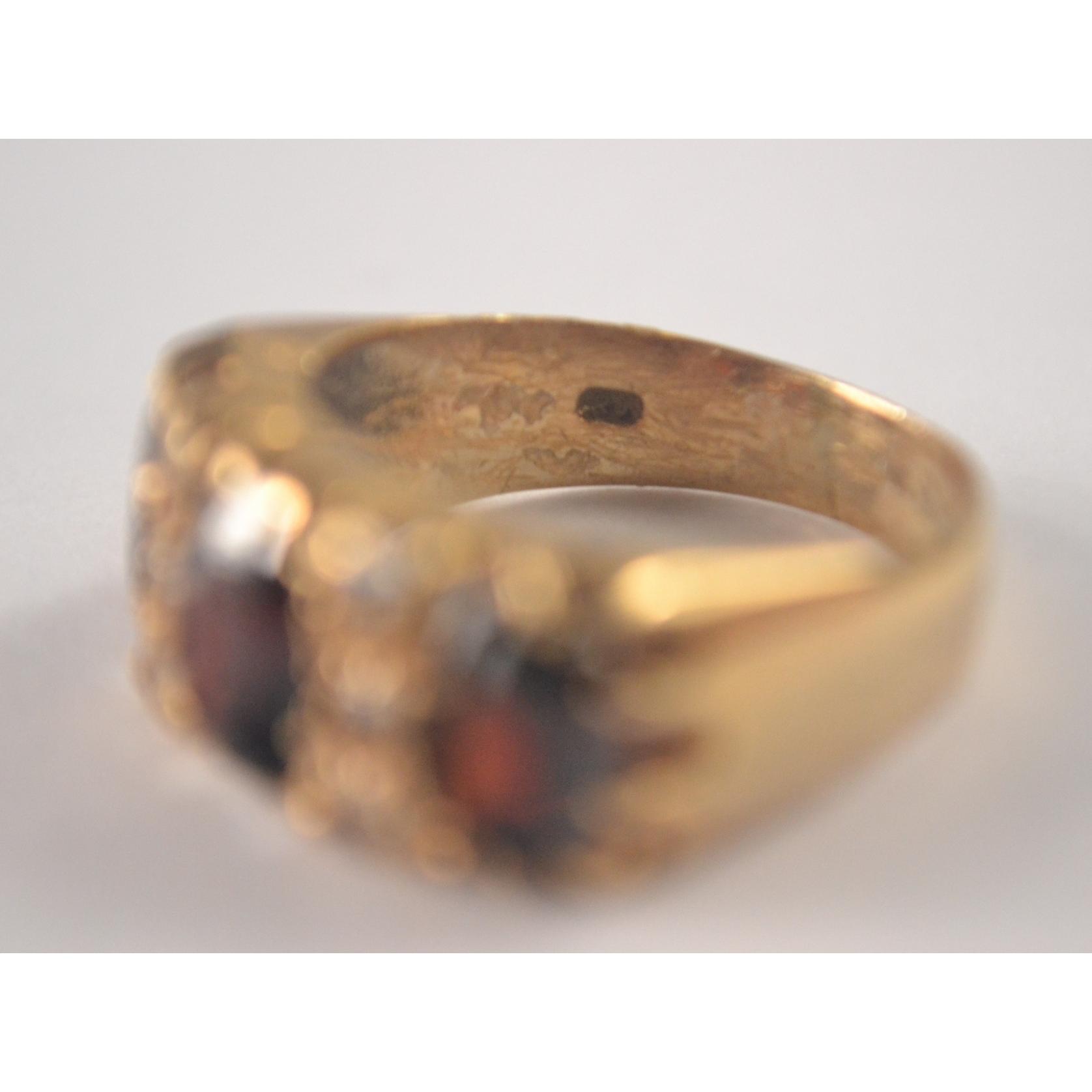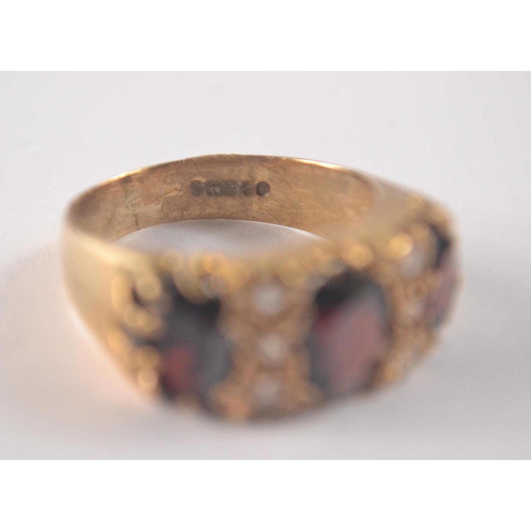 Stamped 375 yellow gold triple ruby and six small diamonds(tested|)set ring 4.55g gross ring size N