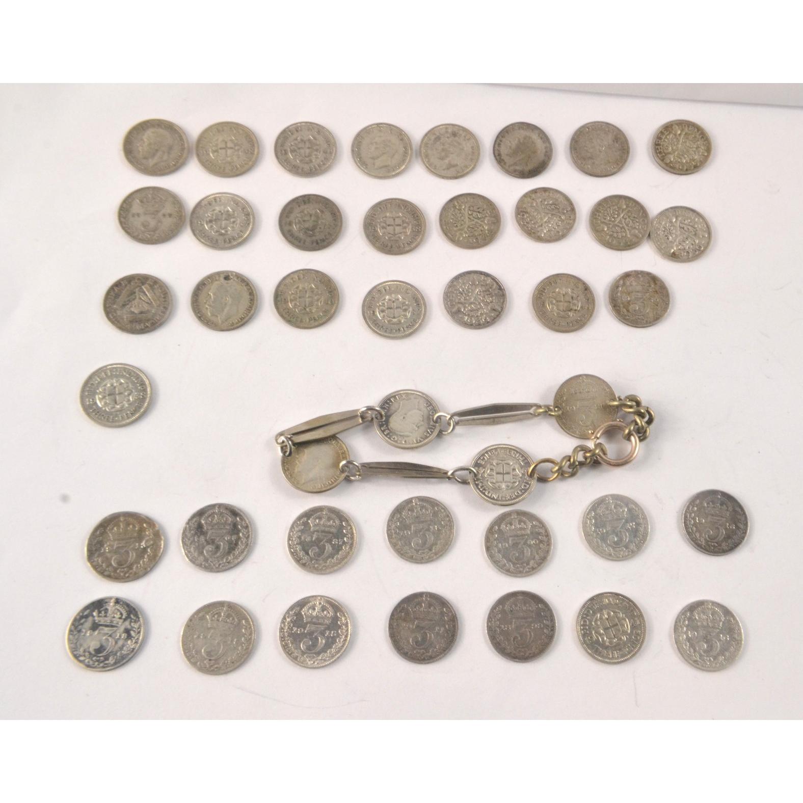 Silver three pence's 15 quantity, 5 three pence's after 1919 and a three penny bracelet gross weight 63.5g
