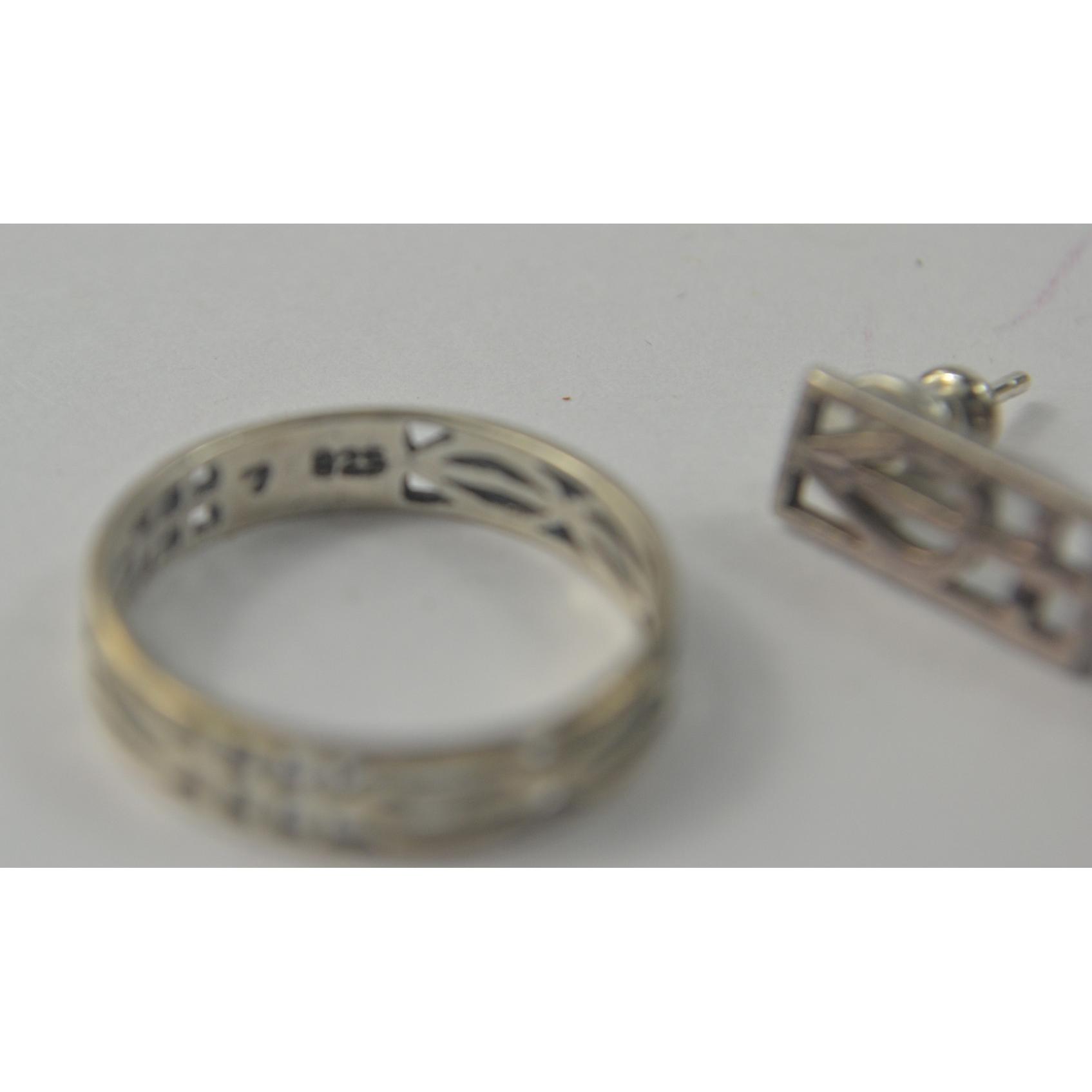 Historic Connections sterling silver ring Rennie Mackintosh style, Historic Connections sterling silver earrings Rennie Mackintosh style, H.Samuel Silver Ring with petal design. Gross weight approx 1g