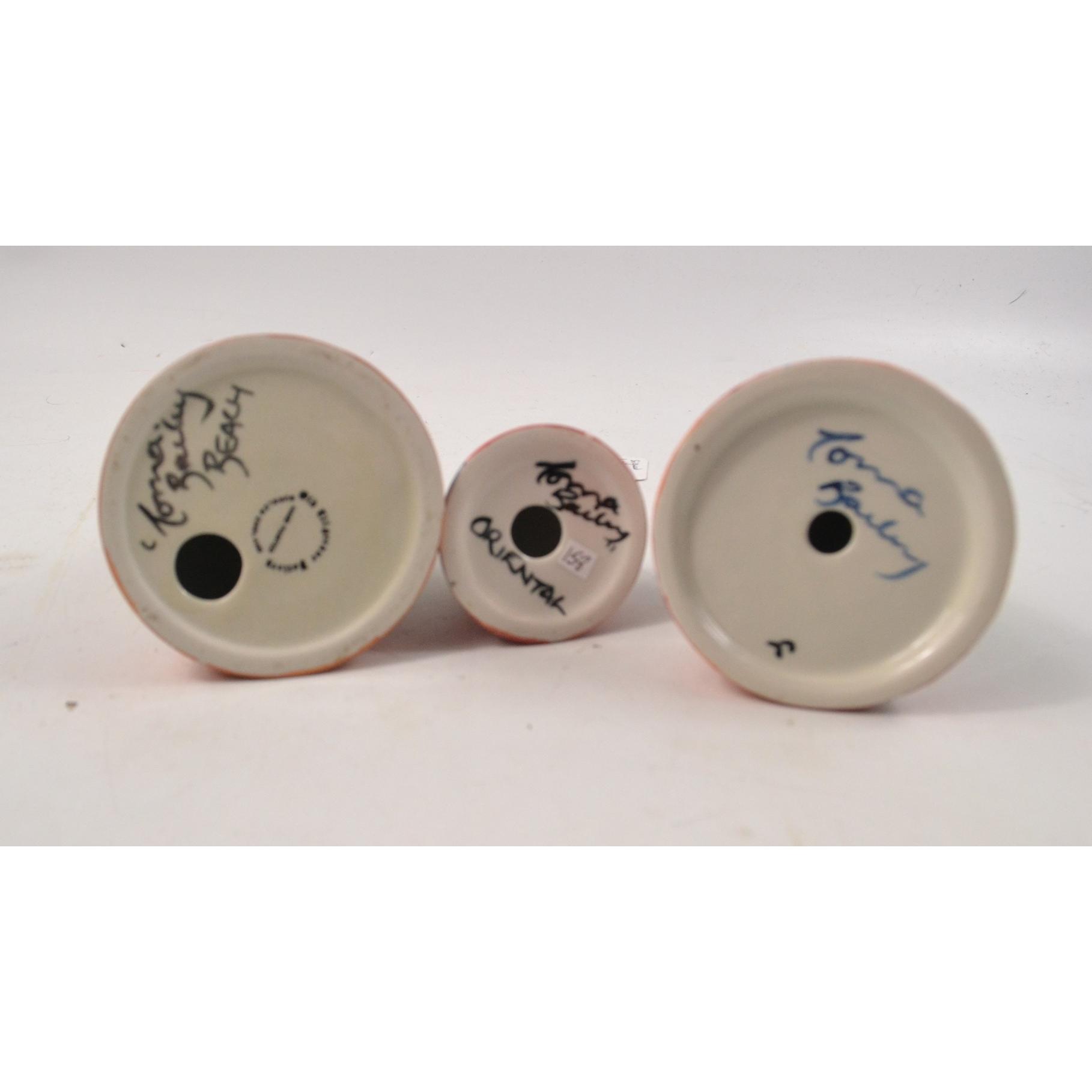 3 x sugar shakers signed Lorna Bailey (one Oriental pattern and one titles beach) taller 14cm smaller 9.5cm