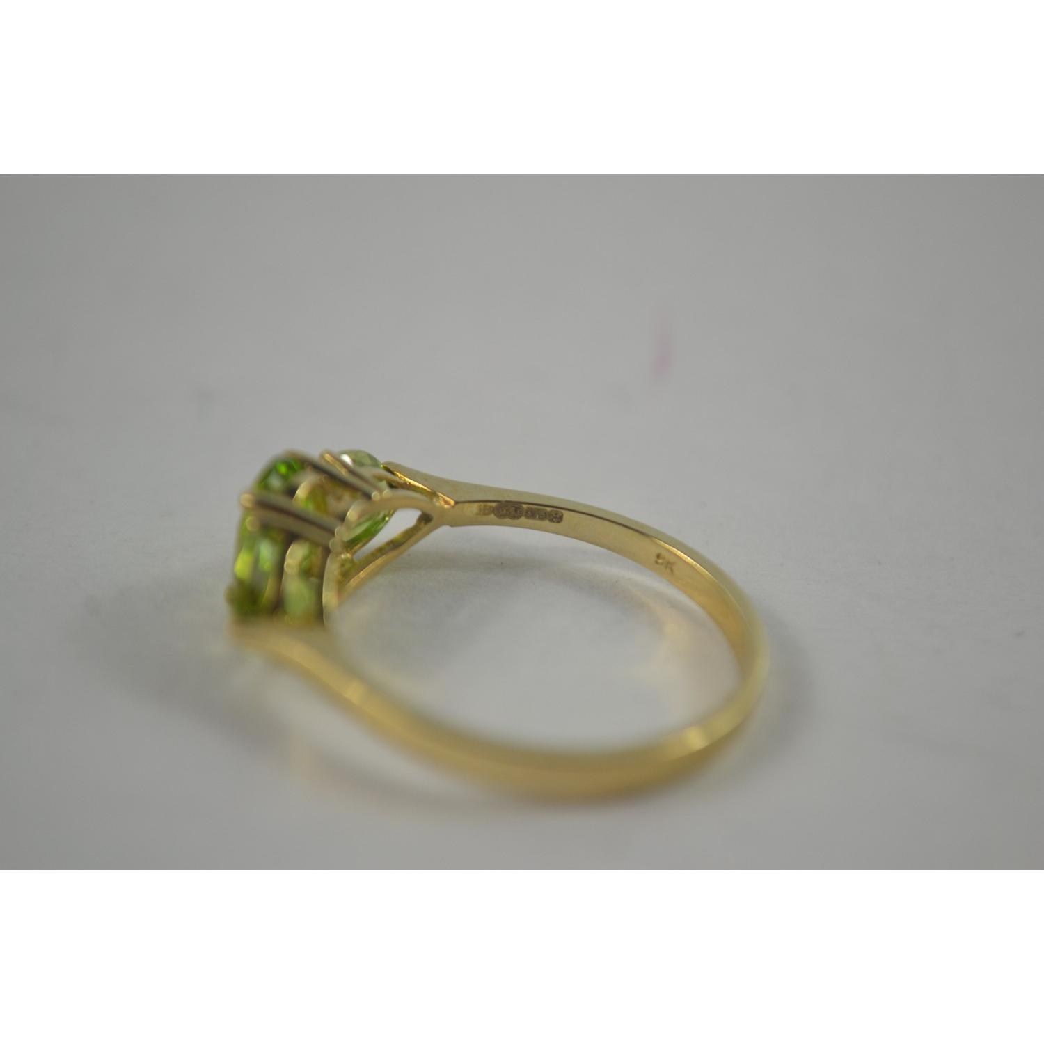 9K Stamped 3 light green stoned ring, centre oval and flanked by 2 triangular shaped stones[ size P ]Gross weight approx 1.9grm