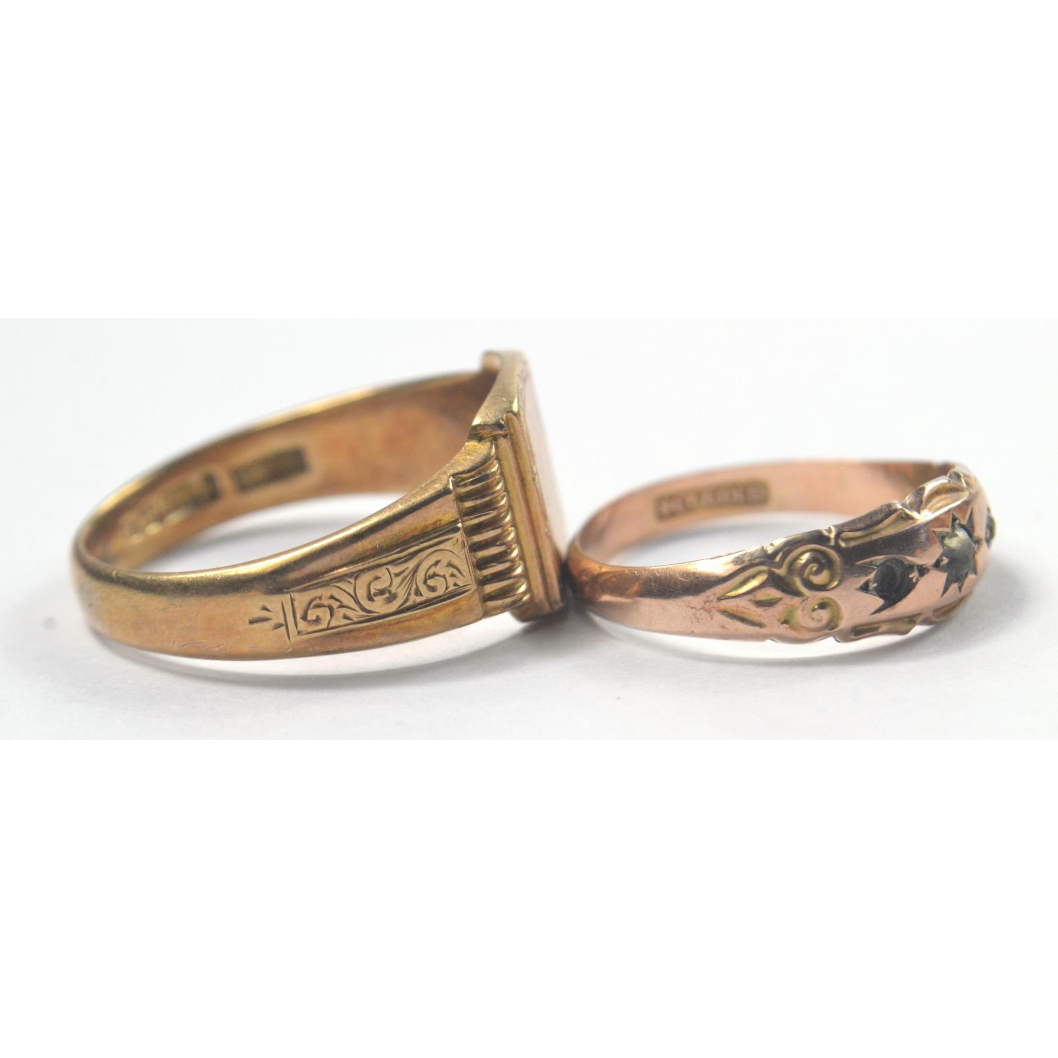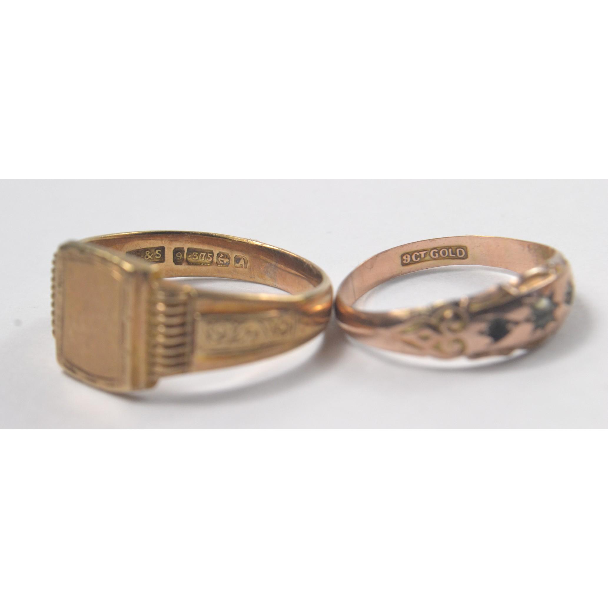 9ct stamped yellow gold ring 1.07g, also a gents signet ring size V/W weight 5.90gApprox 2 pieces