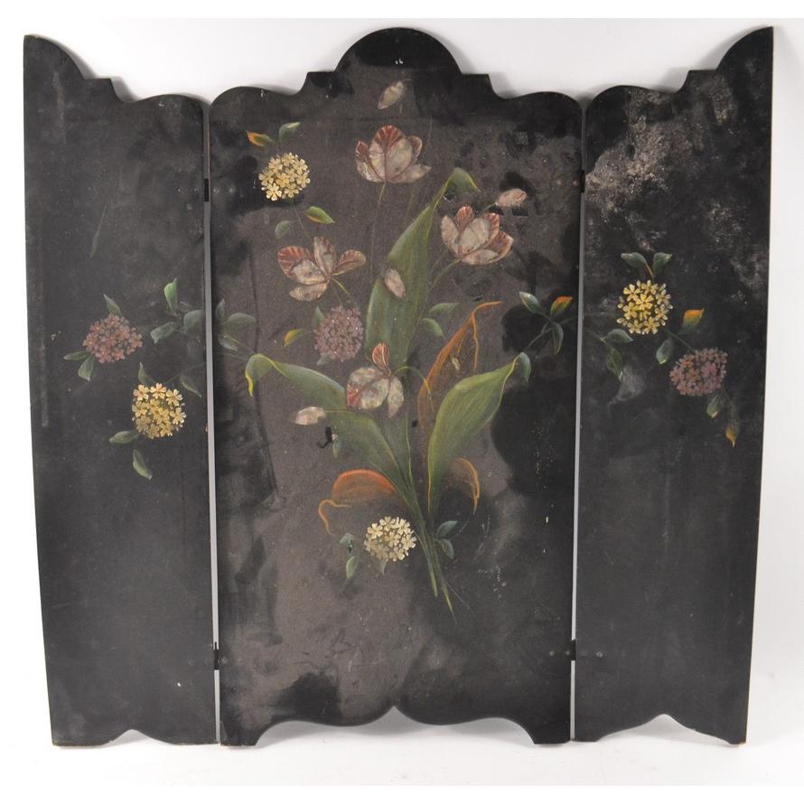 An old vintage floral patterned tri-folding fire screen in black lacquer finishW: 3ft approx H: 2ft approx