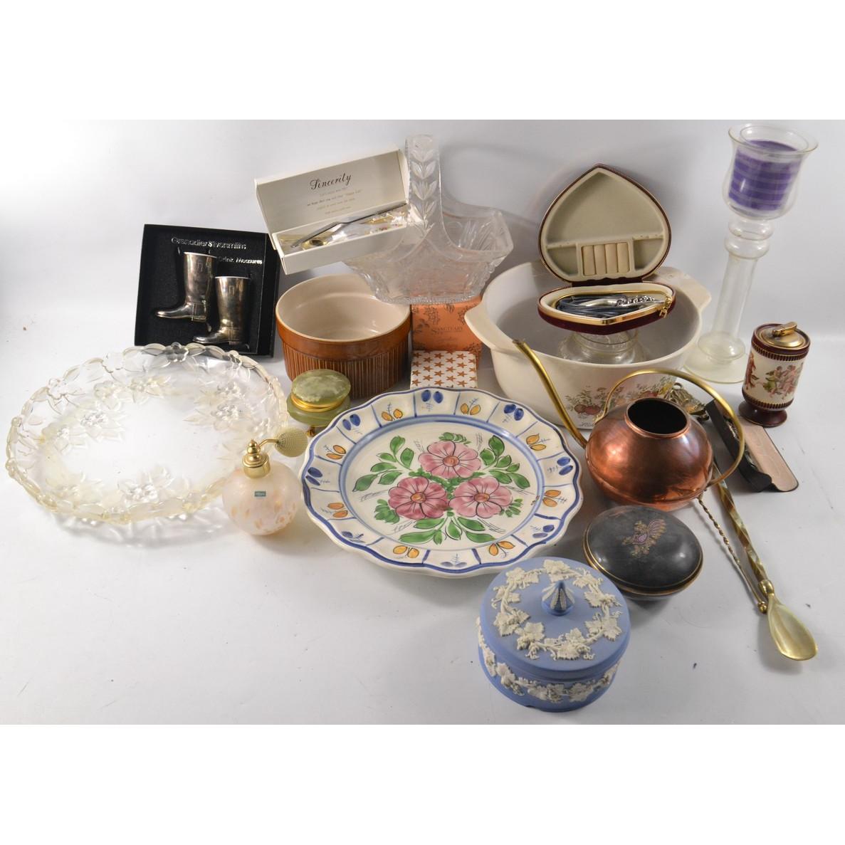 A large mixed box to include a perfume atomiser, a Jasperware lidded dish etc etc