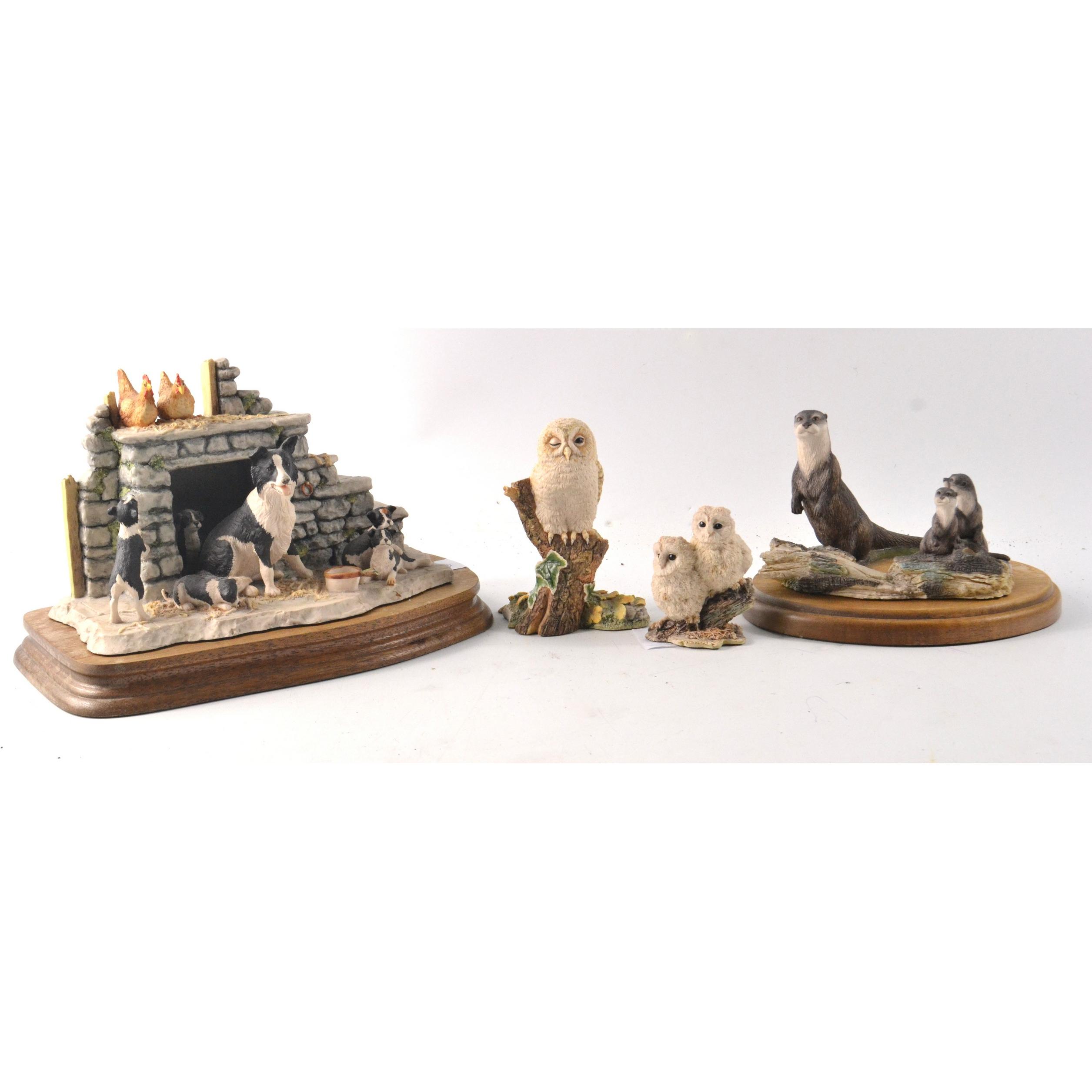 BORDERS FINE ARTS 'Jocks Pride' from All Creatures Great And Small' series No JH5 on plynth, also BFA 'Wildlife Families RW2 Otter on plynth and two others to include 'Watching and Waiting' owls, and One Owlet(sustained some damage) RB25, all else in good condition