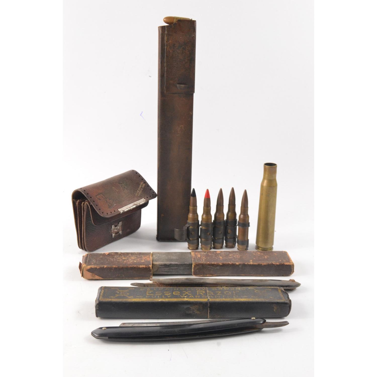 AN INTERESTING LOT to include WW1 gun ammunition holder , old brass spent shell and a vintage ESSEX RAZOR and another cut-throat style razor etcApprox 6 pieces