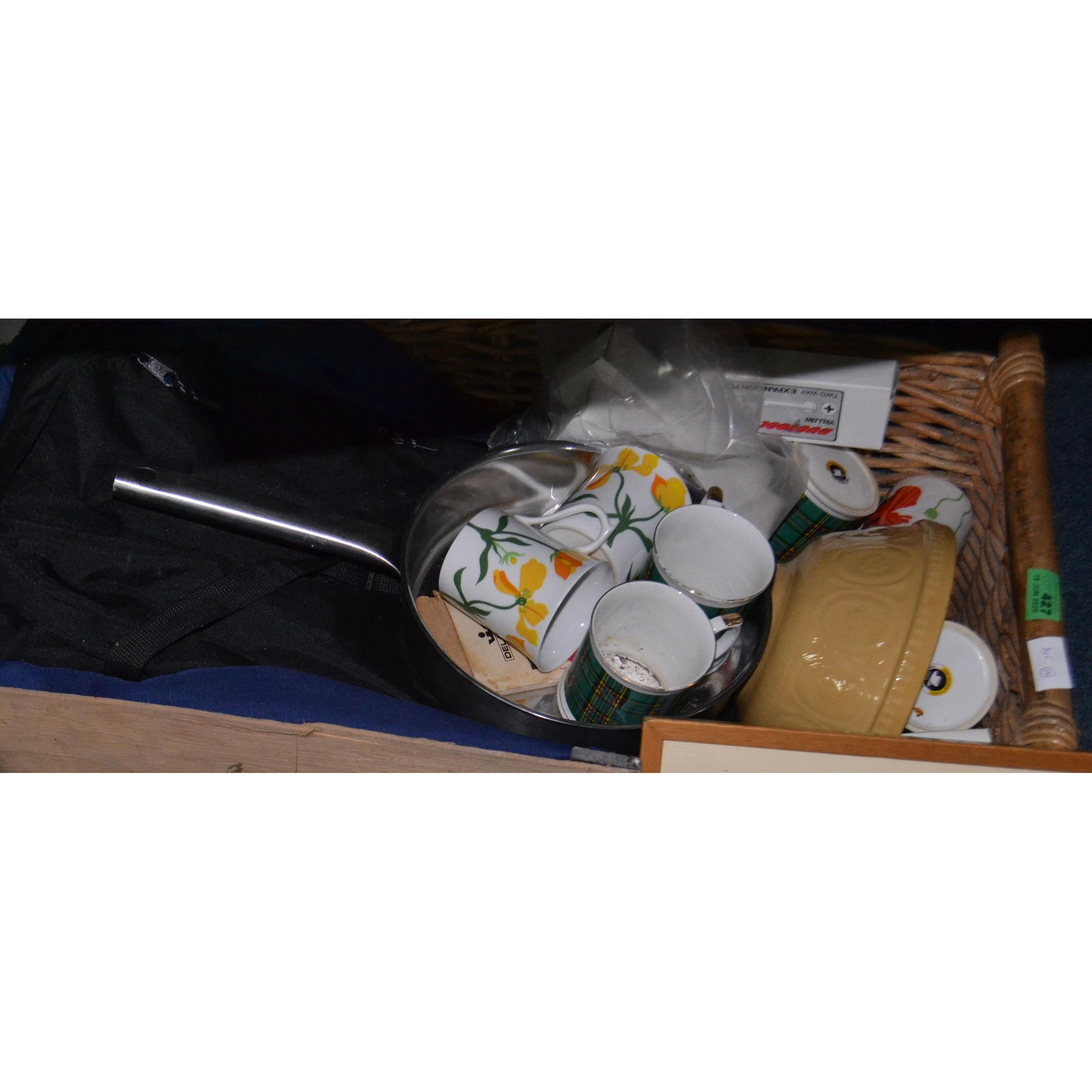 A good sturdy rectangular log basket to include some bone china mugs, a padded lap tray, a back pack dtc