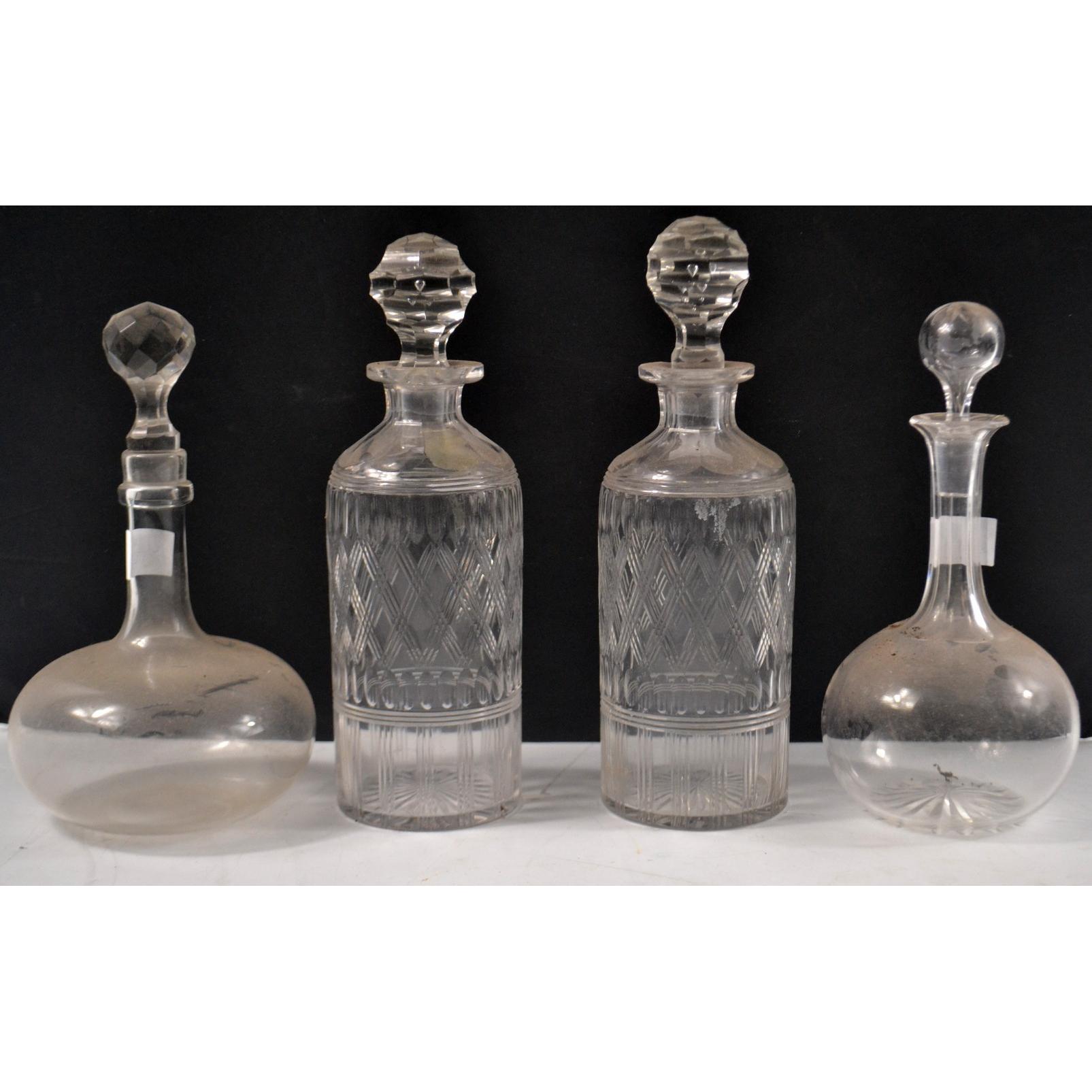 Four very old decanters, two small bulbous and two cylindrical all with their stoppersApprox 4 pieces