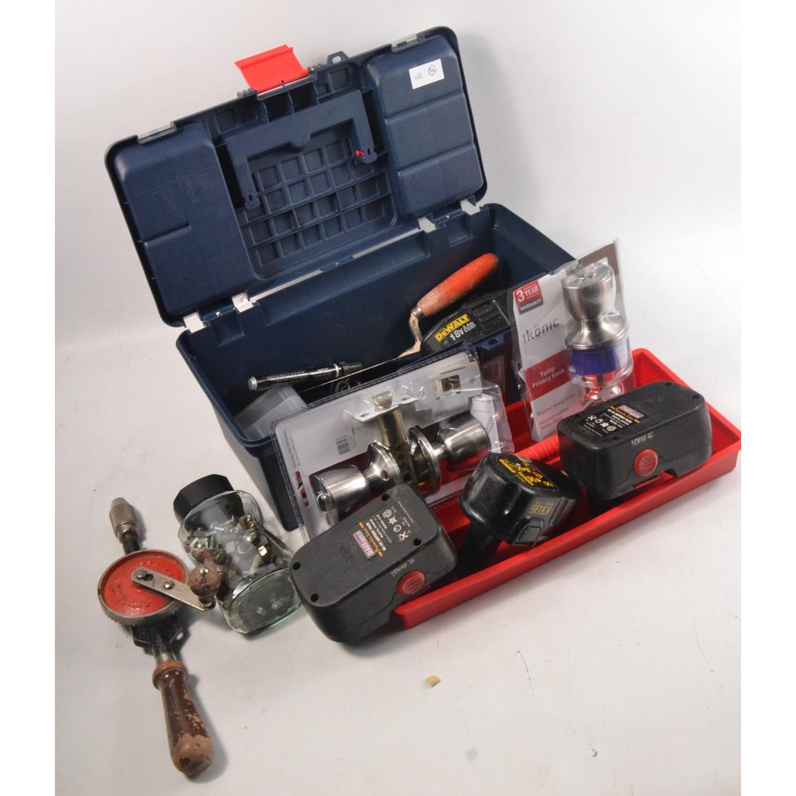 A tool box with some vintage carpentry tools to include a hand STANLEY drill etc etc