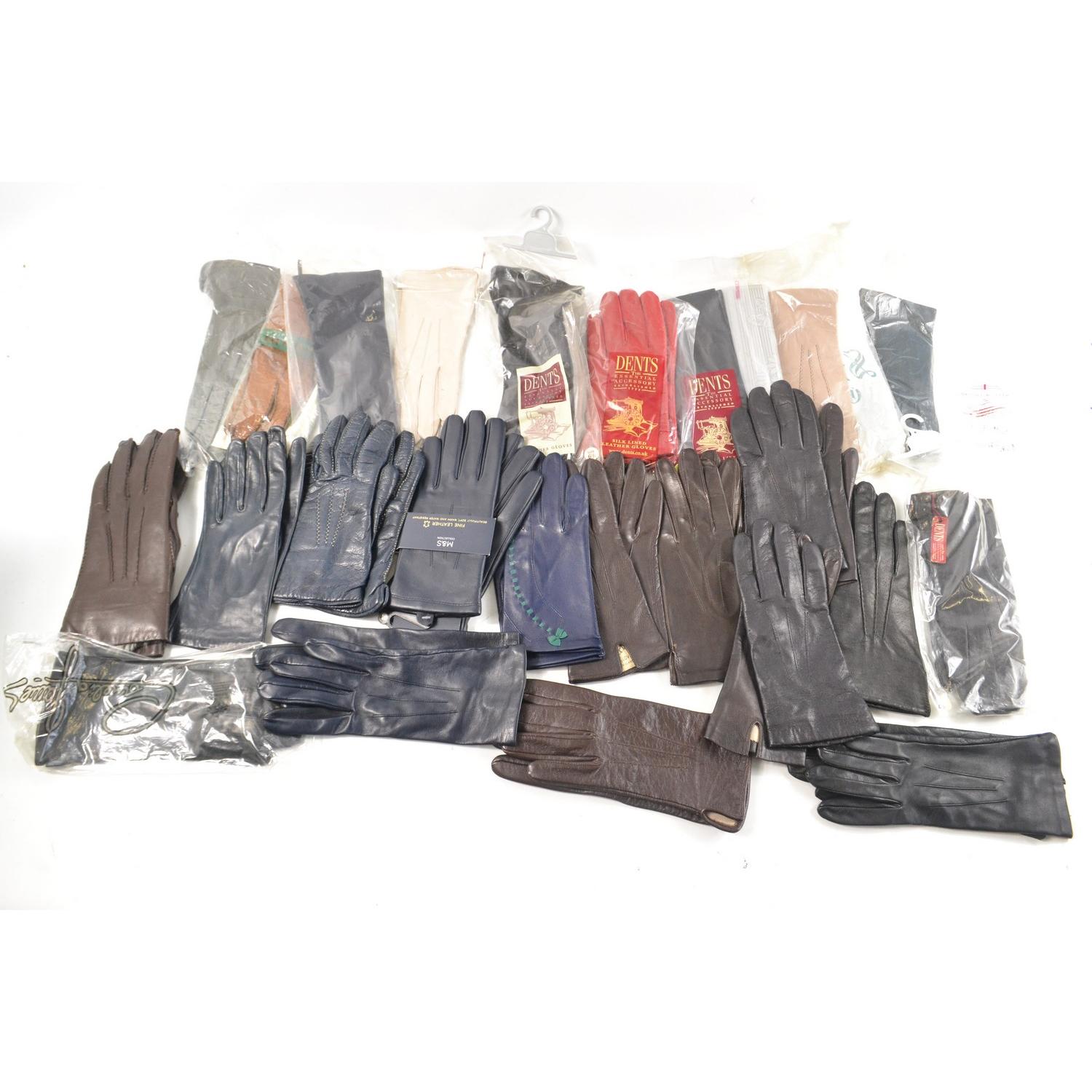 A box of ladies( some new in wrapper still! ) leather gloves various colours of leather, red, tan, brown, black etc etc small/medium size, most some with size 5 on them etc
