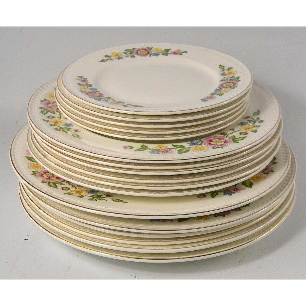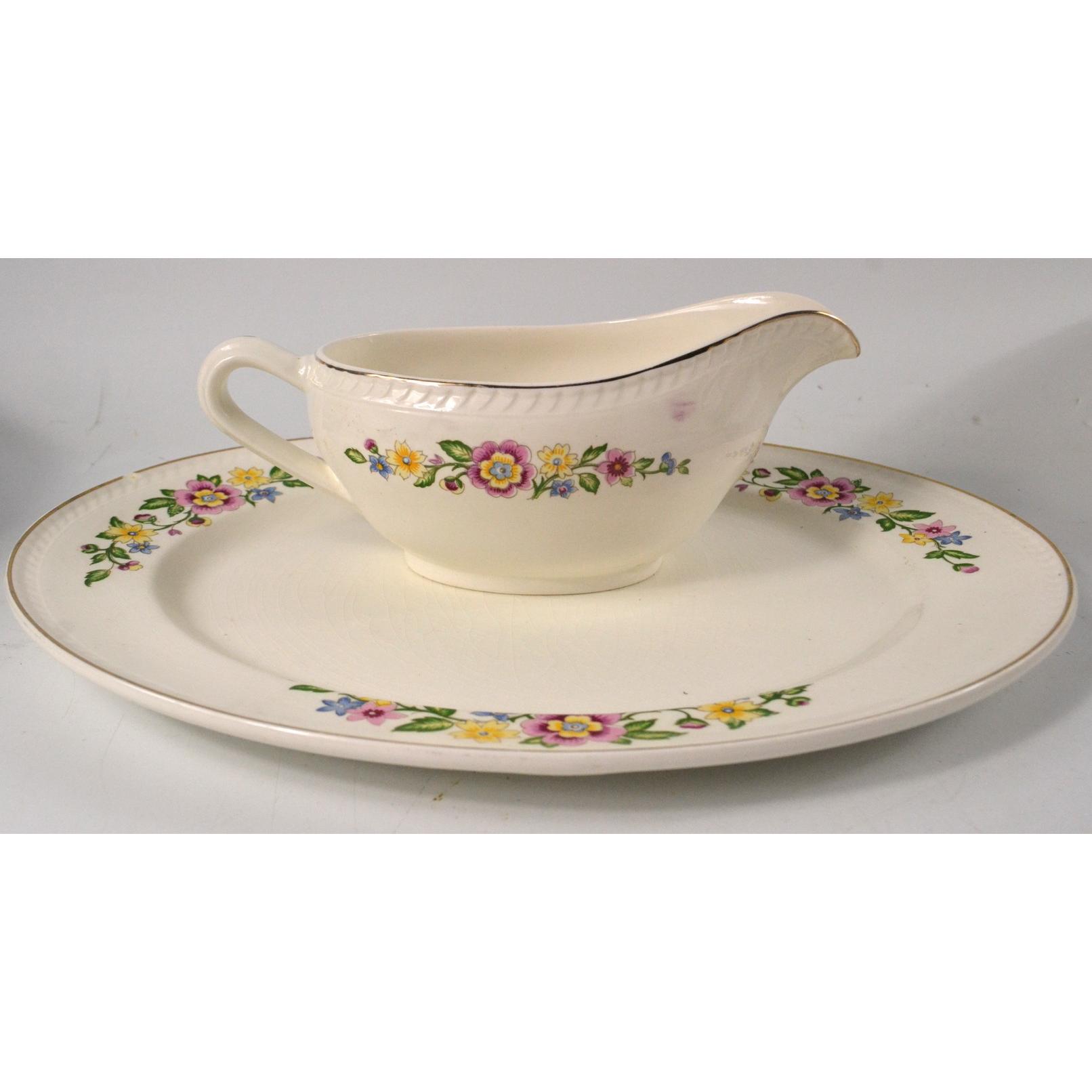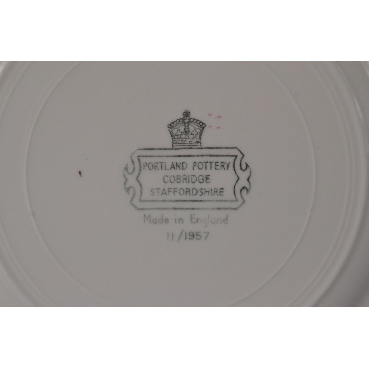 Vintage c1957 floral patterned Portland pottery Cobridge dinner service consisting of 6 dinner plates, 6 side plates, 5 tea plates 2 tureens, 1 serving platter/plate and 1 gravy bowl.