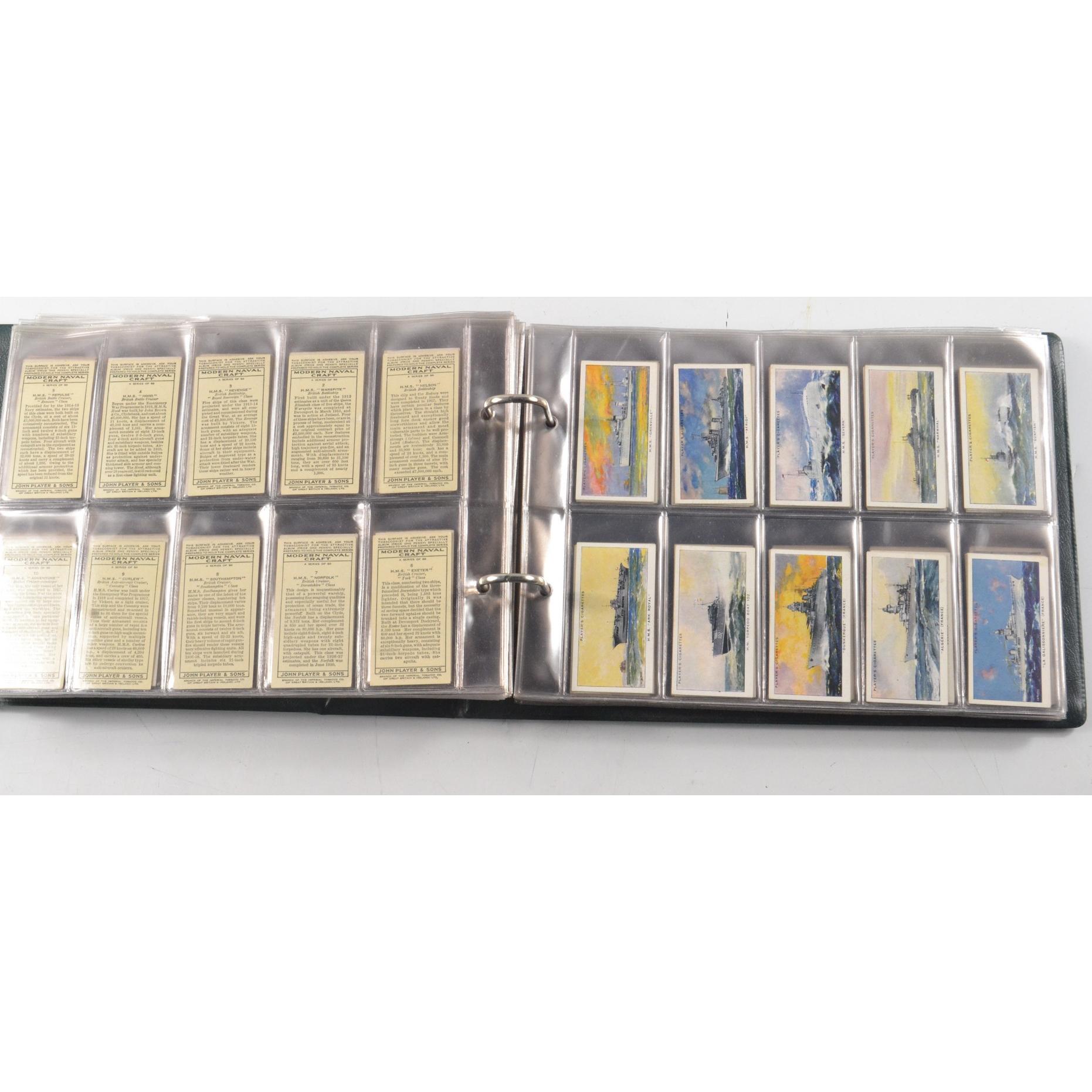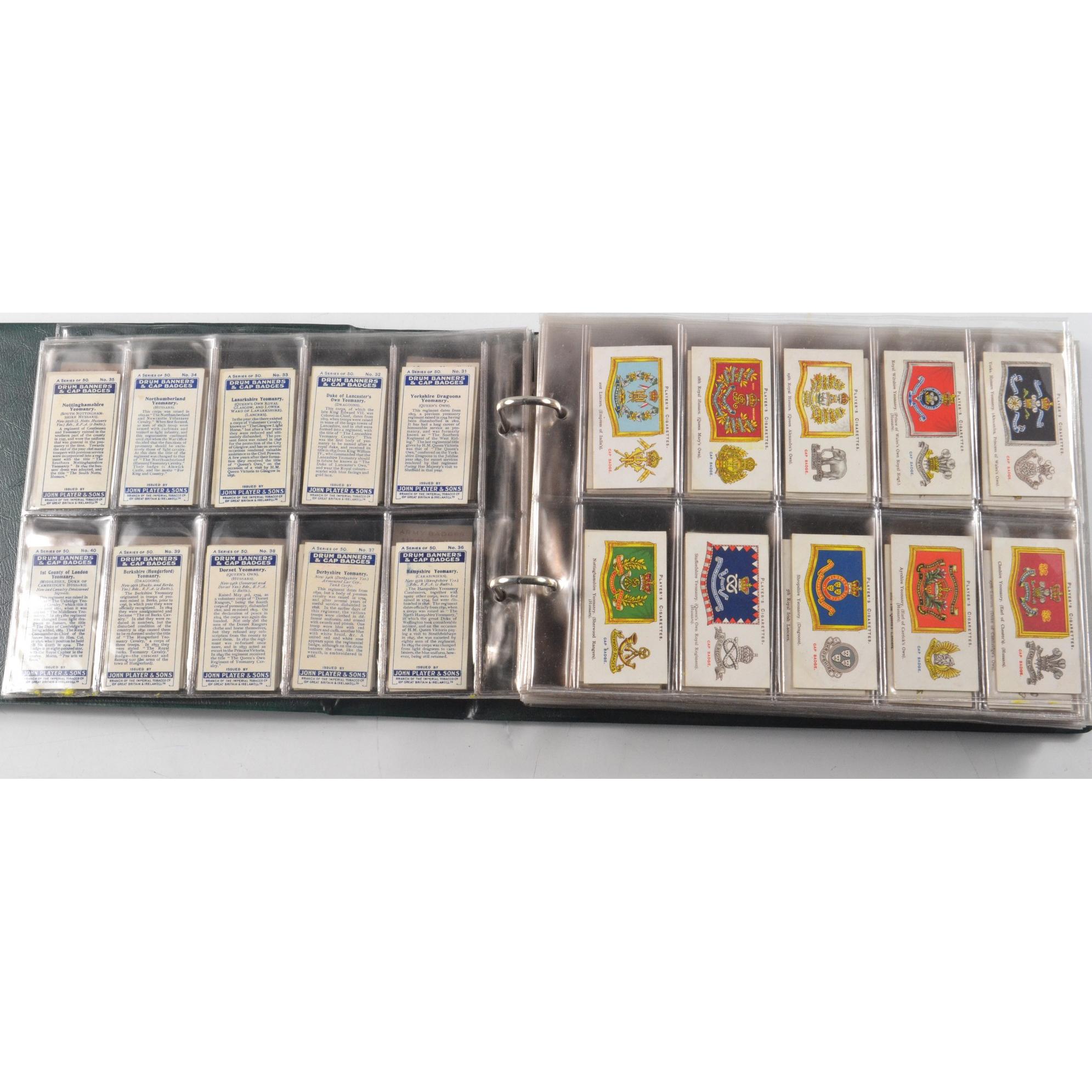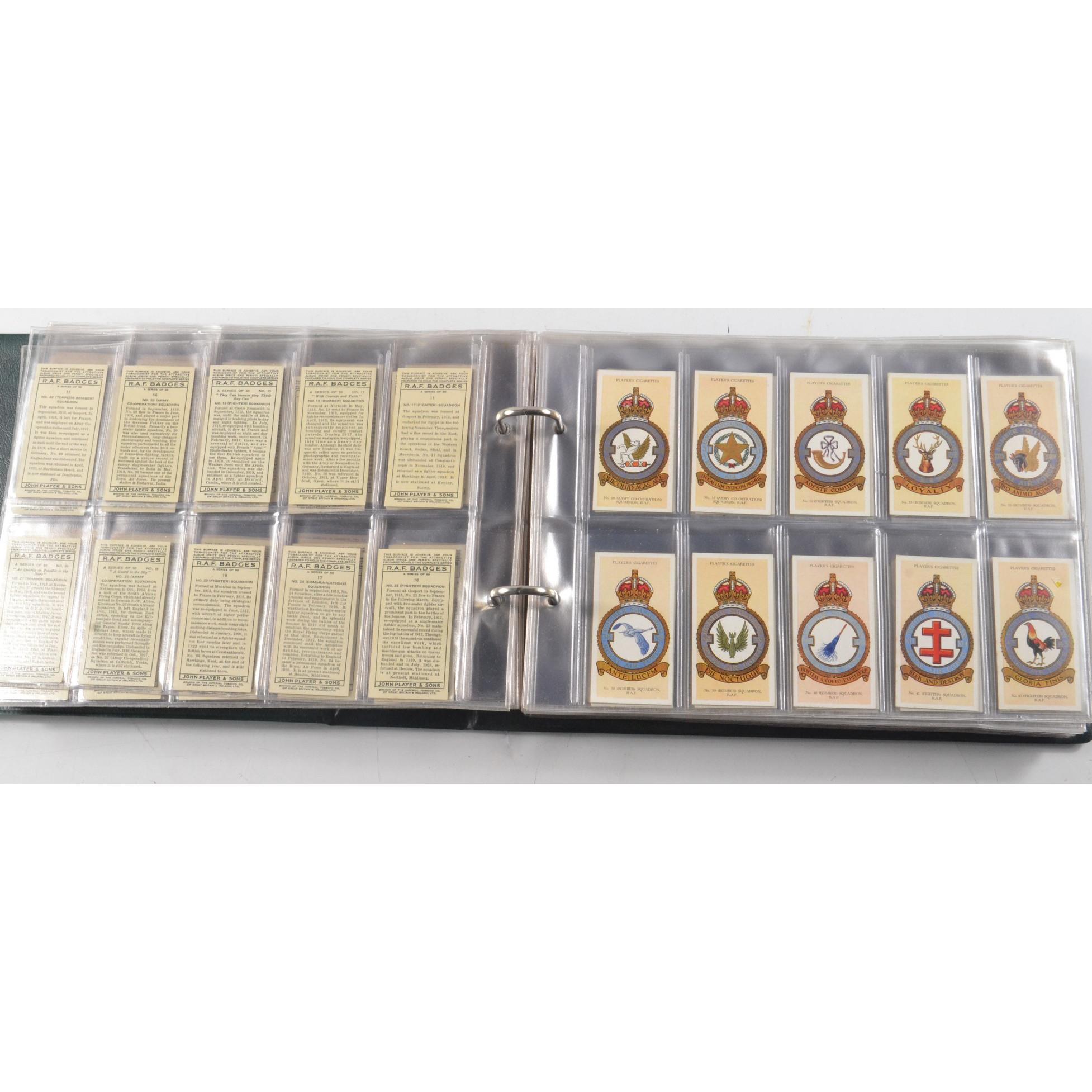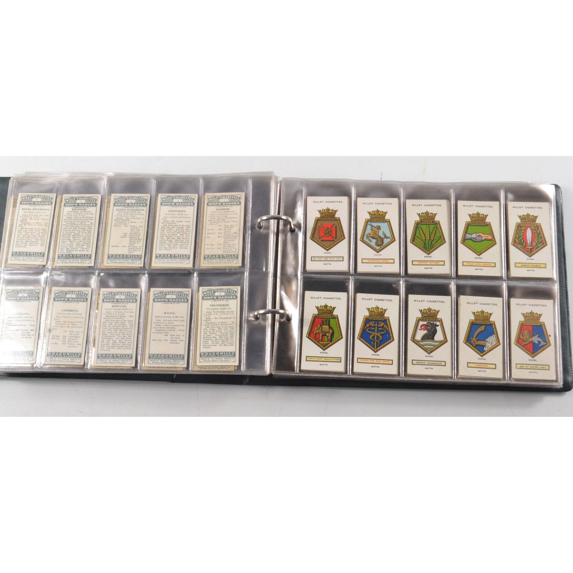 Large (over 550) Vintage collection of cigarette badges in a bound clip folder with plastic sleeve individual pockets of 10 cards per sleeve, to include Army Badges series 48 issued by GALLAHER LTD 38 cards, also Drum Banners and Cap Badges issued by John Player & Sons 50 cards, also Uniforms of the Territorial Army 50 cards, also JOHN PLAYER & SONS Military Uniforms of the British Empire Overseas 50 cards, also RAF Badges 40 cards, also JOHN PLAYER & SONS Aircraft of the Royal Air Force 50 cards, also WILLS Ship's Badges x 50 cards, also JOHN PLAYER & SONS Modern Naval Craft x50 cards, also WILLS Life In The Royal Navy x50 cards, also WILLS Speed x 50 cards, also WILLS Merchant Ships of the World x 50 cards, also JOHN PLAYER & SONS International Air Liners x 50 cards
