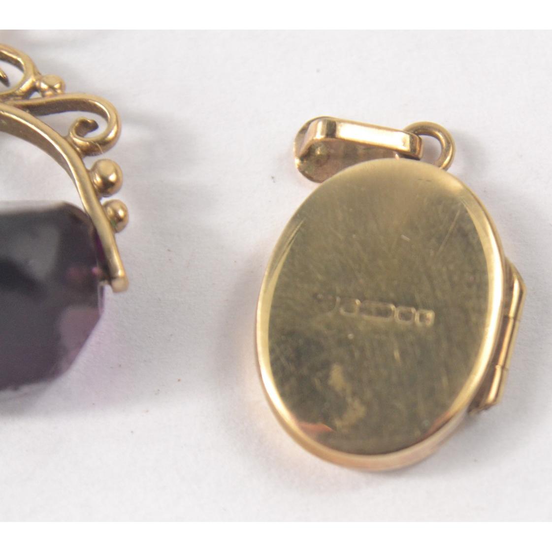 Indistinct Hallmarked 375 yellow gold Locket 2.25g with also a Victorian 375 stamped fob charm With an amethyst inset 3.07gApprox 2 pieces