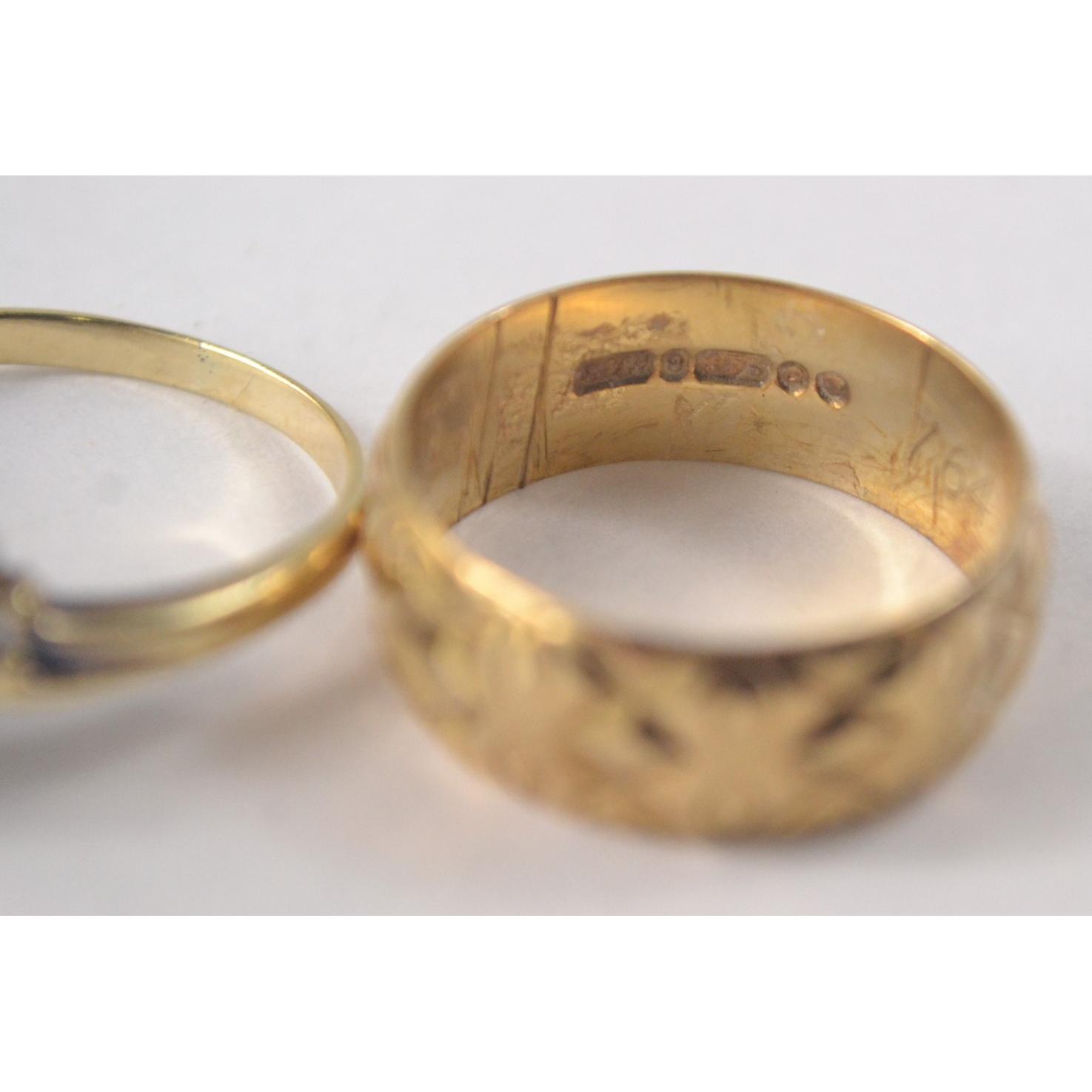 A 375 stamped yellow gold wedding band size M 3.77g and ‘ yellow metal’ diamond( tested) and emerald engagement ring Gross weight 2.18g ring size LApprox 2 pieces