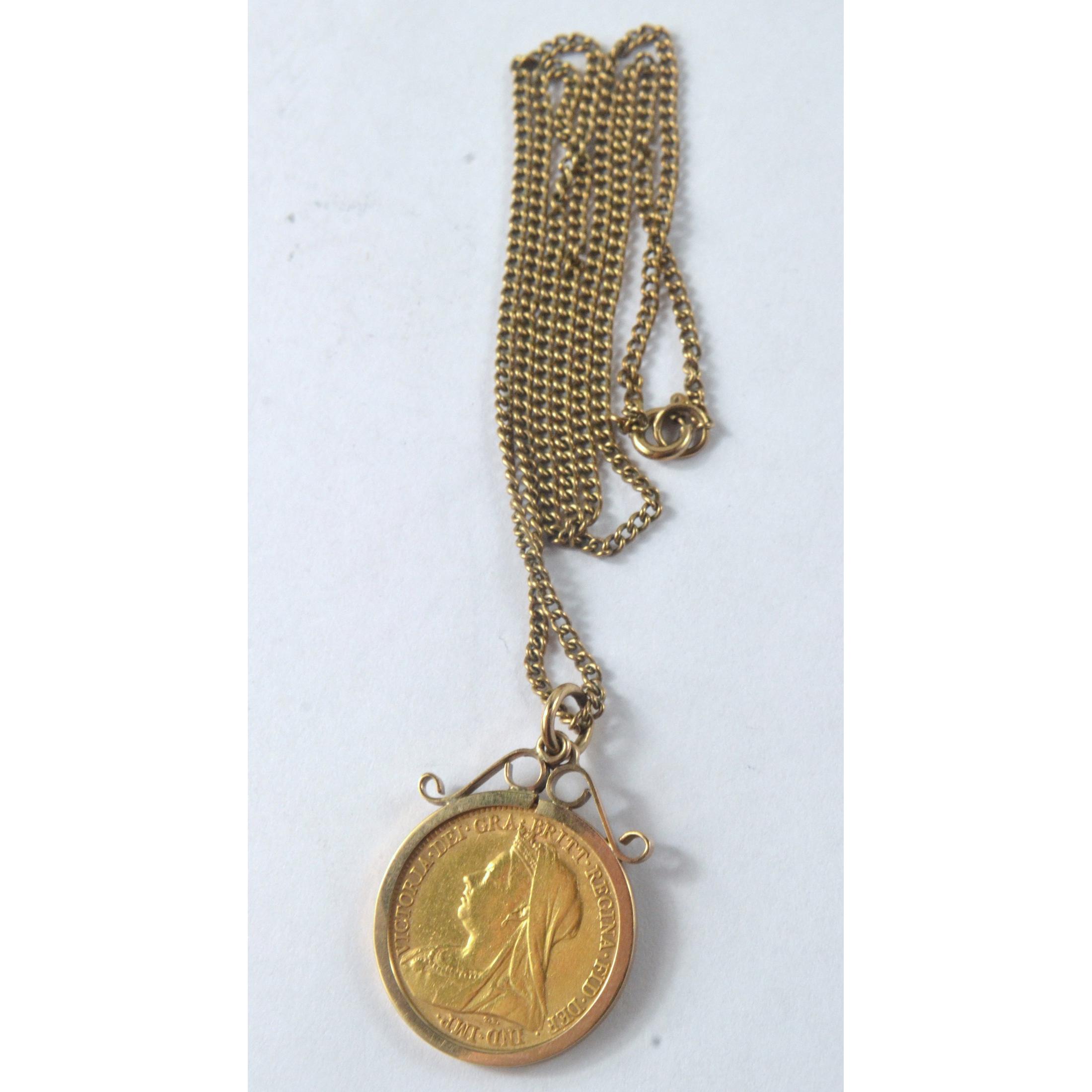 A 1898 Victoria 22ct Half Sovereign , mounted on a 375 stamped yellow gold chain total weight 8.27gGross weight approx 8.27g