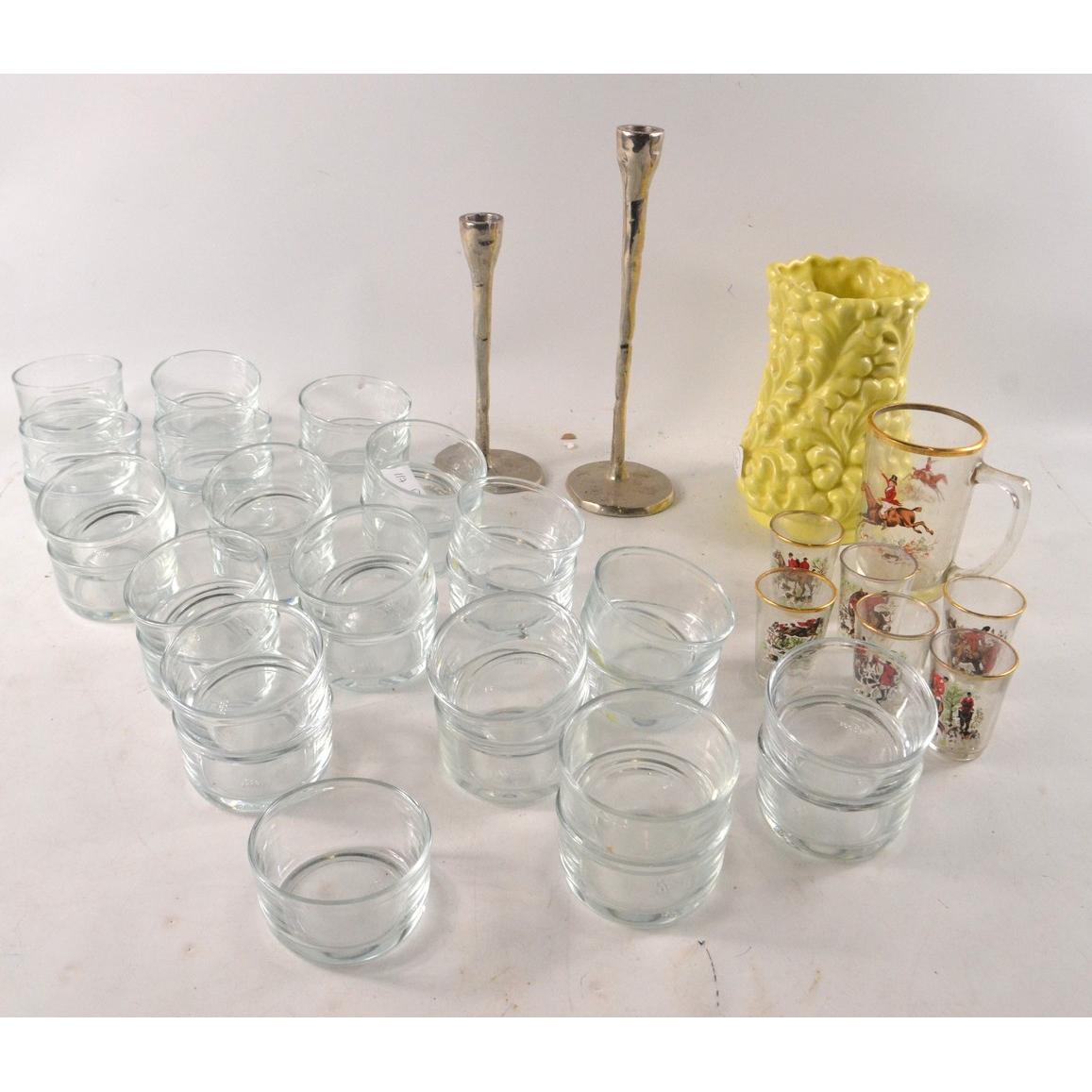 A large SYLVAC LEMON VASE 18cm height with 33 glass ramekins, a pair of arts n crafts candle sticks 20 cm height and the other 27cm height