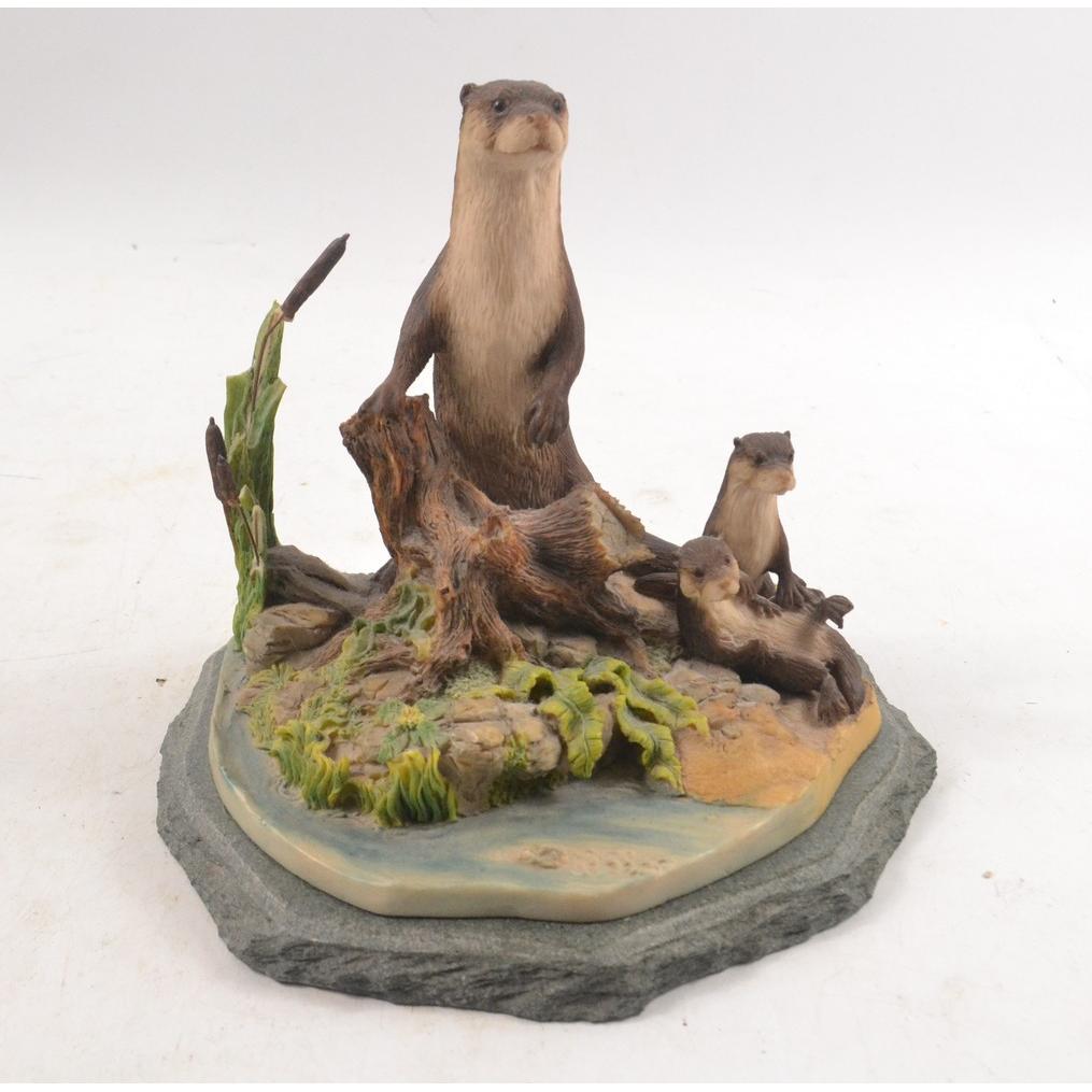 BORDER FINE ARTS Large otter and her wee ones on a riverbank scene on a slate style Detachable base H: 16cm approx