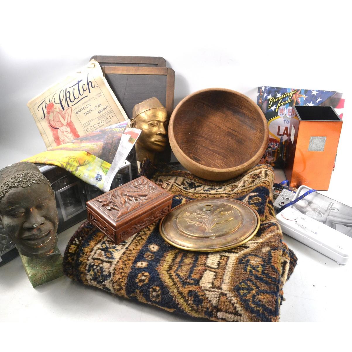 AQUALITY mixed lot to include a new pack of tea-light mini lanterns, a small hand made rug(with damage to one corner), a teak carved lidded box, Painless-Tweeze brand tweezer set still in original case, a wood turned large bowl etc etc etc