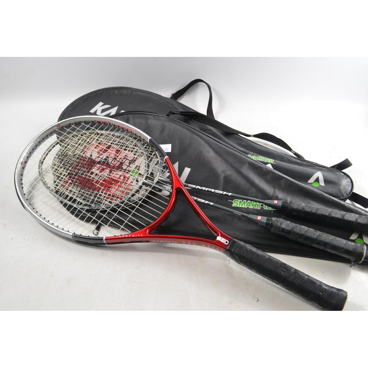 A collection of three tennis rackets and two WILSON branded badminton racketsApprox 5 pieces