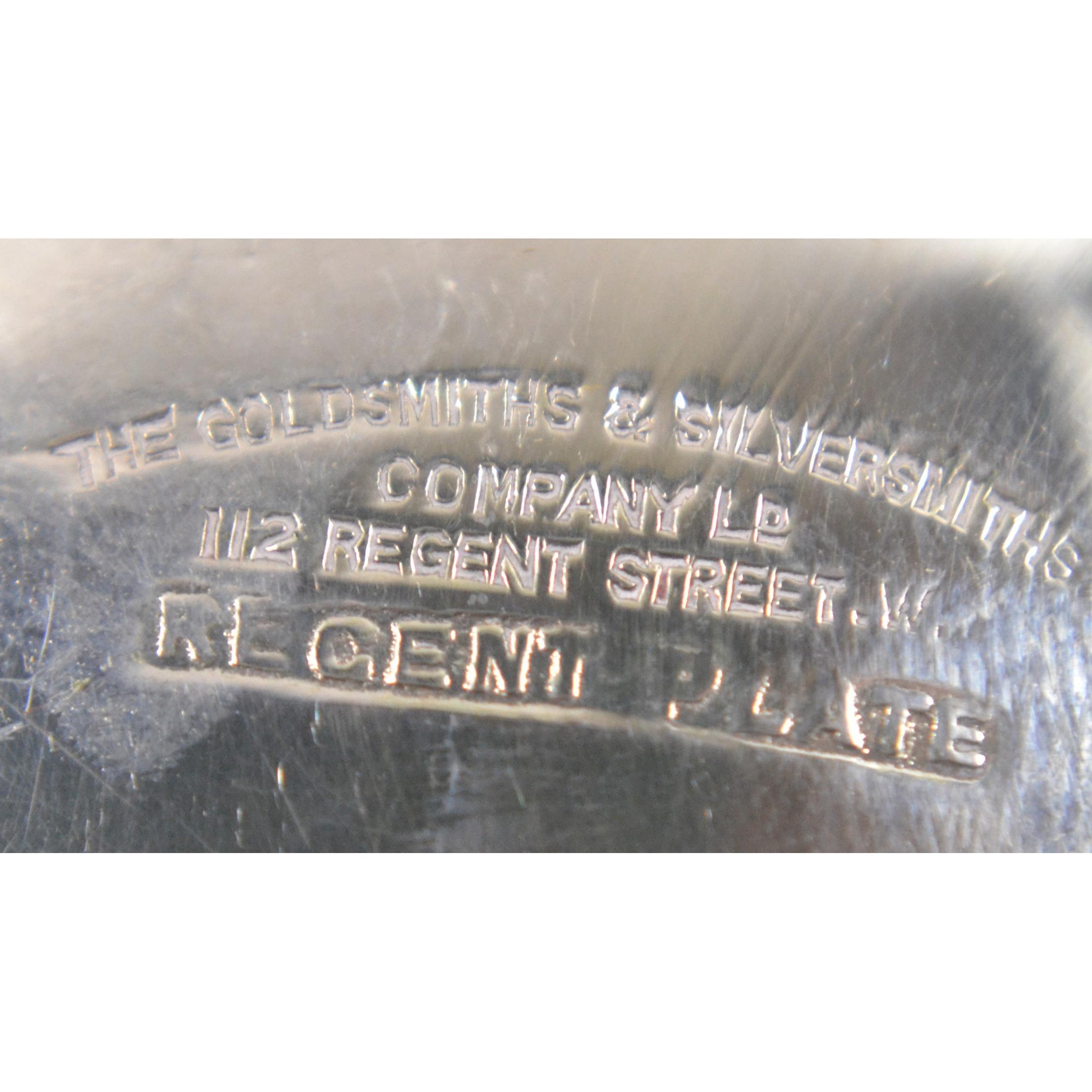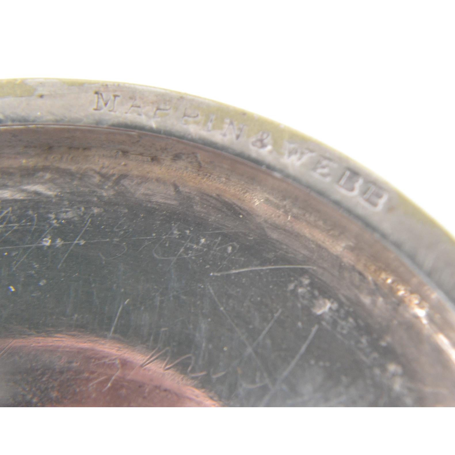 A MAPPIN & WEBB white metal cup 1878 won by JFE GREEN of Gosport 1st Prize 100yds for under 4ft 10" height, 9 cm x 12cm diameter, with a plated pepper pot 8cm height by Goldsmiths & Silver Smiths London, also matching mustard and salt pots, all with blue glass liners 6cm height x 6cm x 4cmwith also an early 20th century small picture frame in Hallmarked silver