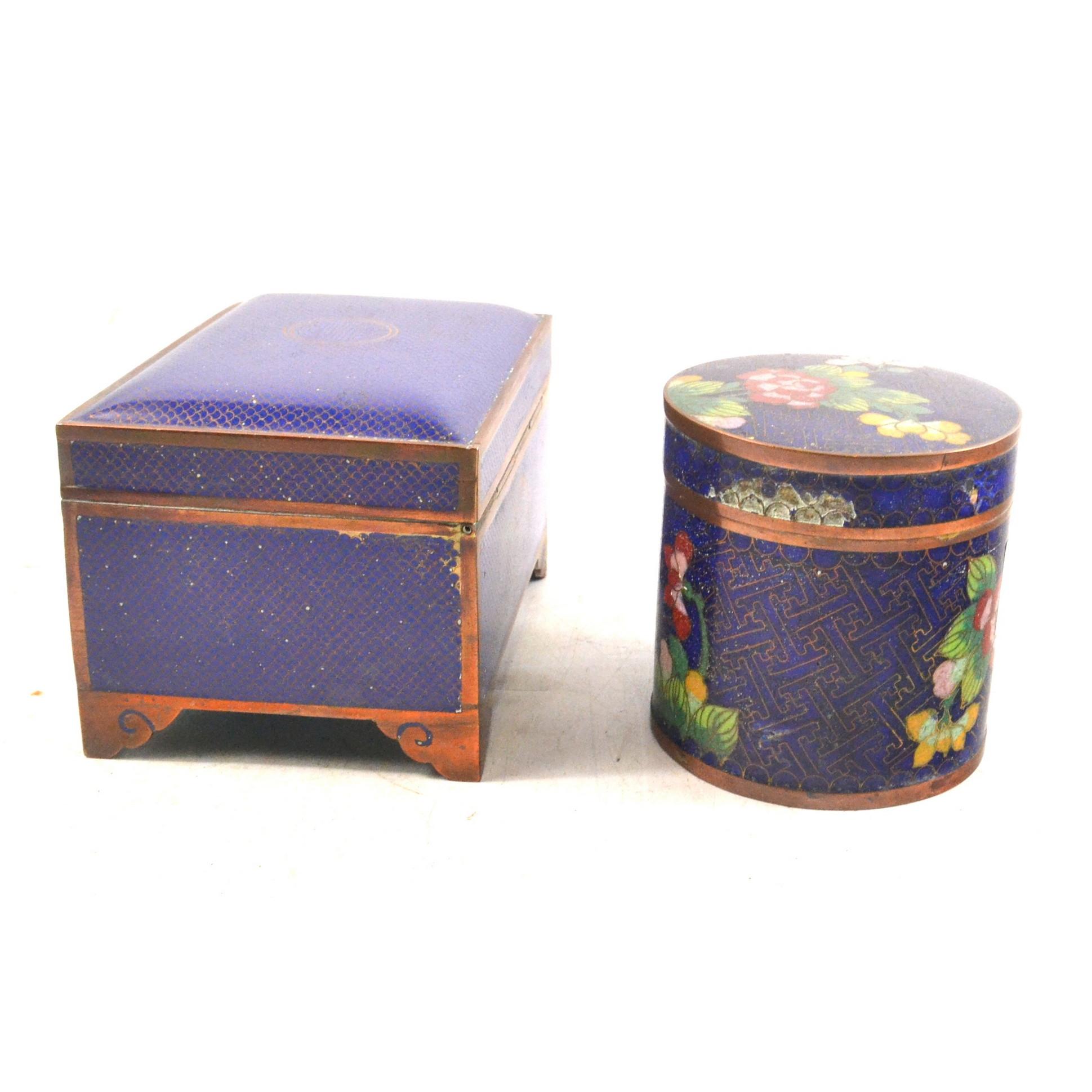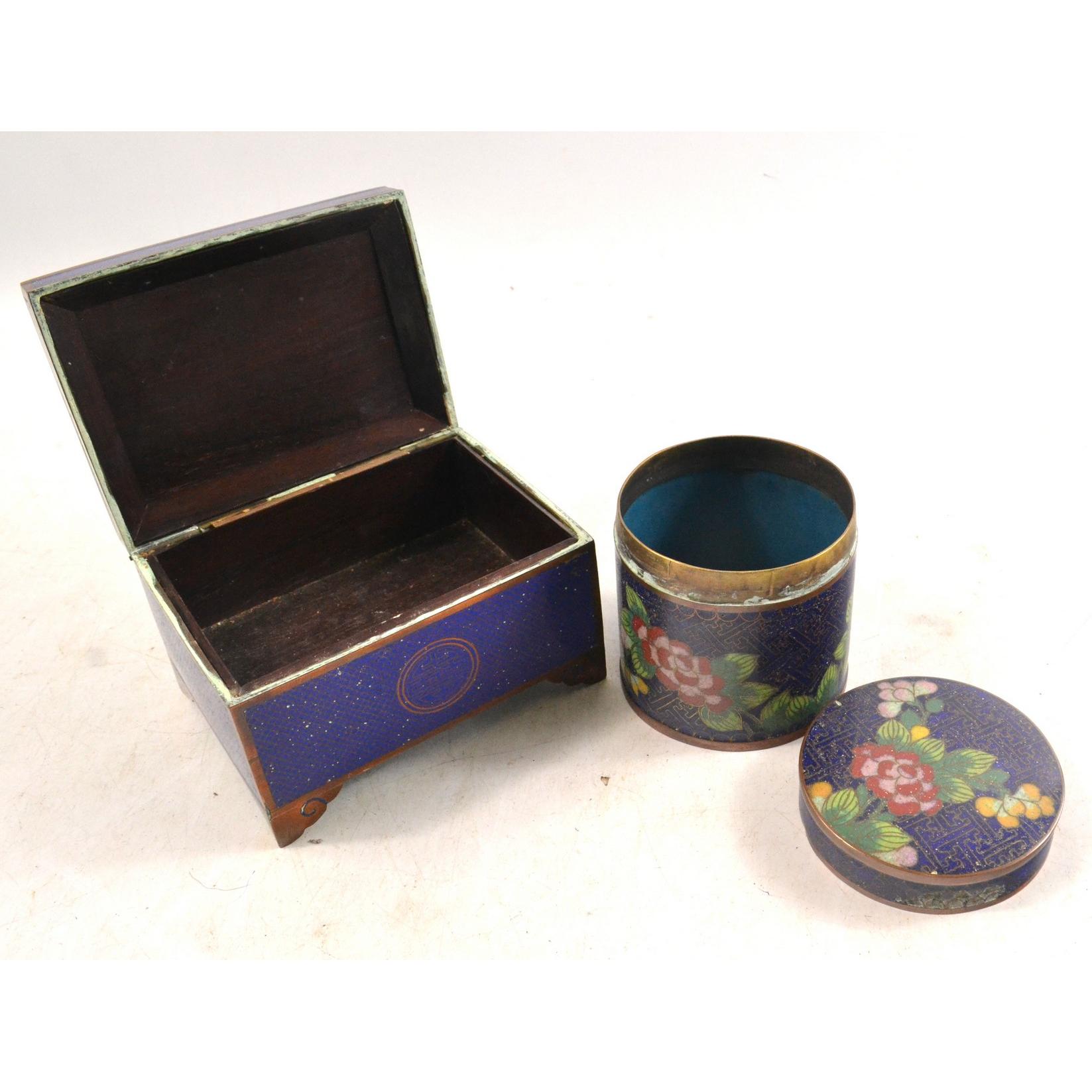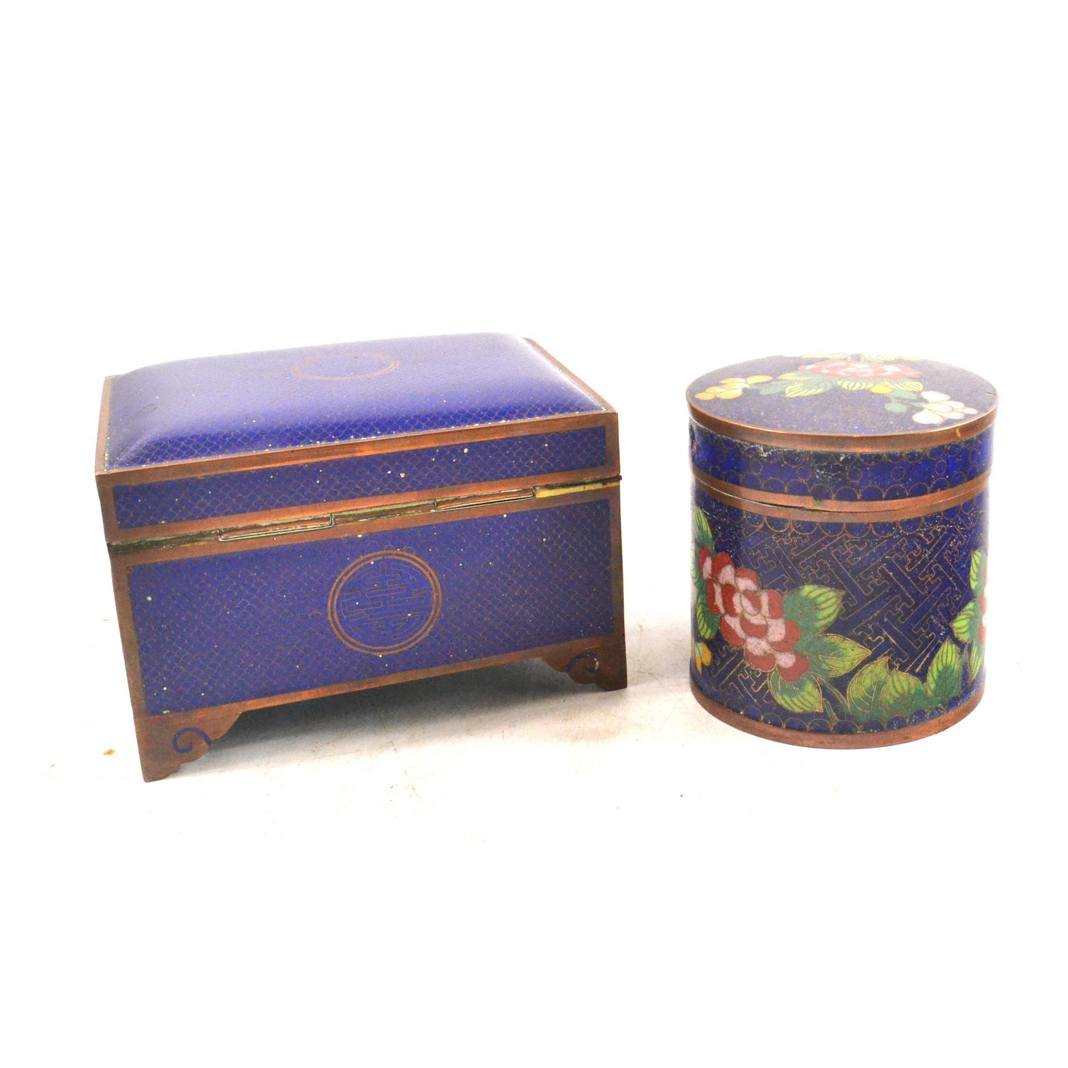 Two vintage pieces of CLOISONNE to include a lidded container (h=8cm, d=8cm) and also a nice quality lidded box in royal blue with copper trim (length 12cm, height 8cm, depth 9cm)Approx 2 pieces