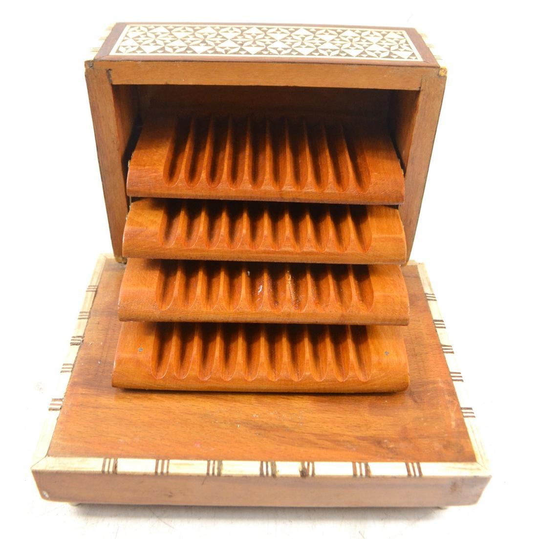 An EGYPTIAN musical handmade tiered cigarette box with inlaid mother of pearl etcL: 18cm approx H: 9cm approx D: 13cm approx