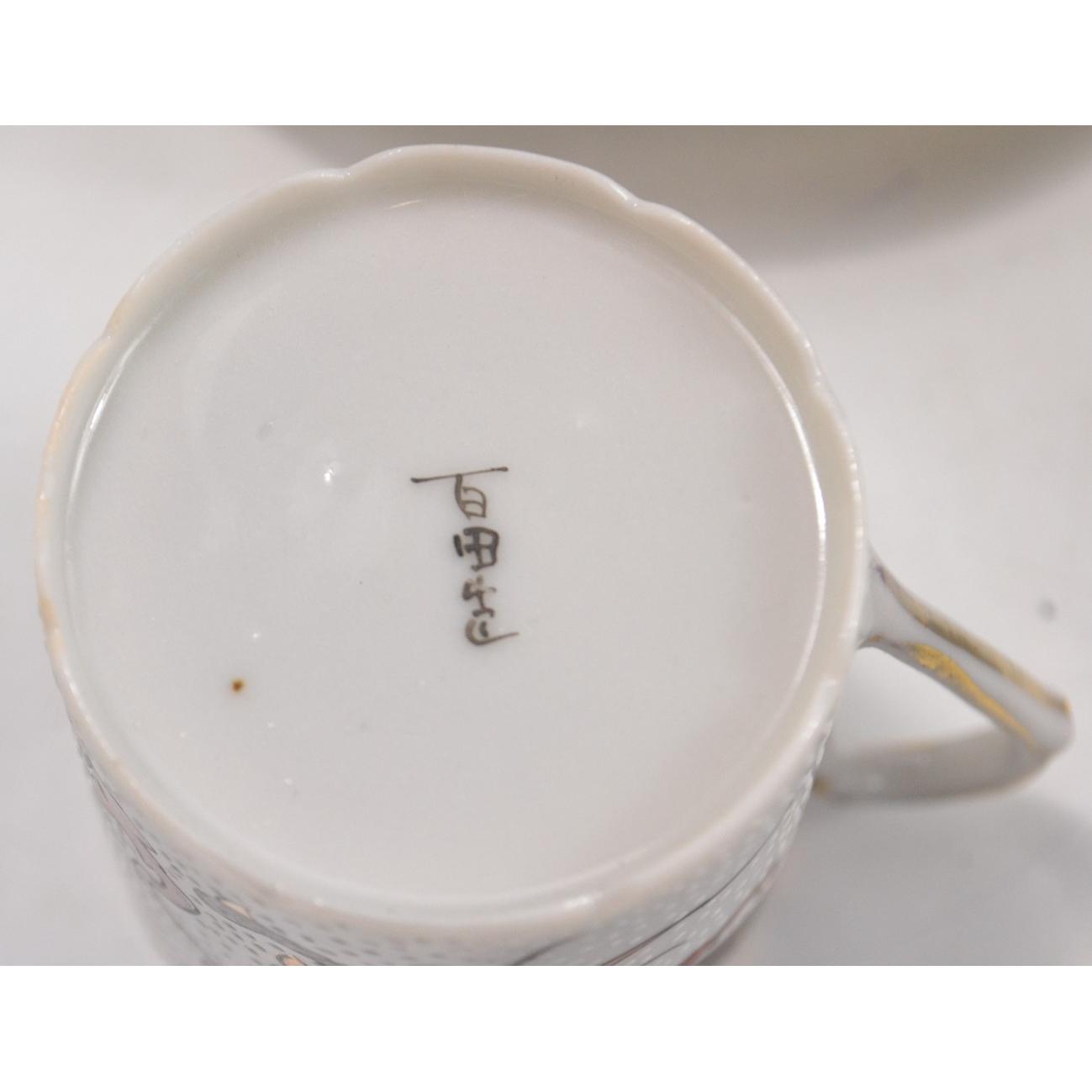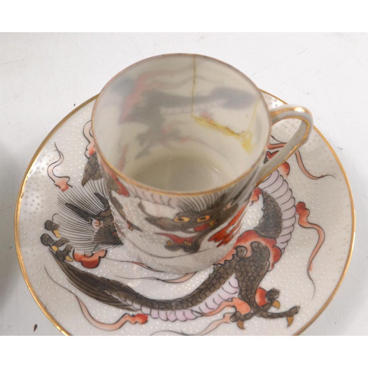 Japanese style fine egg shell set with 6 cups and 6 saucers in dragon design. Teapot comes with strainer attachmentW: Saucer: 10.5cm approx H: Cup: 5.5cm approx Approx 14 pieces