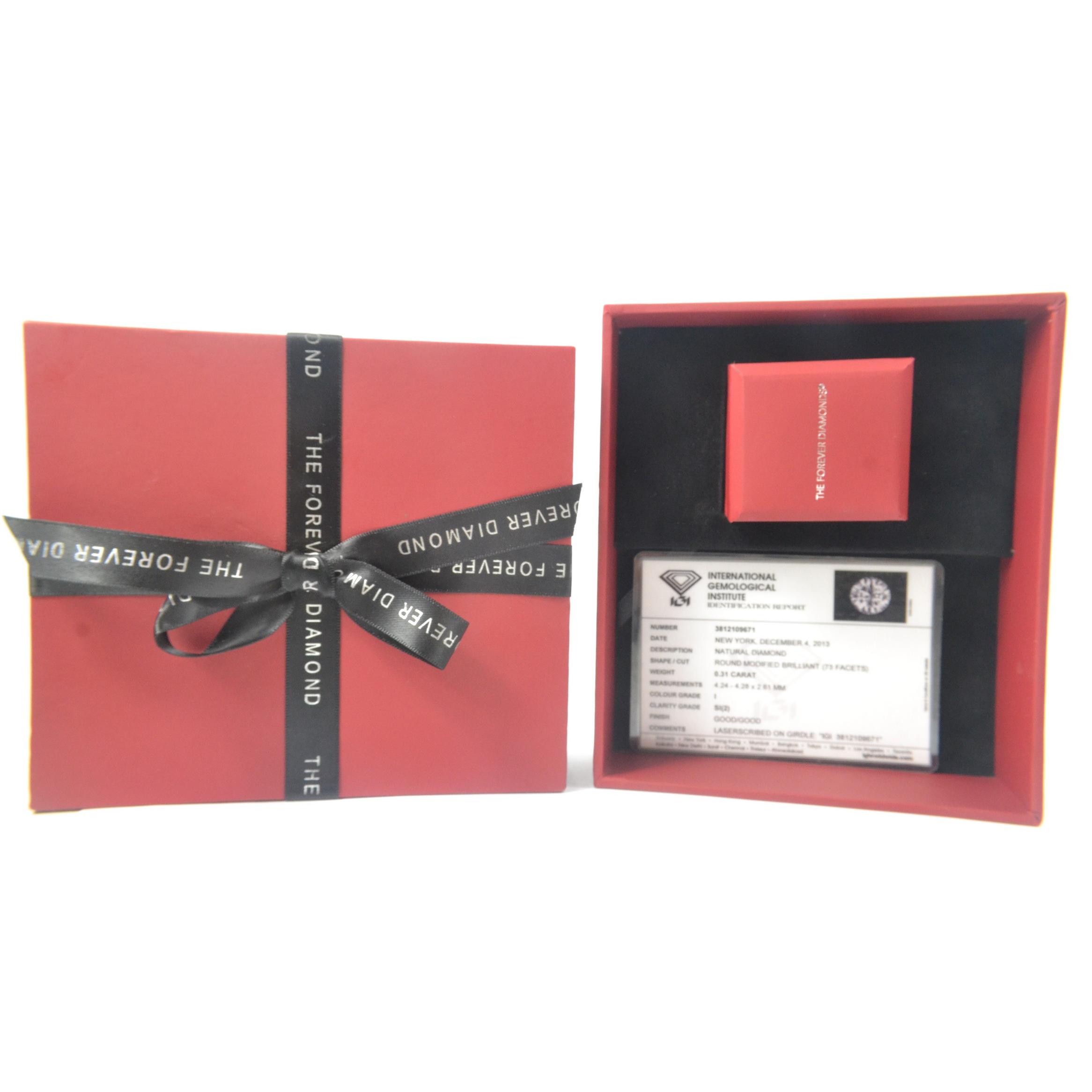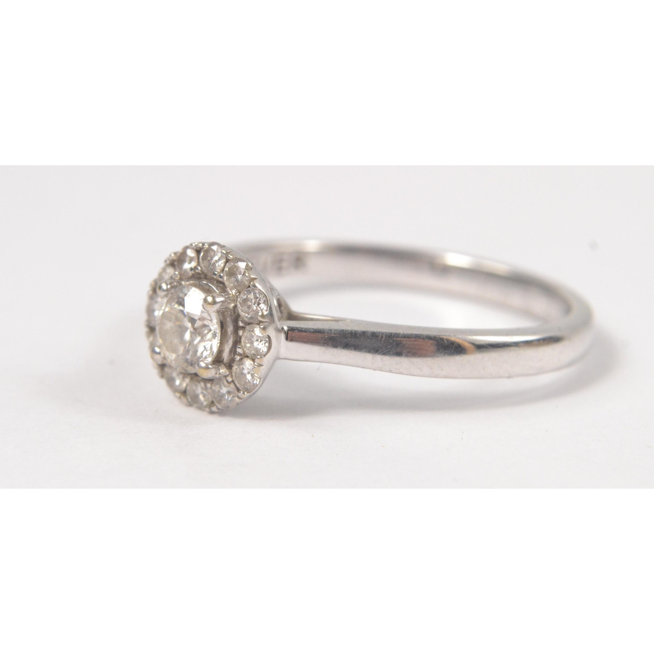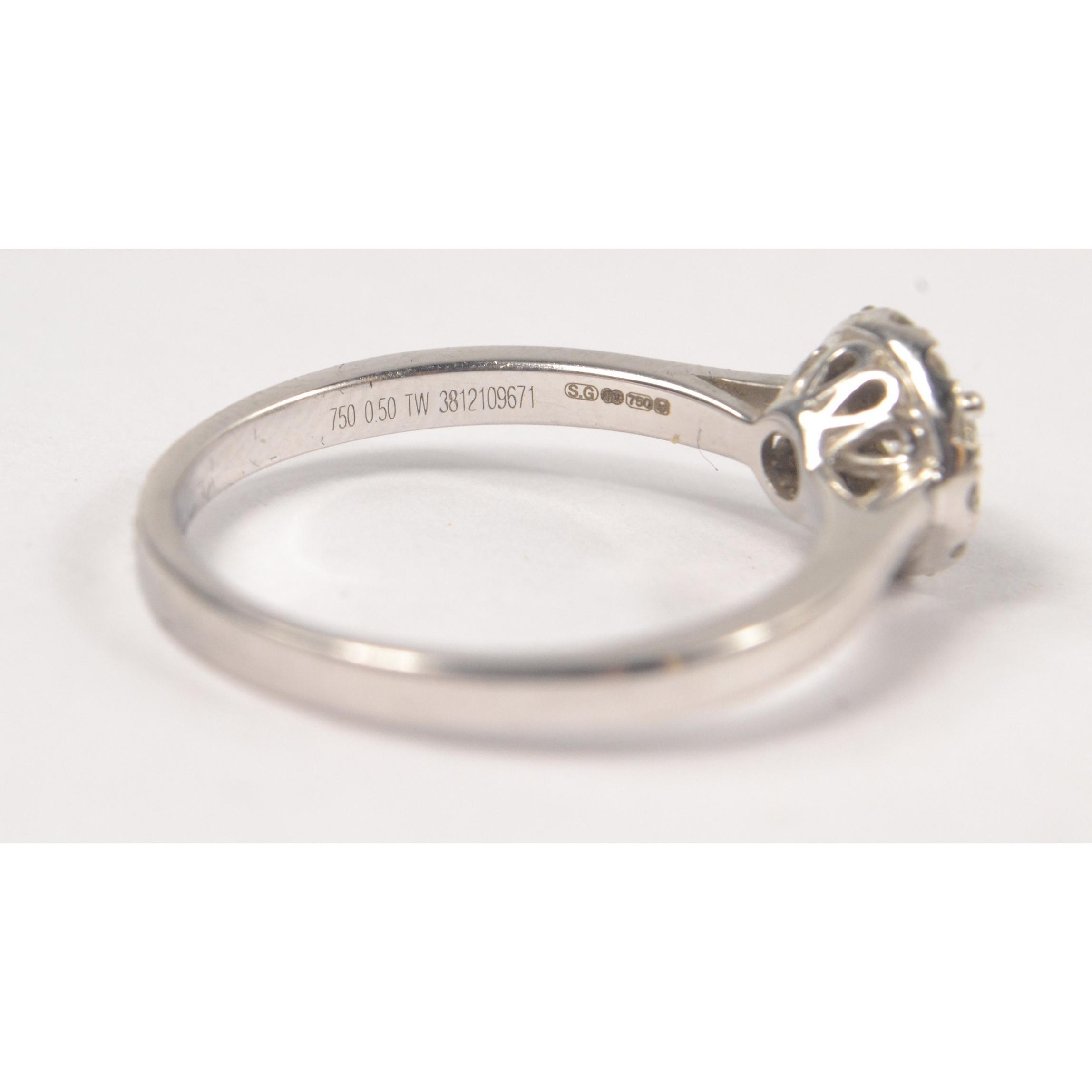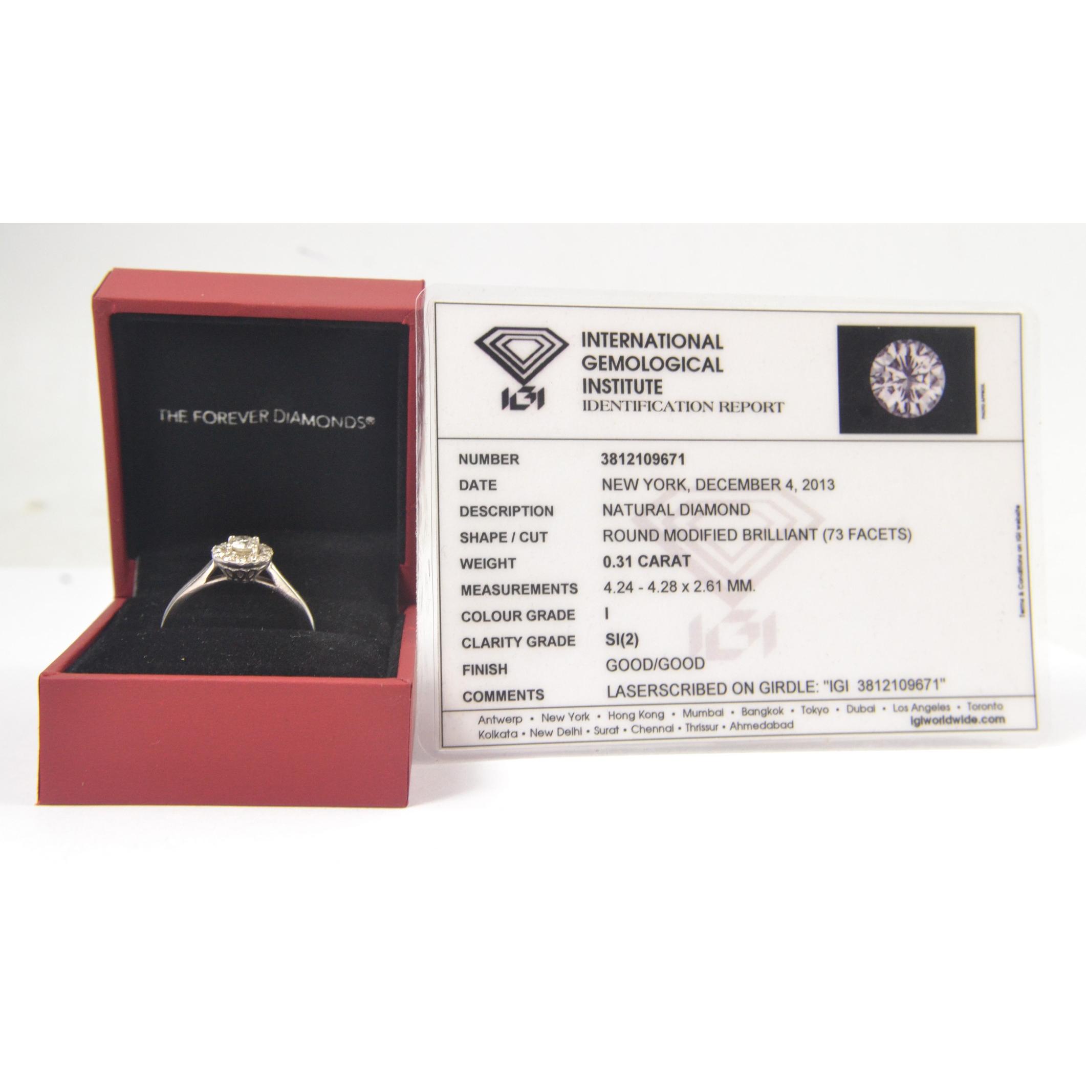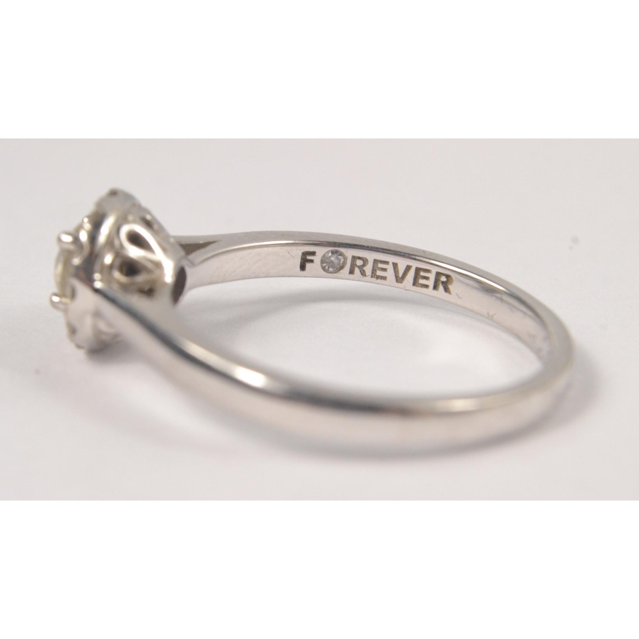 A white gold 750 stamped white gold and diamond (tested) inset (ring states 0.5carat in weight for the diamonds) The Forever Diamond identification report certificate states 0.31ct as the weight of the central stone, Customer paid £2600 in late 2018(gross weight shown)