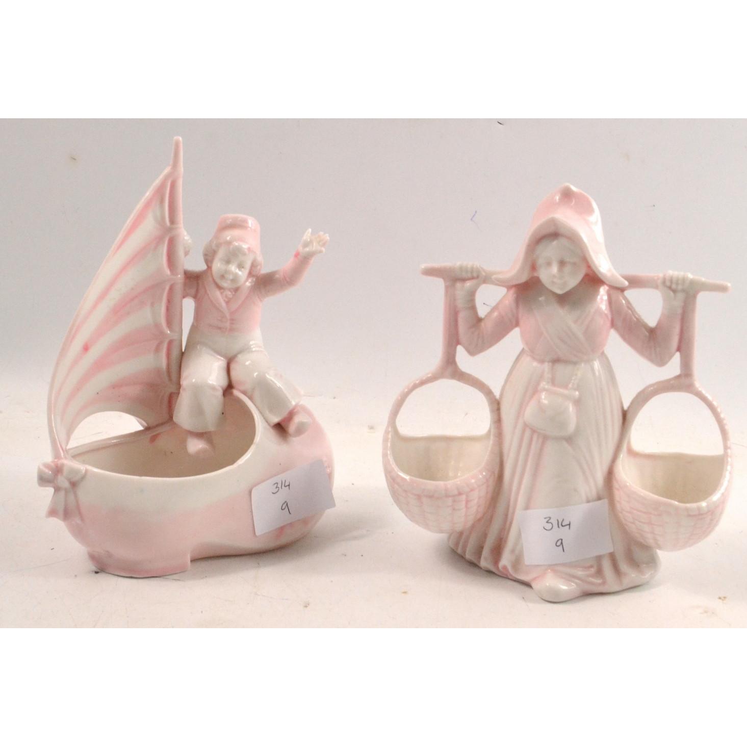 Two vintage pale pink young girl and boy figures with indistinct markings to base. One young girl carrying 2 woven baskets (H: 15.5cm approx) and young boy sailing a shoe (H: 17cm approx)Approx 2 pieces