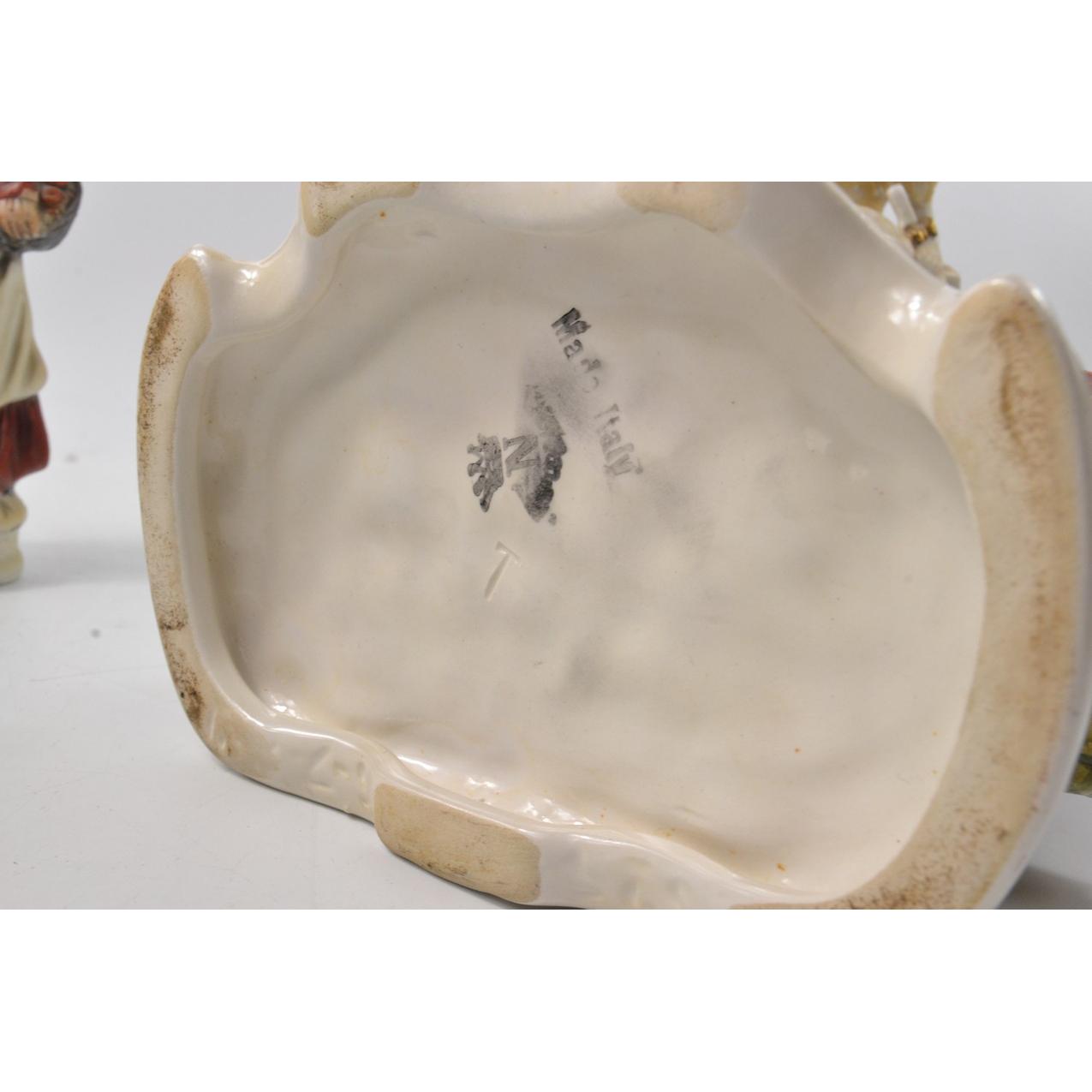 Selection of figures to include Capodimonte style Tramp on bench with wine cup, lady with yellow dress, elderly lady with fruit basket and elderly gentleman smoking pipe