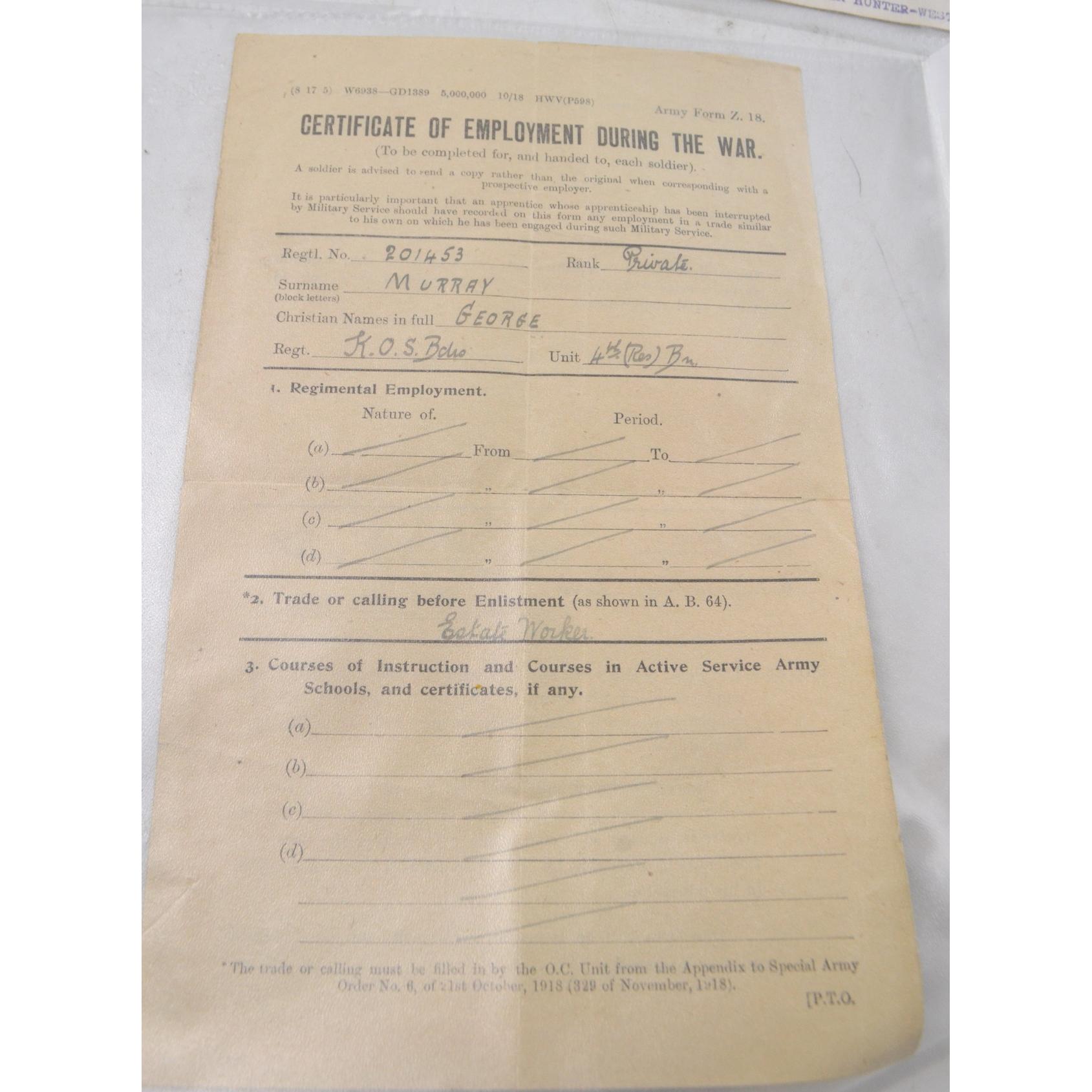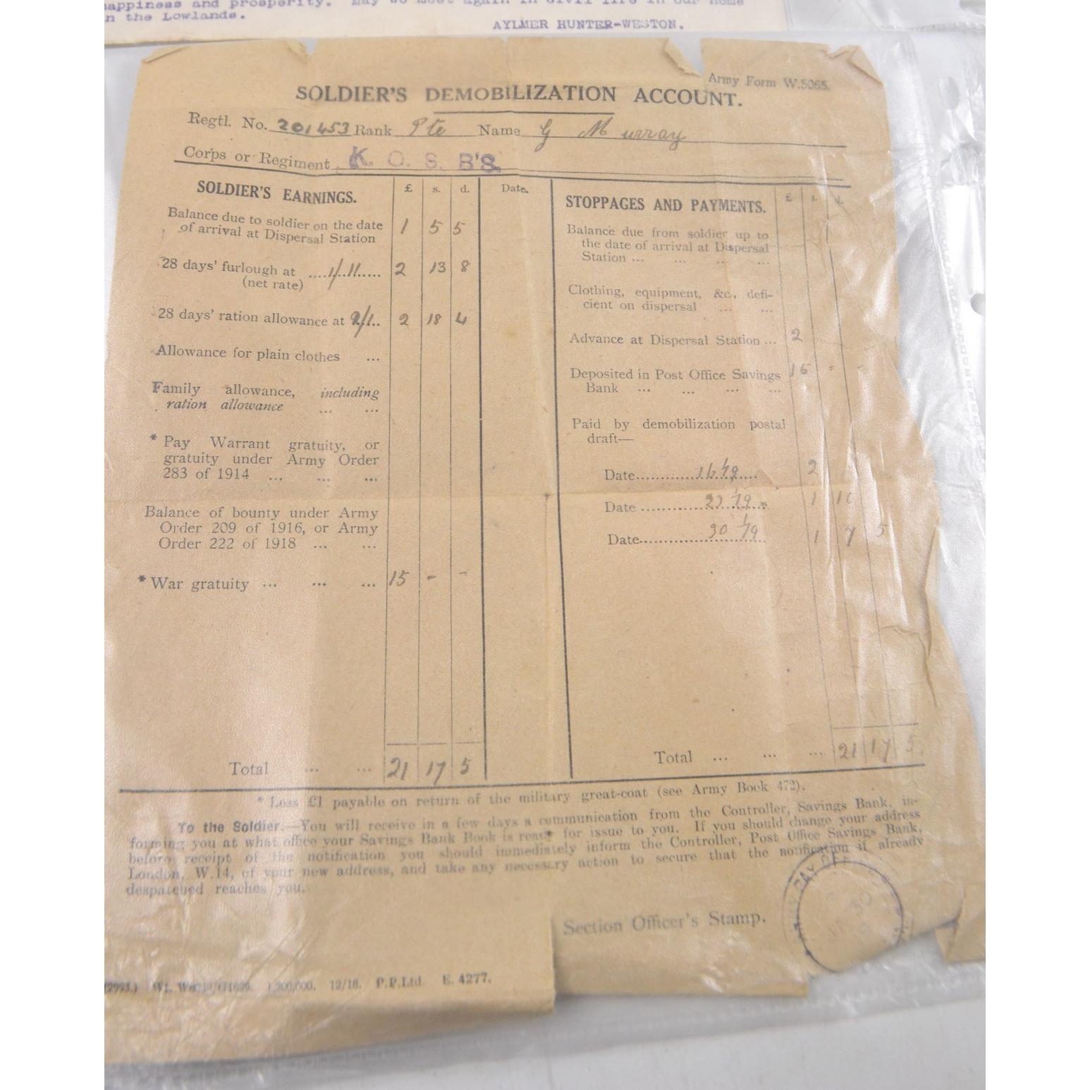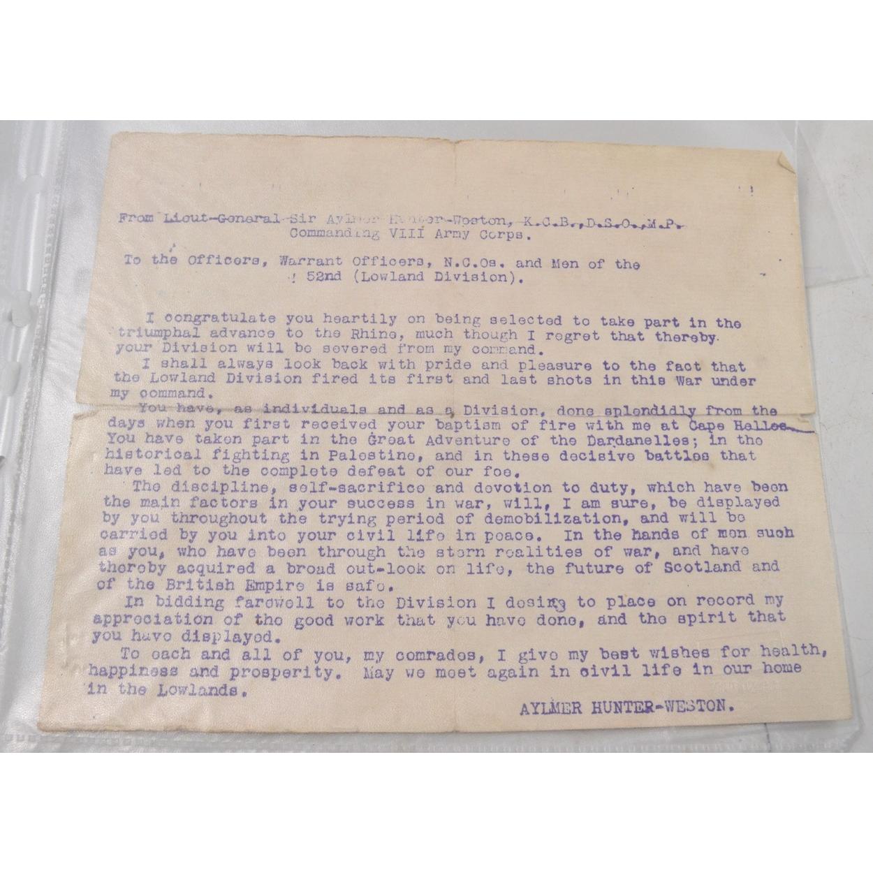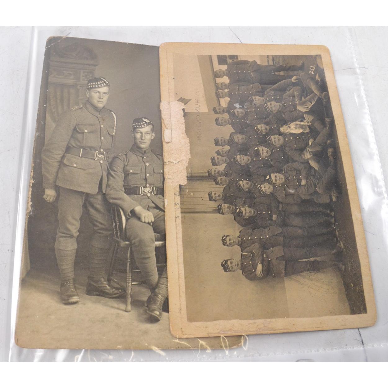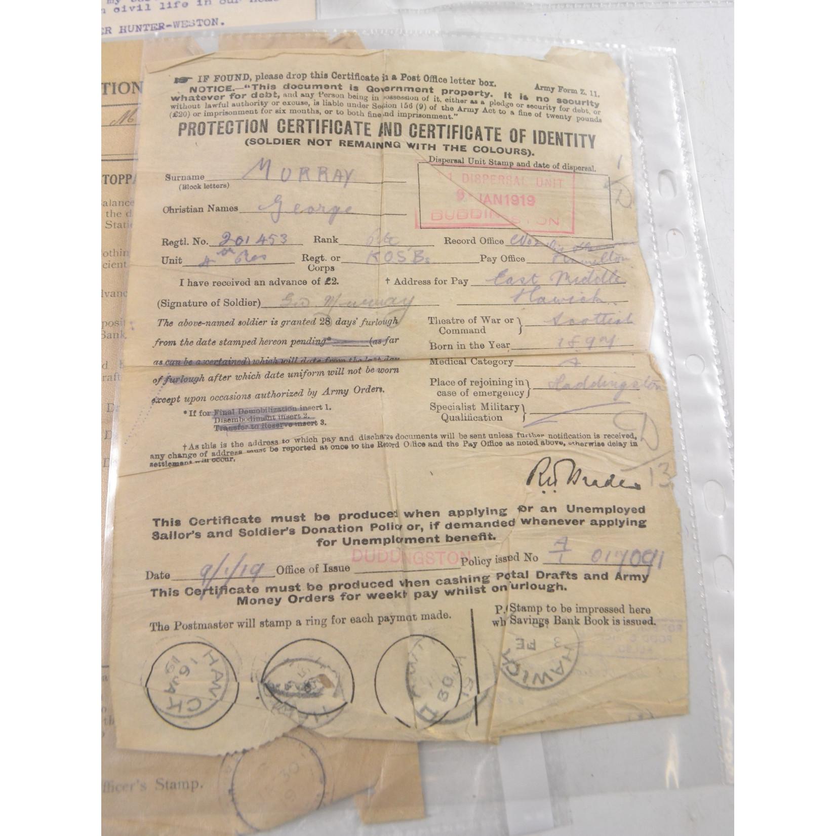 A folder to include Mainly KOSB photographic memorabalia to include three cap or lapelle badges 'HOLD FAST' , Identity certificate, and a Congratulatory letter from a Commanding Officer