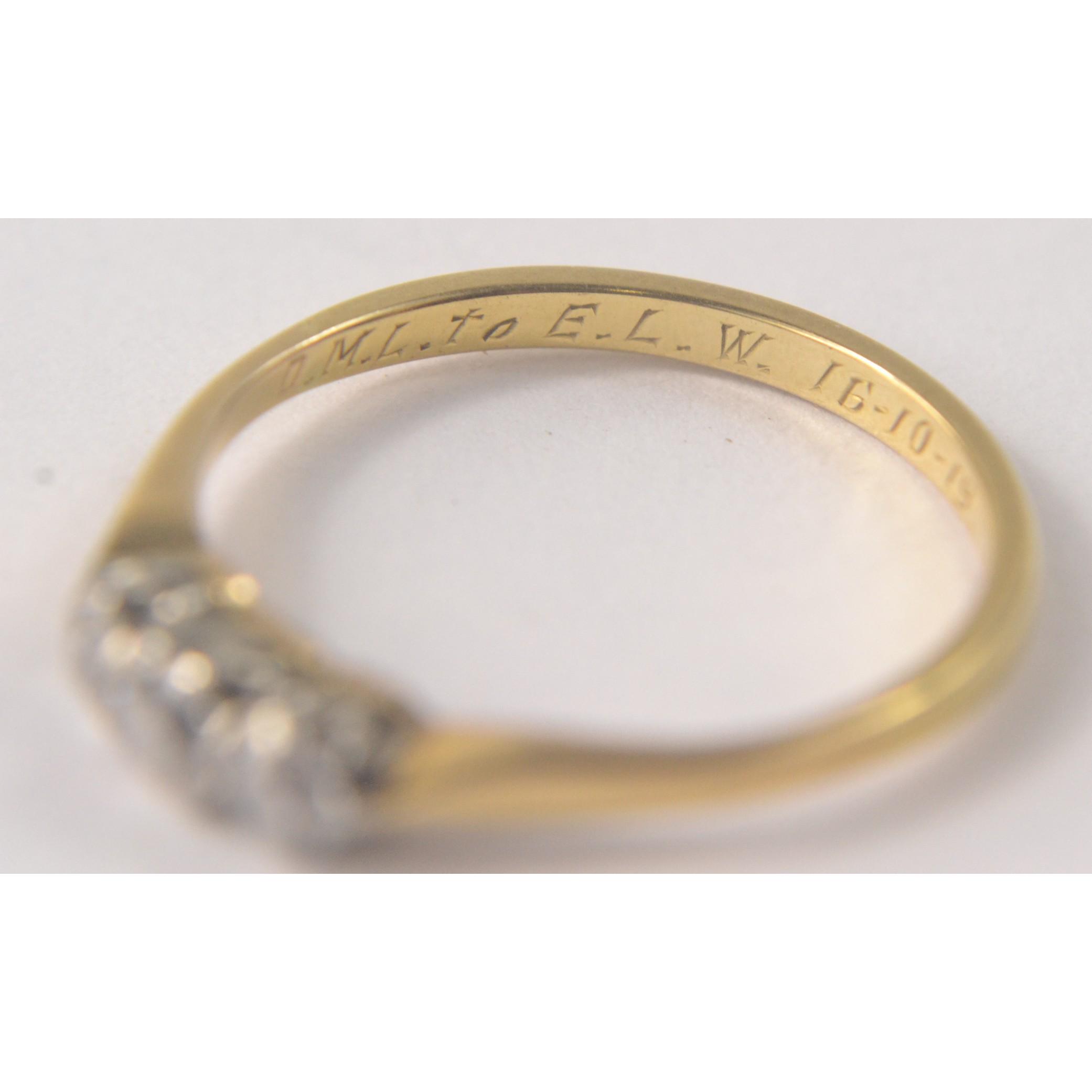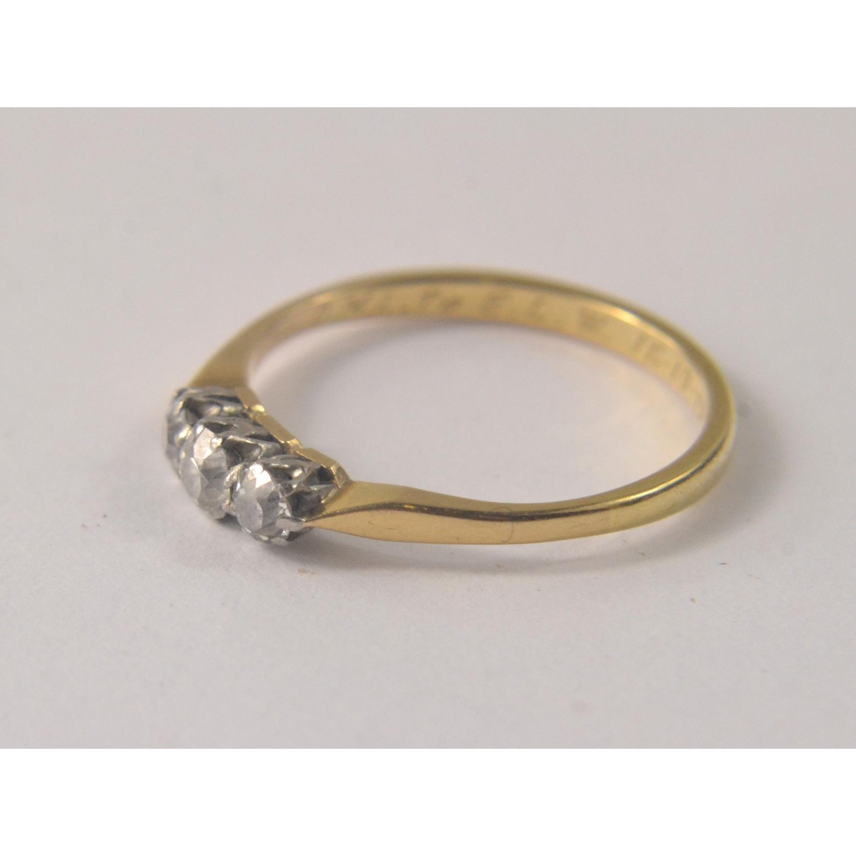 DIAMOND Three Stone unmarked, tested as platinum and 18ct gold , to include two round early brilliant cut stones, measuring 3.7mm and 3mm, also one round Swiss cut stone measuring 3mm diameter, total diamond weight approx .25carats [size M ]