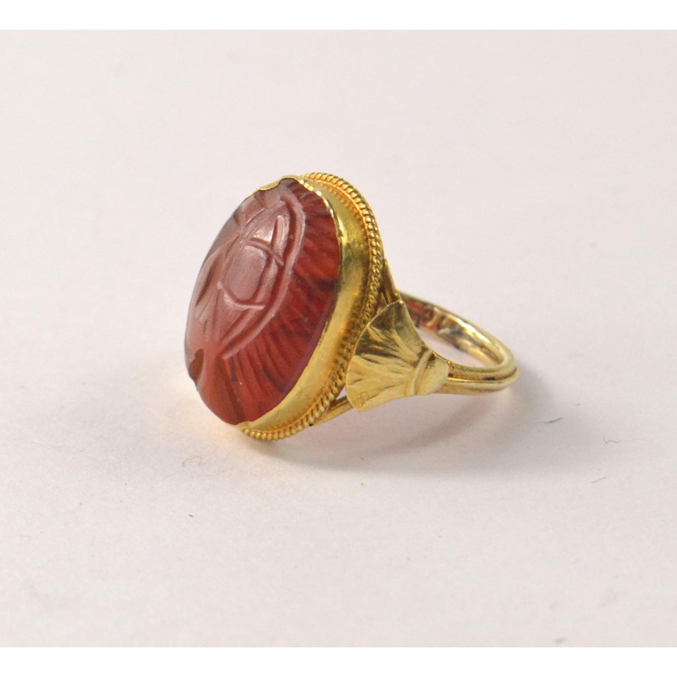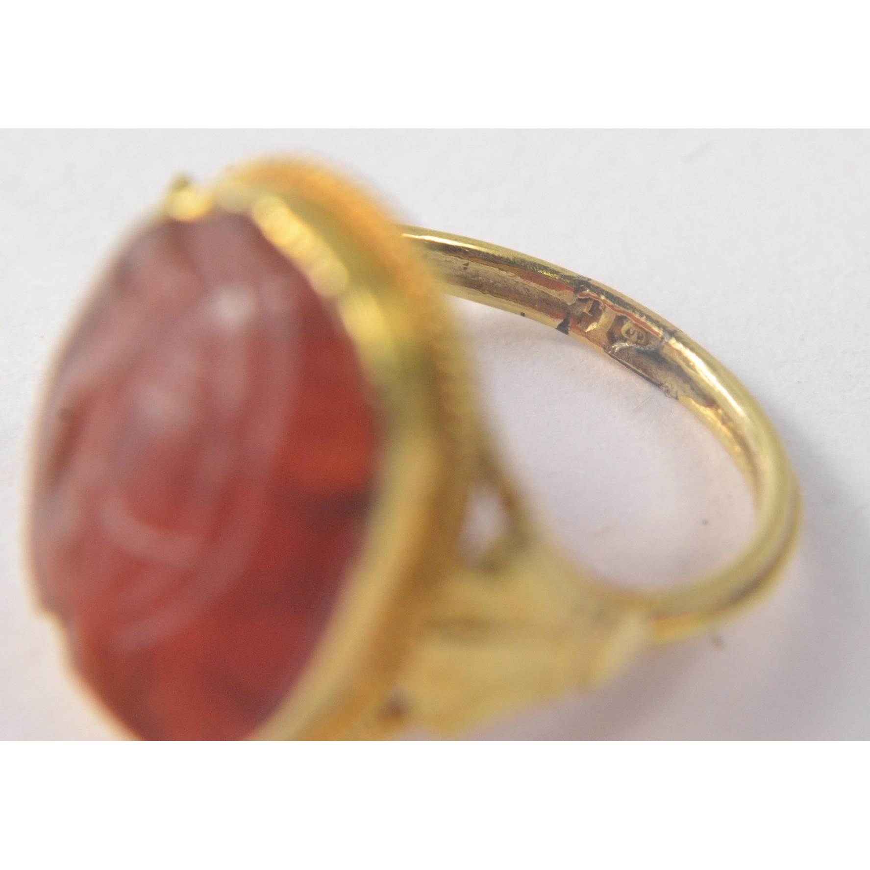 CARNELIAN Dress ring with oval cabouchon cut stone, Hallmark indistinct and valued as 22ct gold weight gross 3.7g [size J [