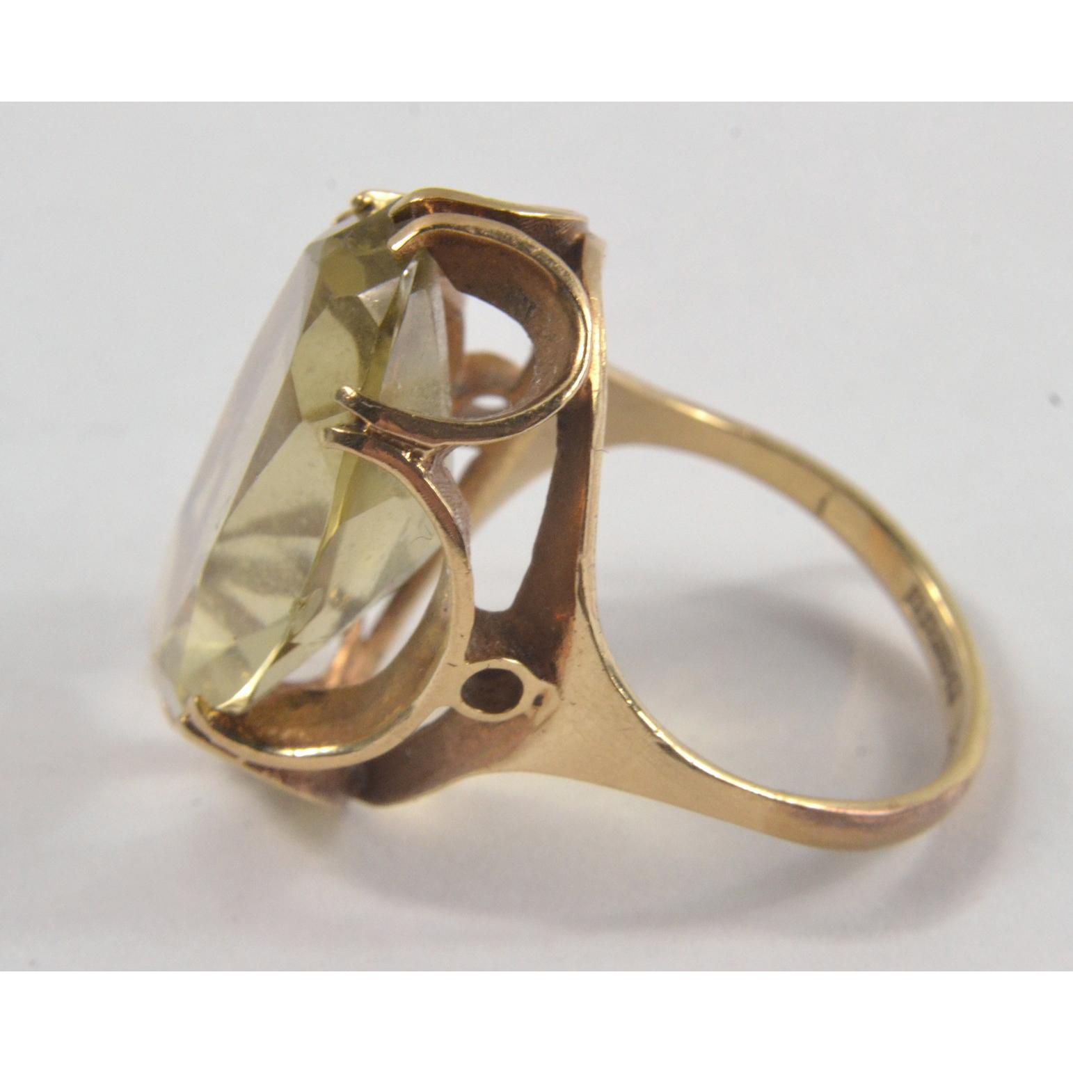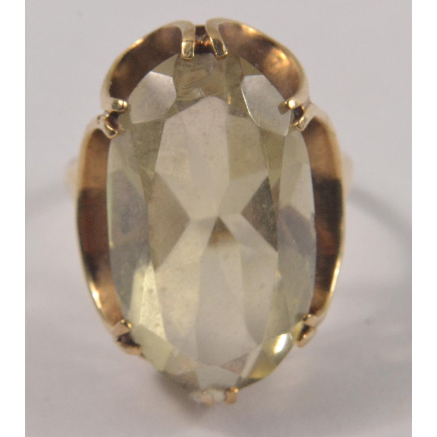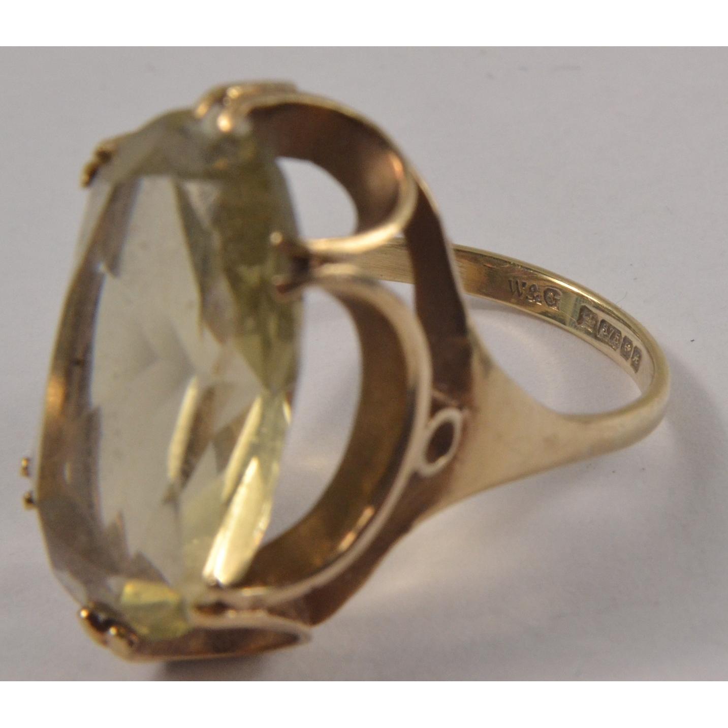 9ct hallmarked gold ring set with large oval cut quartz stone [L: 23mm W: 13mm approx] set with horseshoe design [size: Q]Gross weight approx 7g