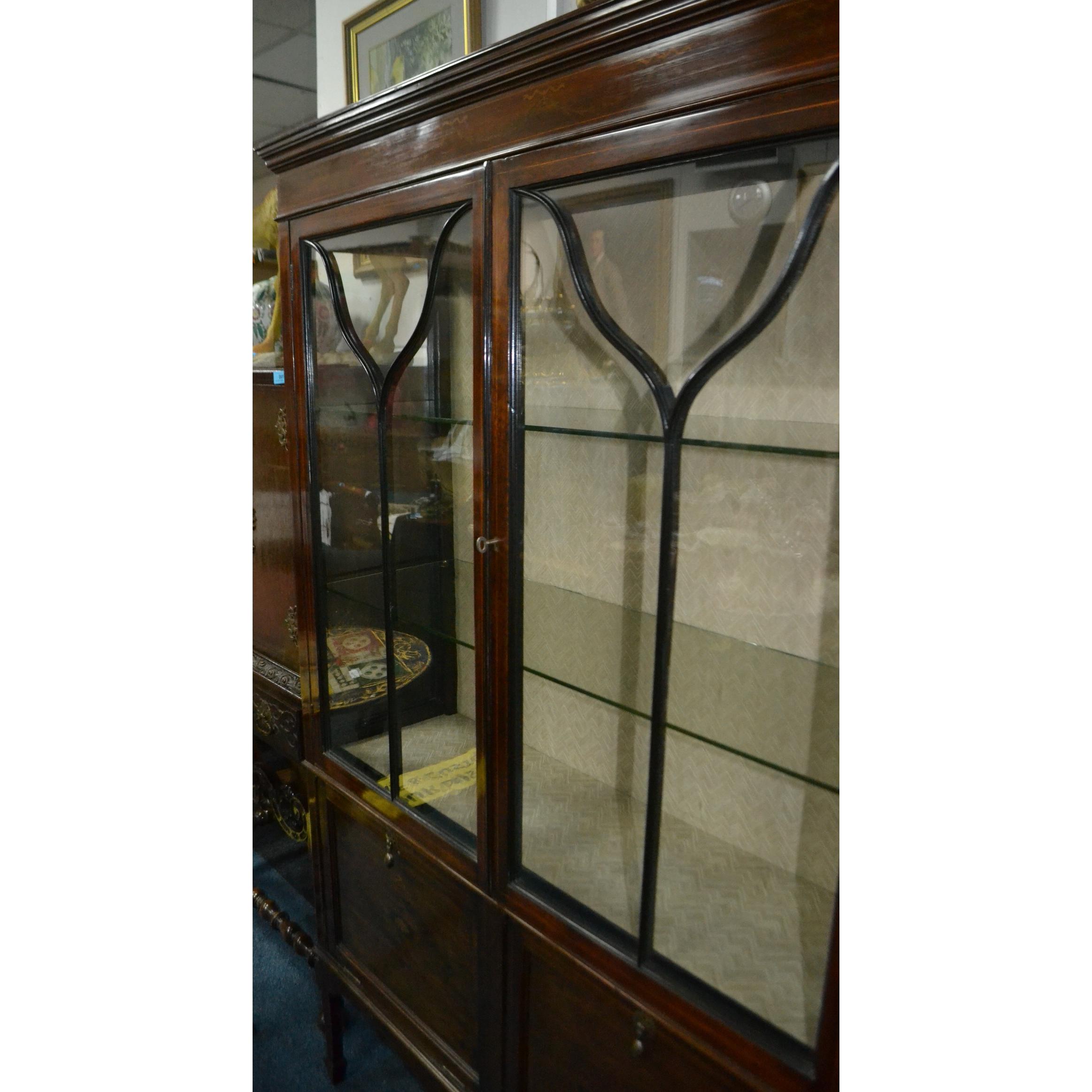 A SUPER QUALITY c1930's vintage mahogany display cabinet with two glass shelves over two cupboards with quality inlaid marquetry and string-inlay border dimensions102 cm wide x 30cm depth x 168cm height approx