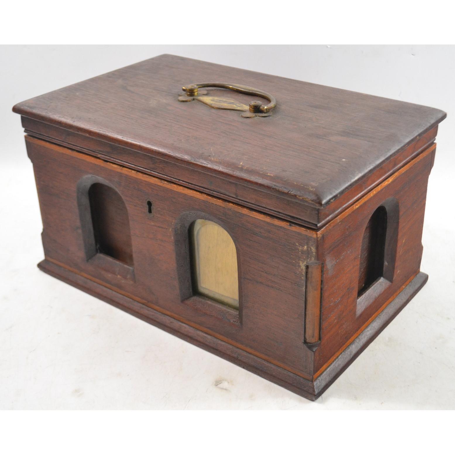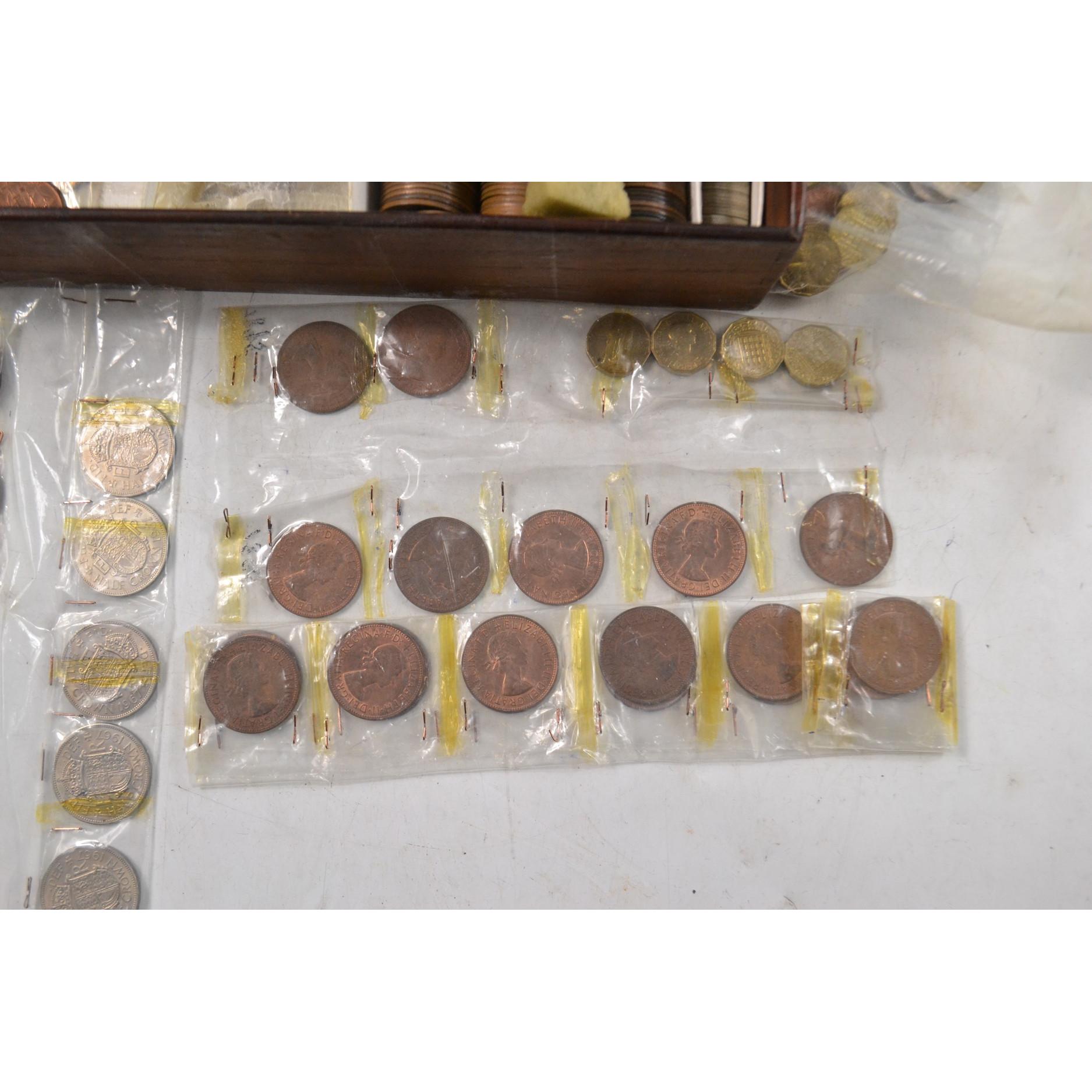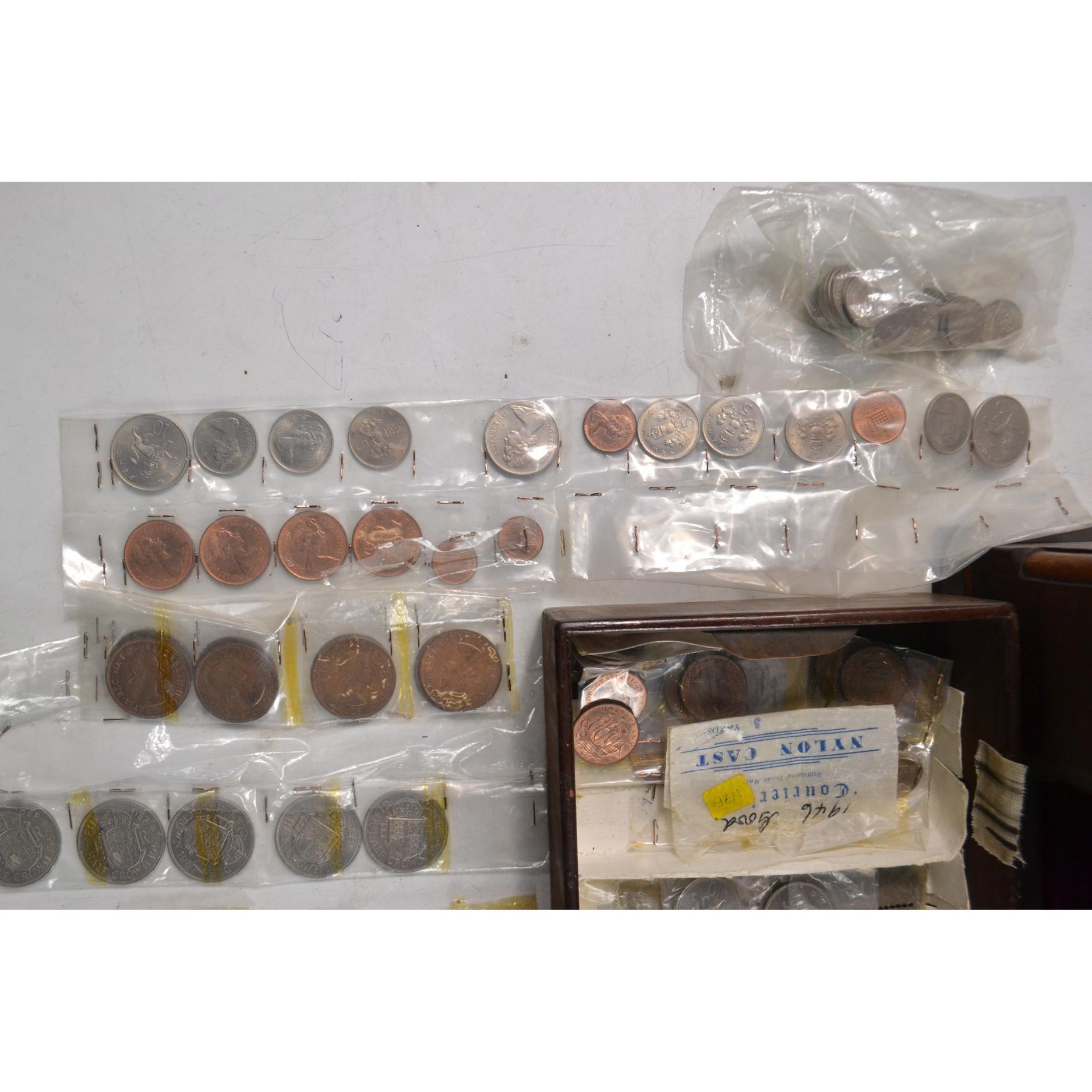 A VICTORIAN mahogany box to contain a large selection of coins and two 10 Shilling notes as per list