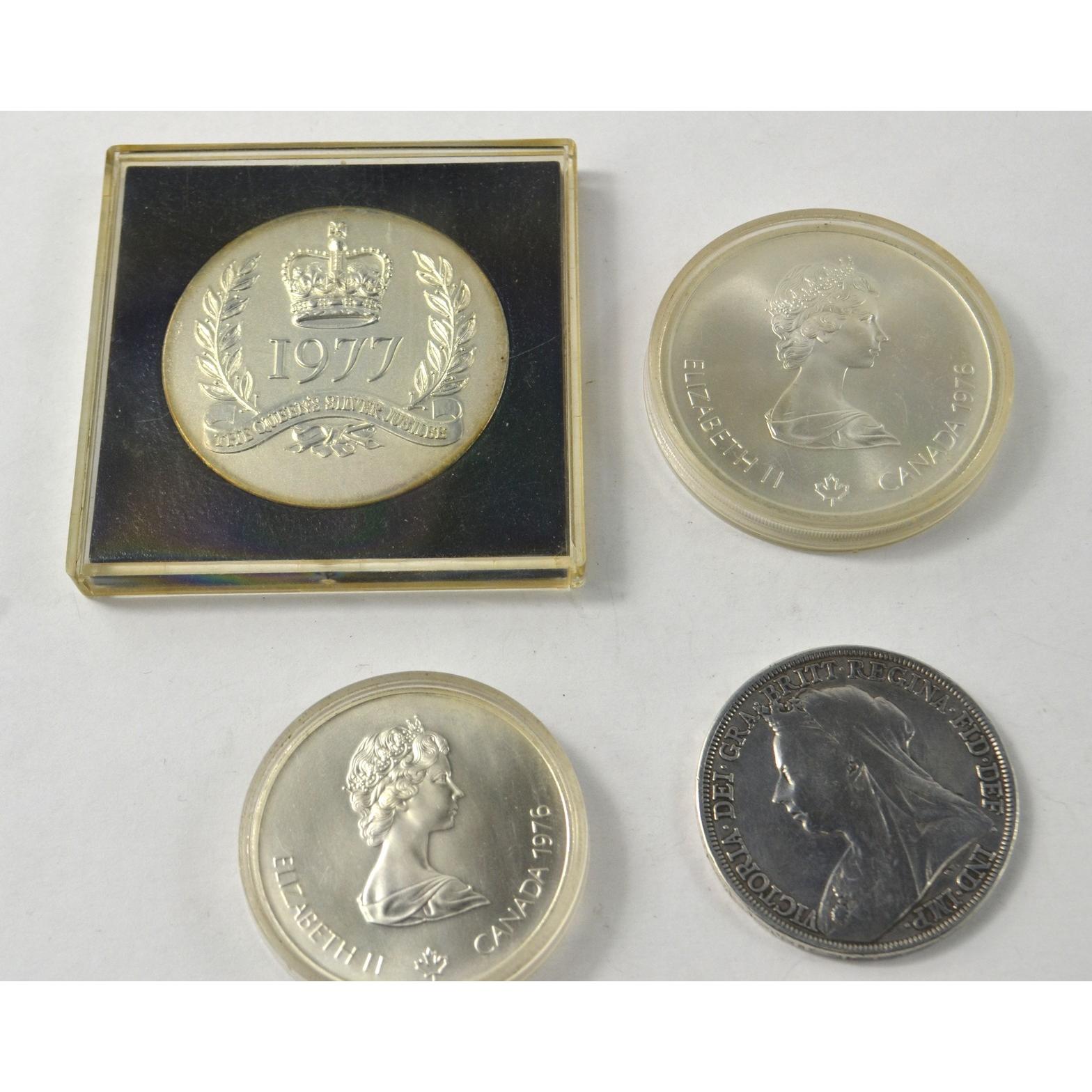 A VICTORIA 1897 SILVER Crown with two Canadian Olympic 5 dollar and 10 dollar commemorative coins and LOCAL INTEREST PEEBLES ROTARY CLUB FAIR The Queens Silver Jubilee Trust medallionApprox 4 pieces