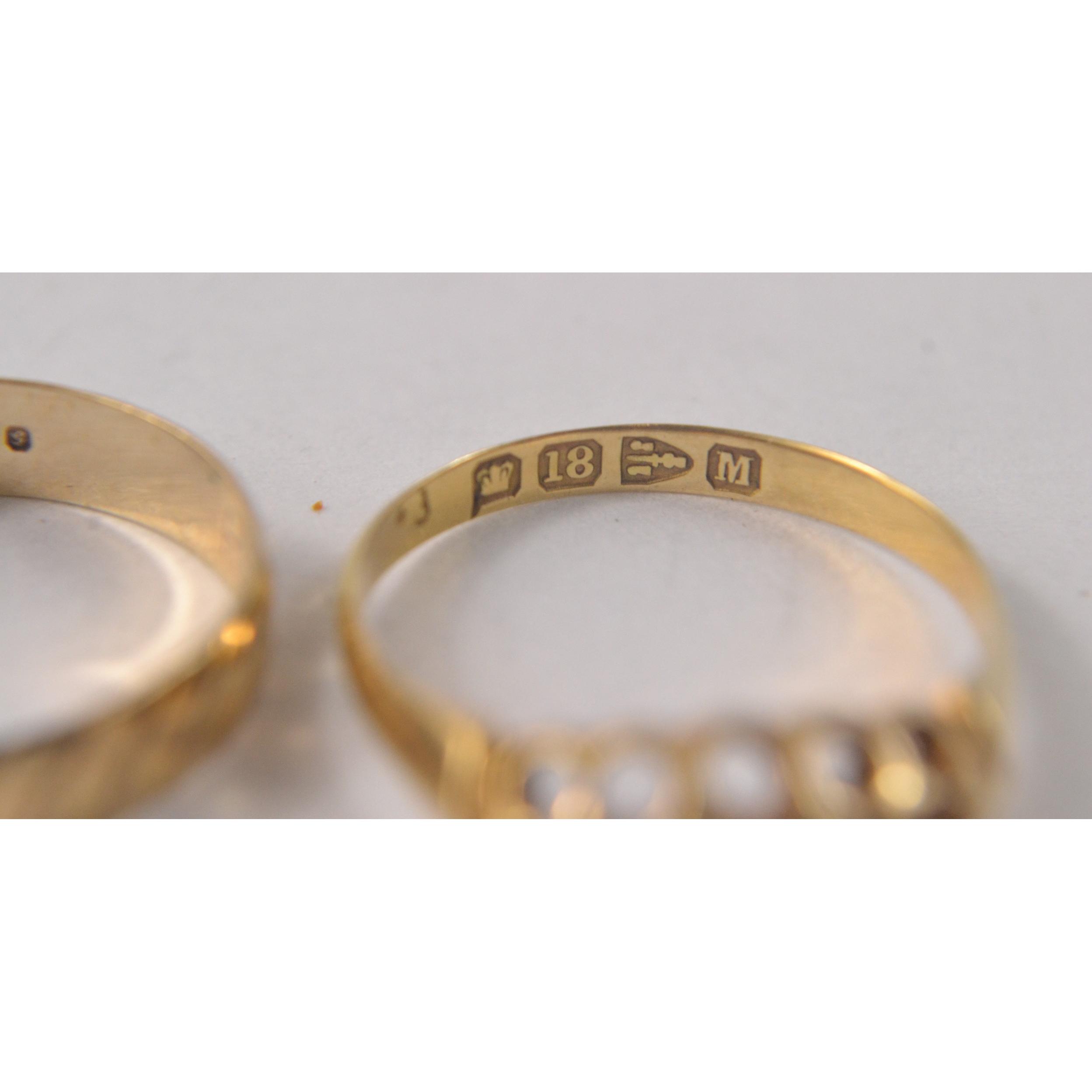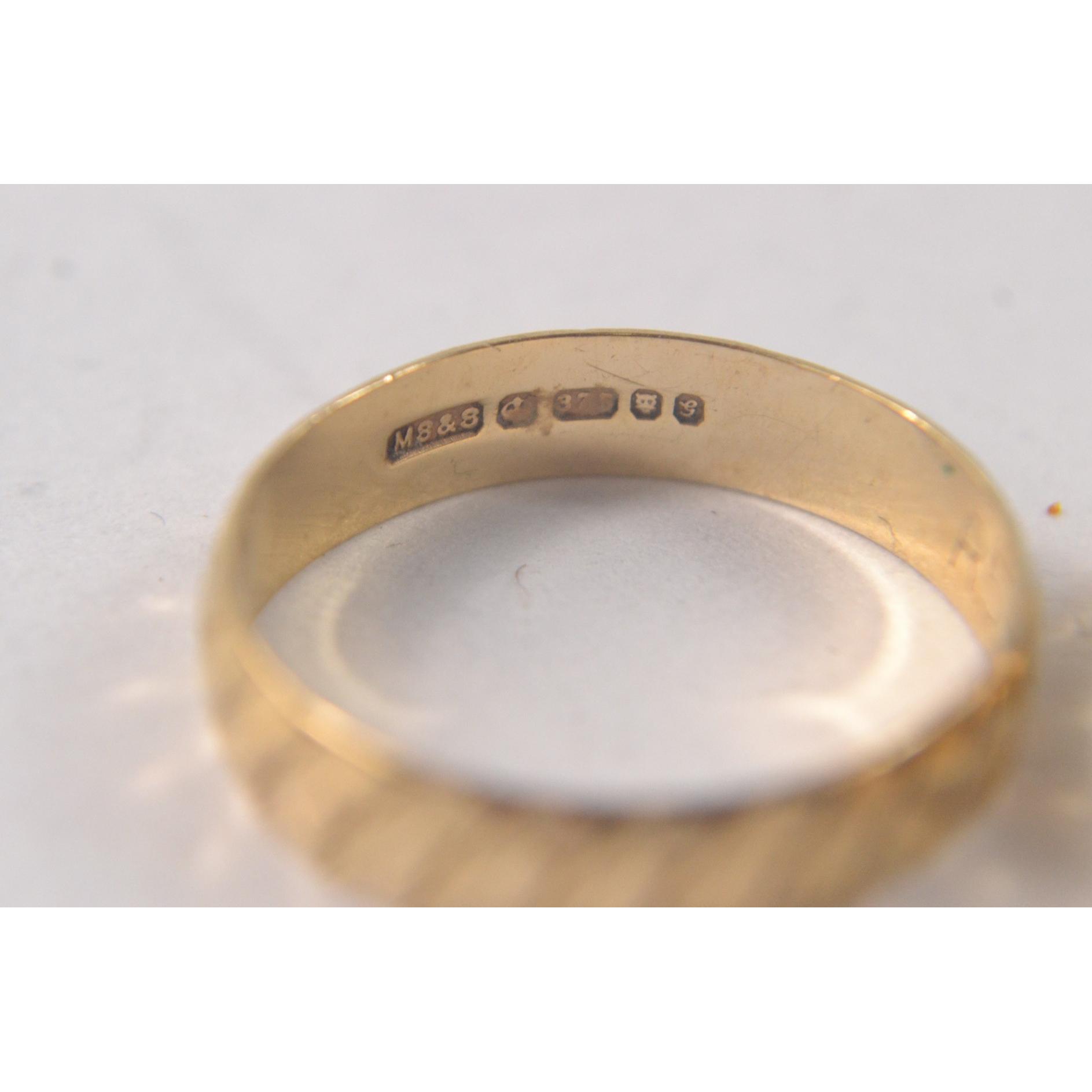 375 stamped yellow gold band ring size K 1.25g weight, with also an 18ct stamped diamond and garnet inset ladies ring size N 1.75g grossApprox 2 pieces
