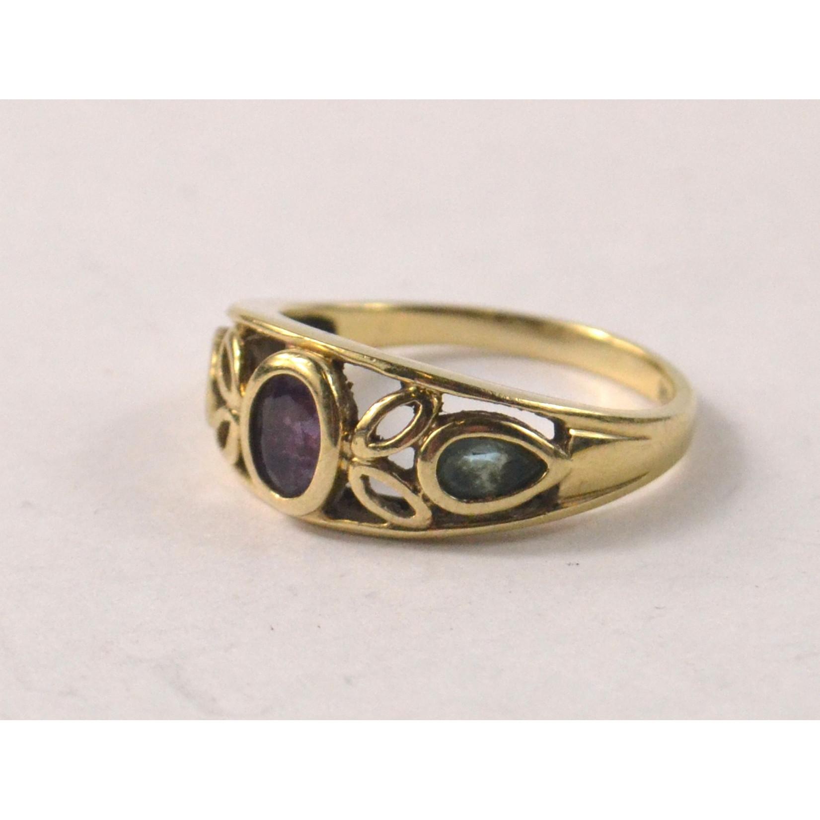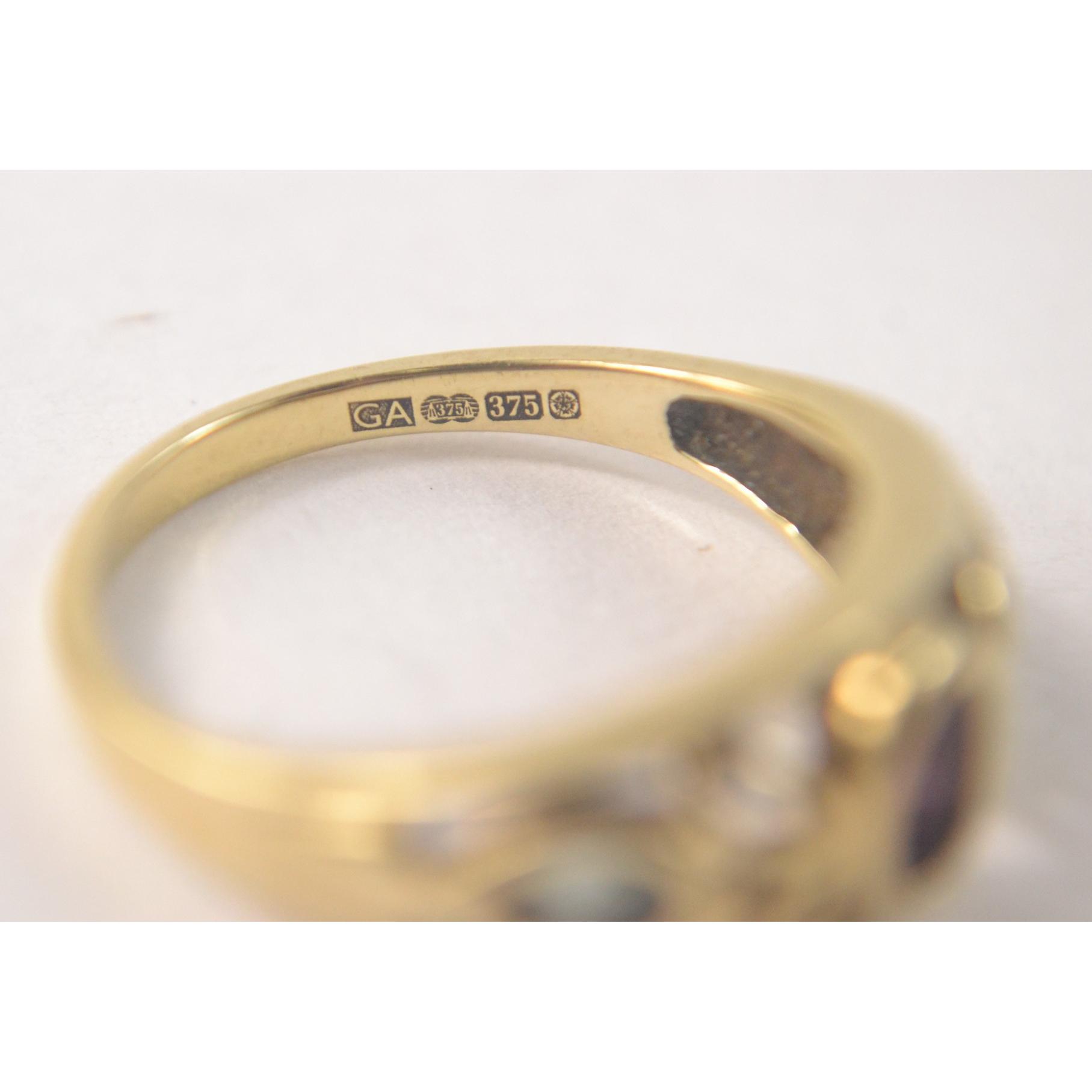 375 stamped yellow gold ring with red and green coloured stones inset ring size N 2.21g gross weight