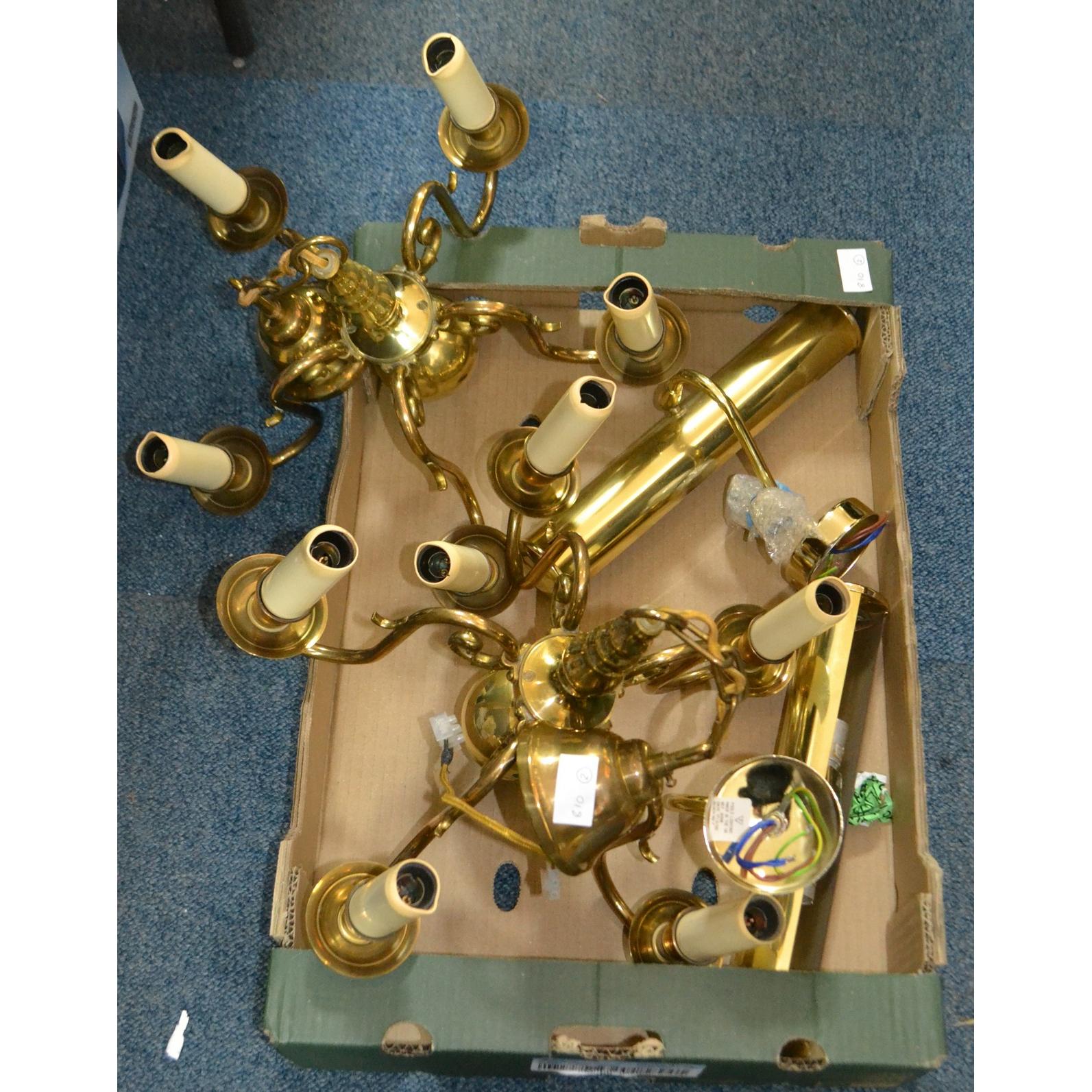 A collection of brass wall/picture lights and electric candle style chandeliers Approx 4 pieces