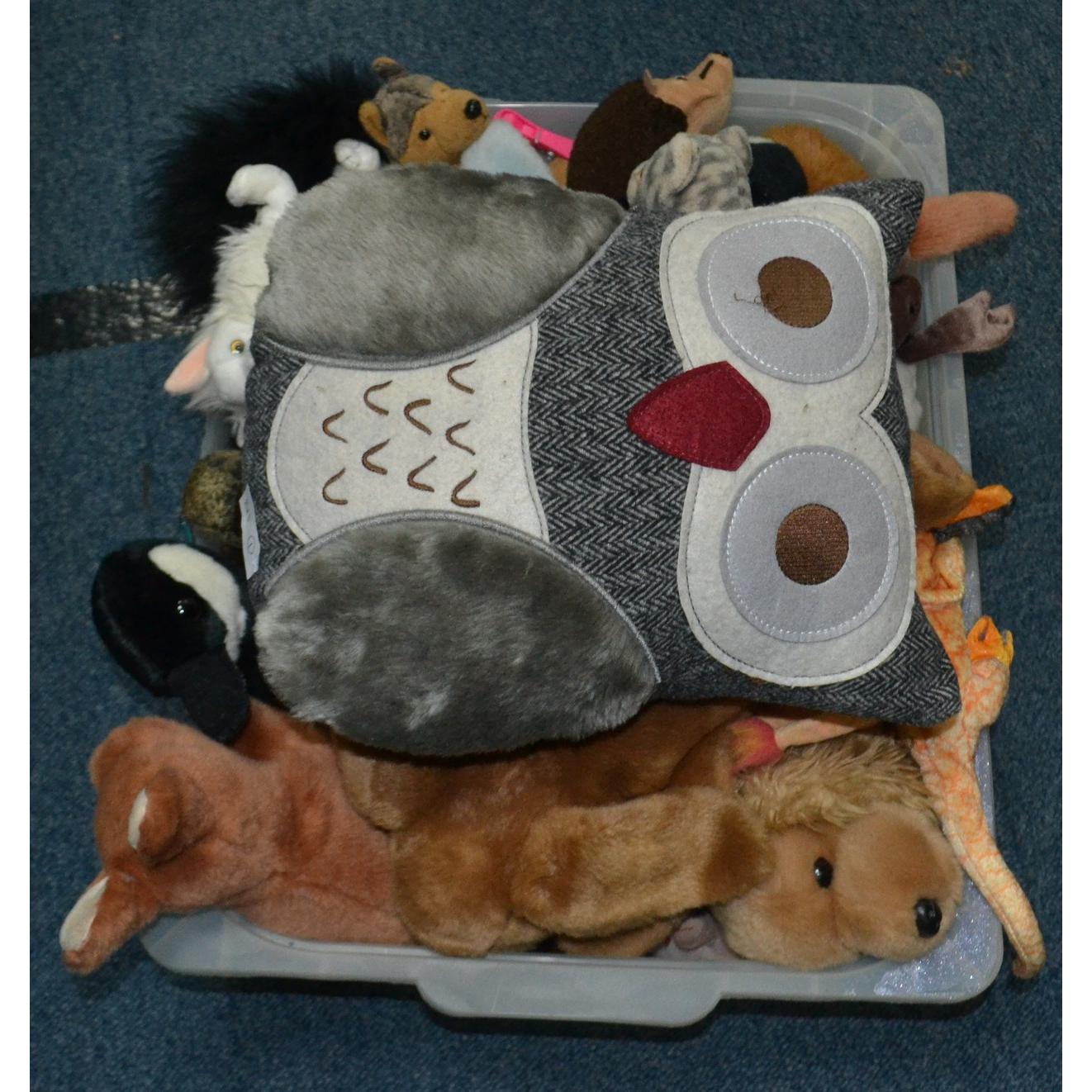 A mixed storage box to include a LARGE selection of BEANIE and Beanie style cuddly toys and a cuddly soft toy owl.
