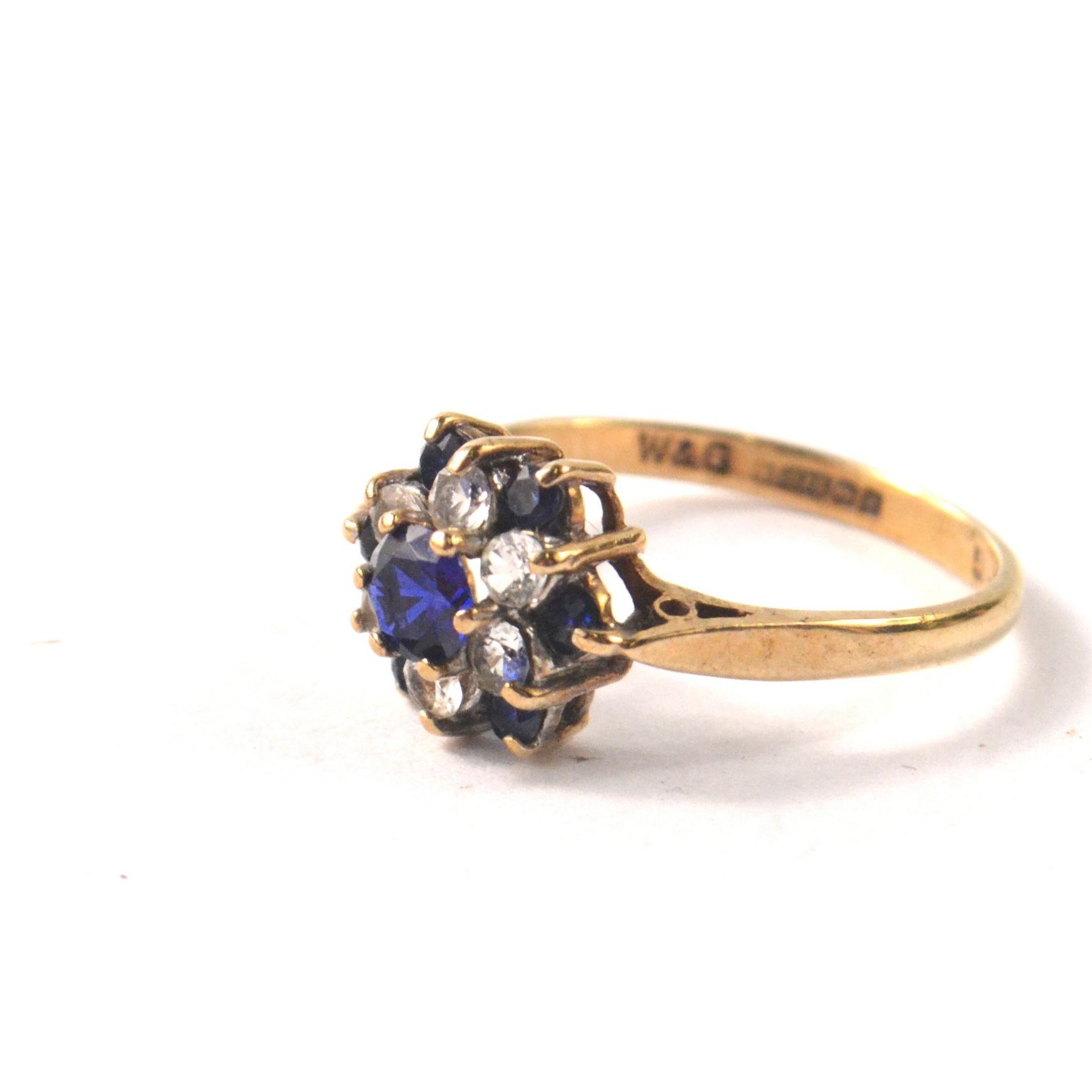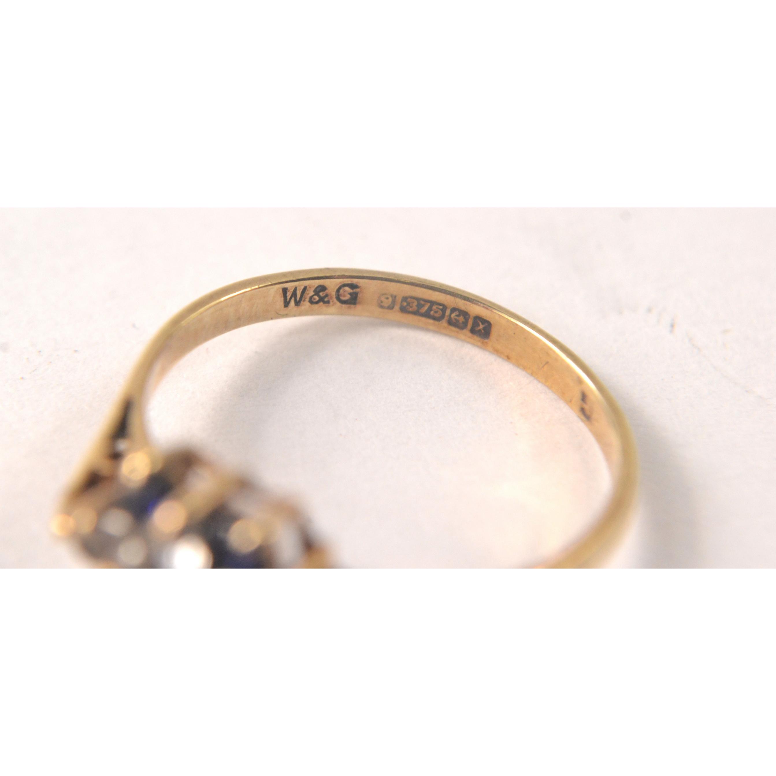 375 Hallmarked yellow gold ring set with blue and white stones in a floral design [ size N ]Gross weight approx 2grm