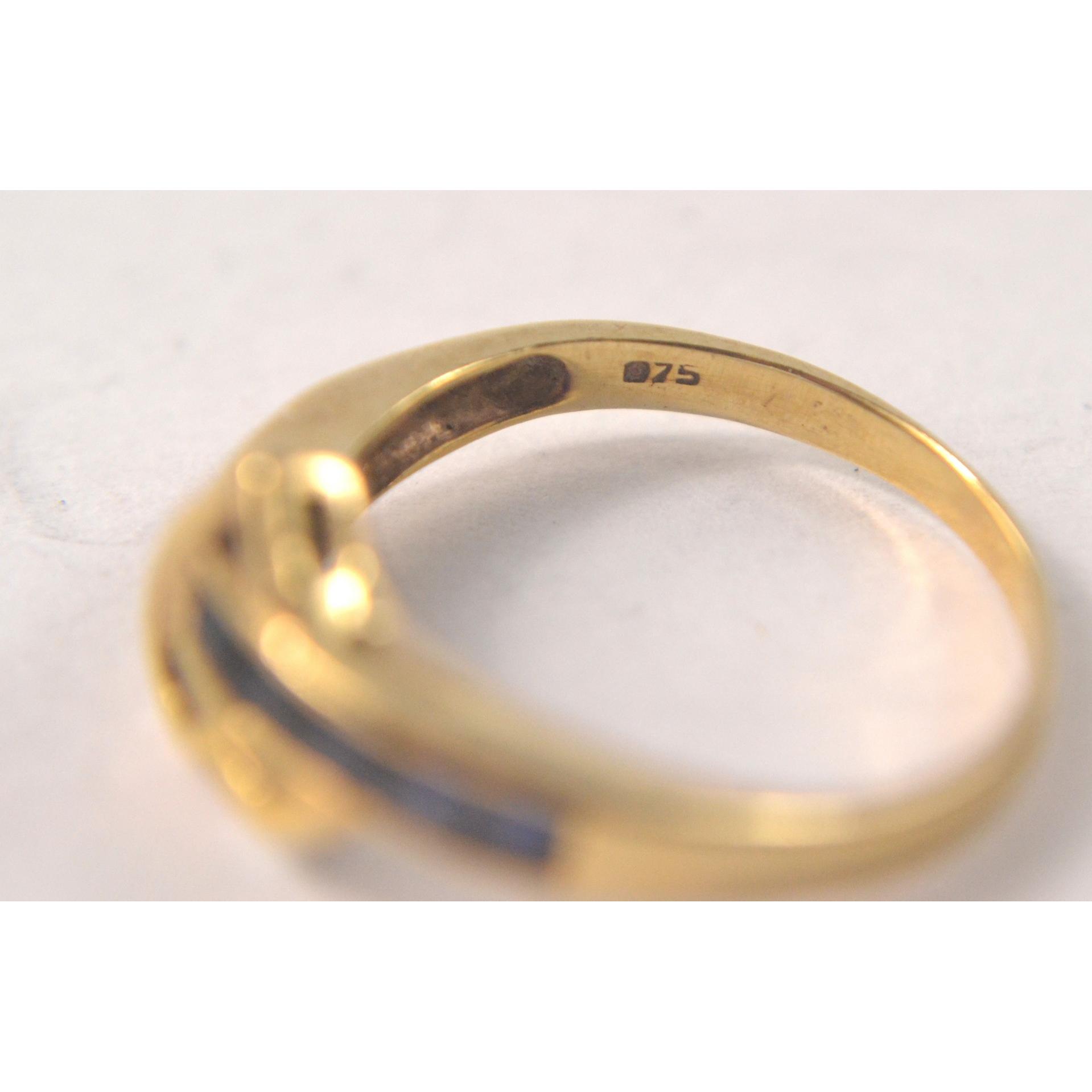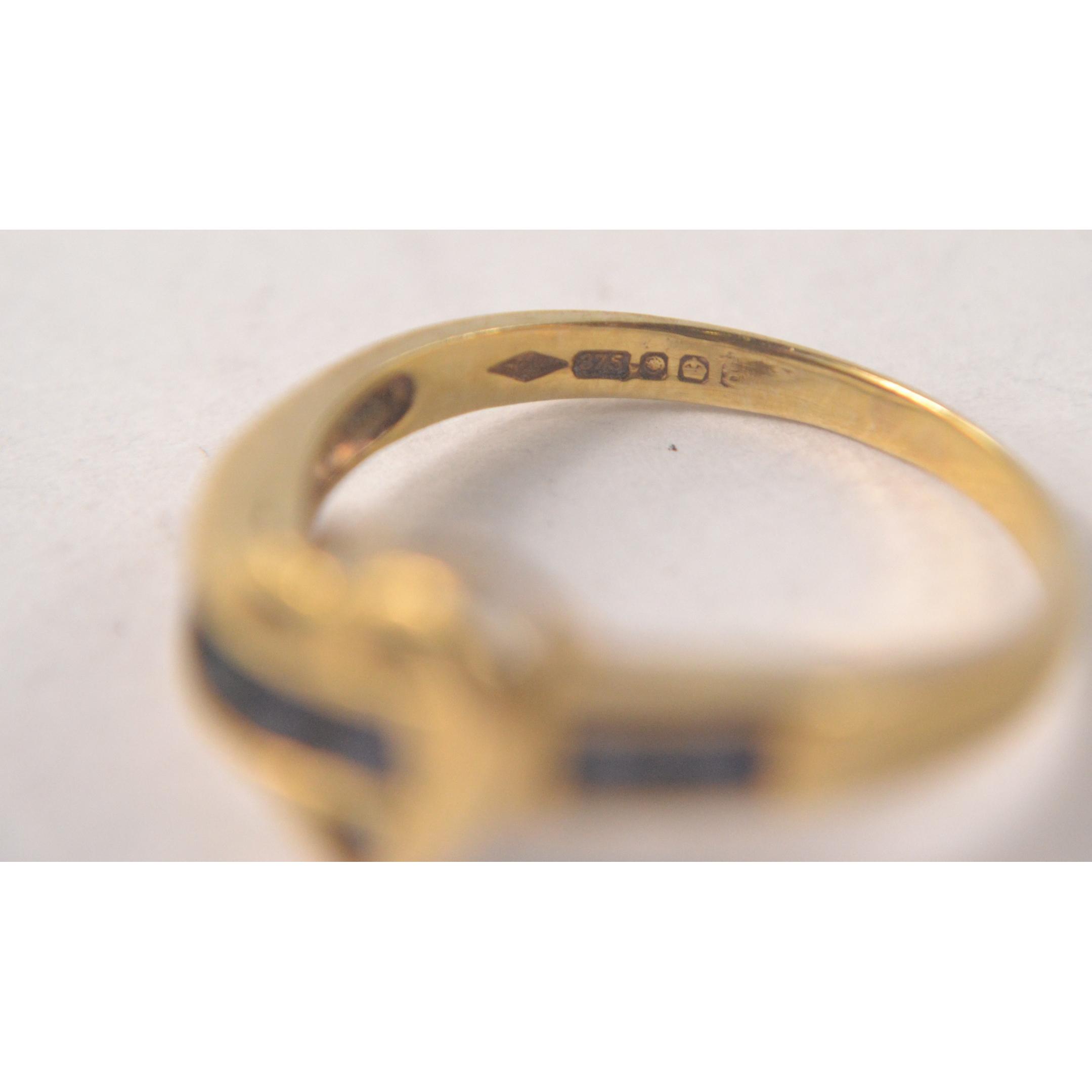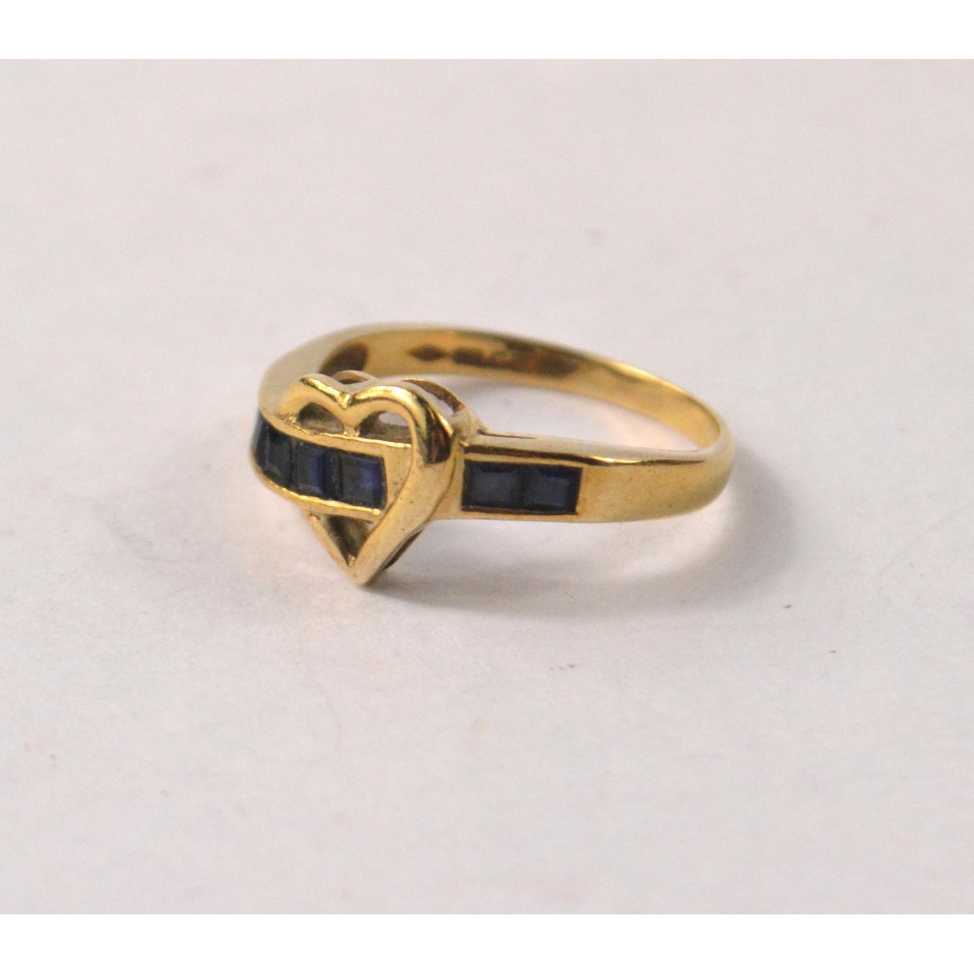 Hallmarked 375 yellow gold ring set with 7 square shaped Sapphires crossing over a open work heart design [ size J ] Gross weight approx 1.7 grm