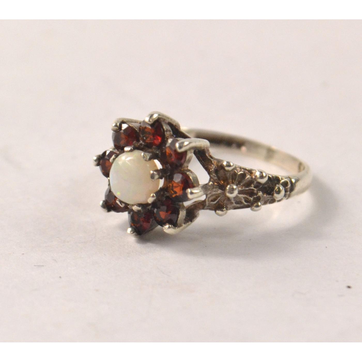 VINTAGE! Opal with red stones in a floral design set in sterling silver. [ size K ] Gross weight approx 2.10 grm