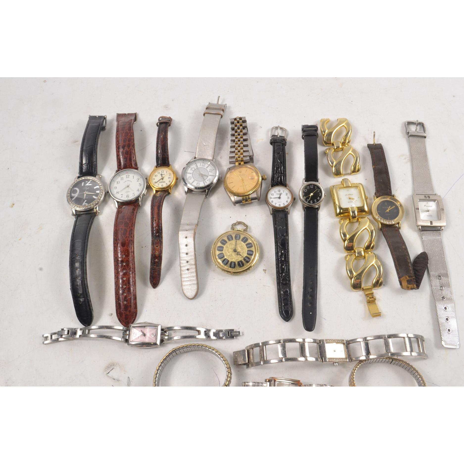 A collection of unisex wrist watches to include a ROLEX STYLE perpetual datejust watch with other names such as Louis Valentin, FOSSIL, LORUS, RAVEL, TIMEX etc etcApprox 16 pieces